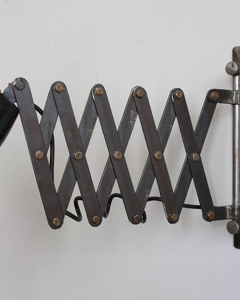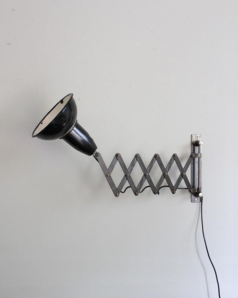 From : France アイアンのシザーランプ。 目を惹くデザインで、インテリアのアクセントに効果的です。 黒いお色とのアイアンのクールな印象がお部屋を雰囲気を 高めます。 アームのシザー部分にはフックなどをかけていただき、 帽子やマフラーなどを吊るしてもご利用いただけます。 もともと工業用ランプとして使用されていたもので、 丈夫さと実用性の高さが特徴的です。