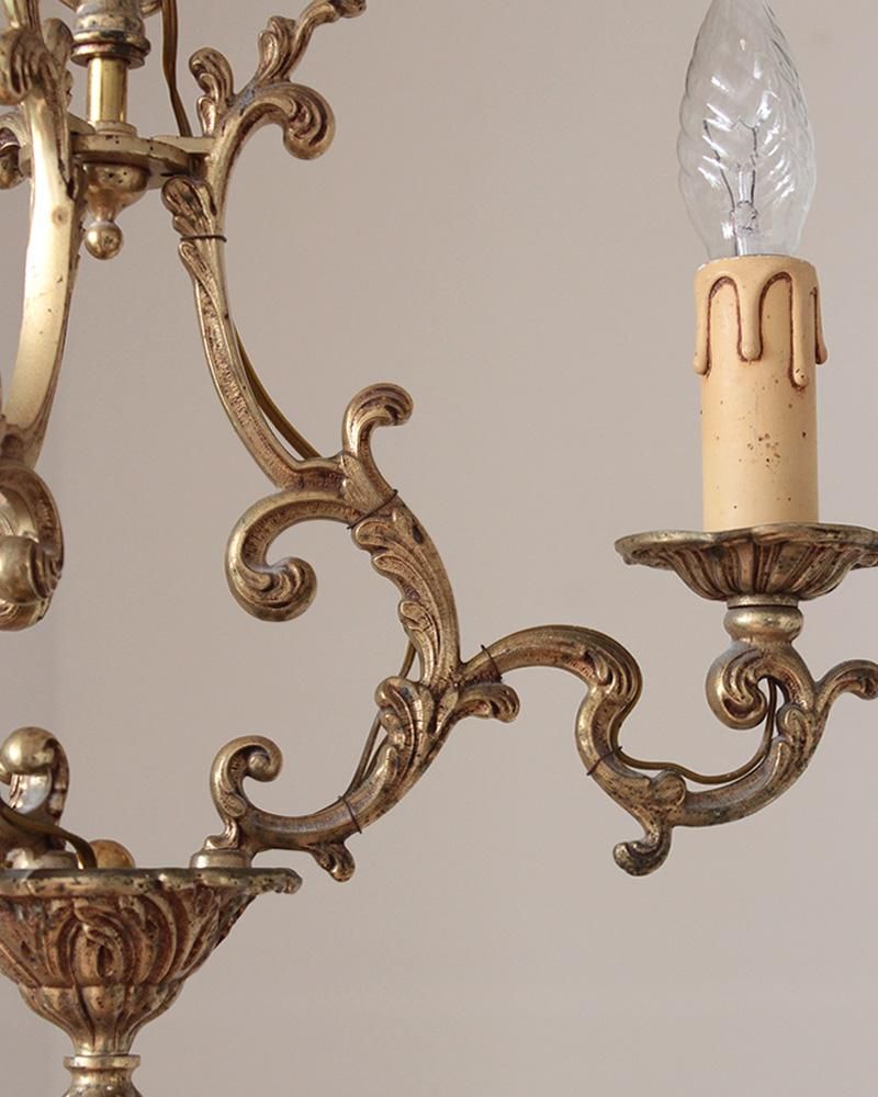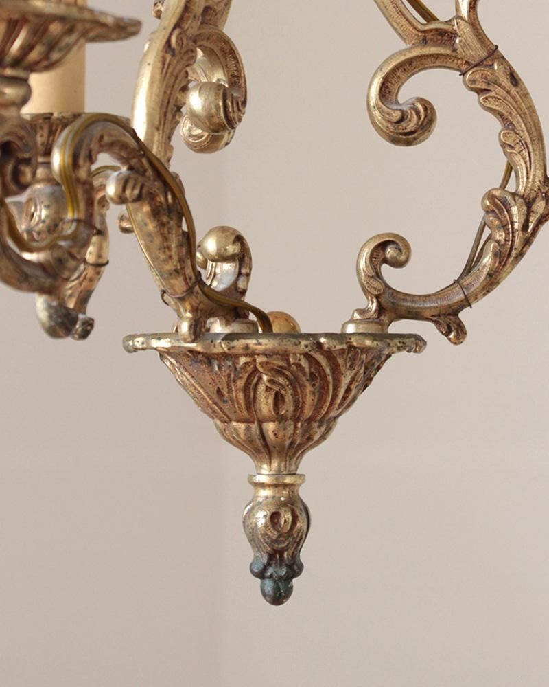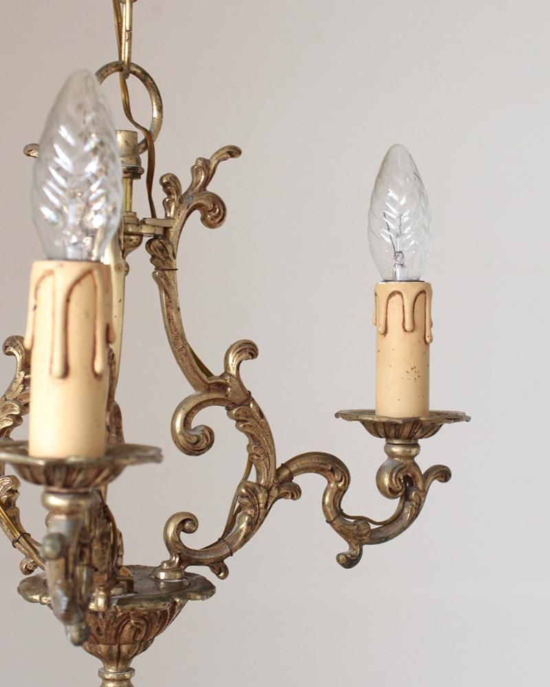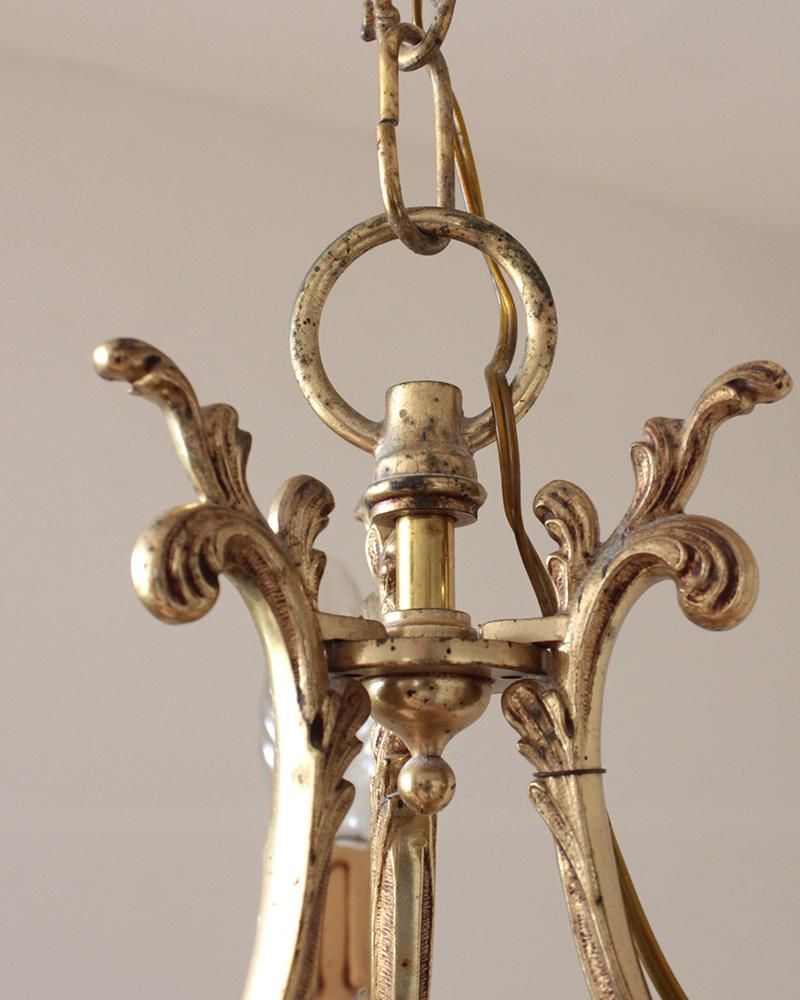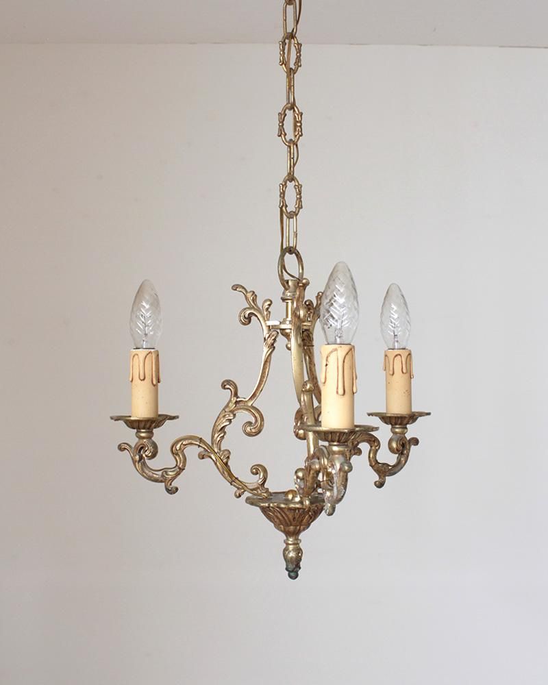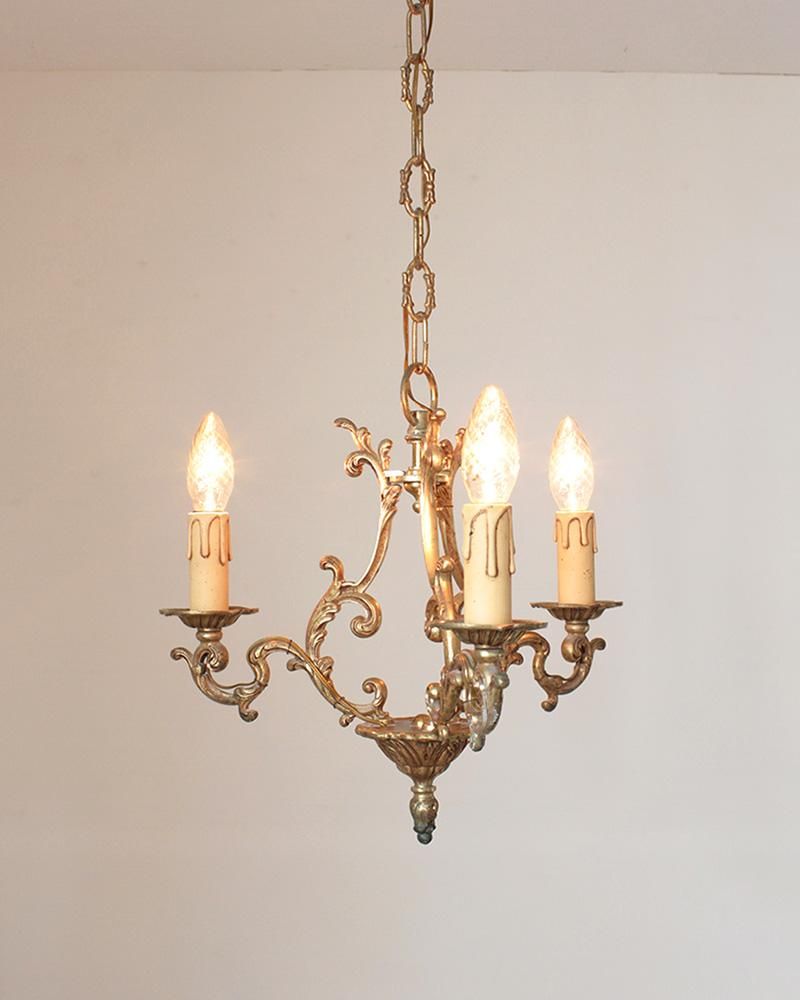 From : France 小ぶりなサイズ感が可愛い3灯シャンデリア。 デコラティブにクリスタルなどの装飾はございませんが、 素朴な雰囲気は一切なく、こじんまりと程よい存在感を 漂わせます。 経年変化によるブロンズゴールドの色合いは、 落ち着きのある大人な輝きをみせ、真鍮ならではの 素材感がお部屋をエレガントな空気で包み込みます。 アトリエや一人暮らしのお部屋にもお勧めです。