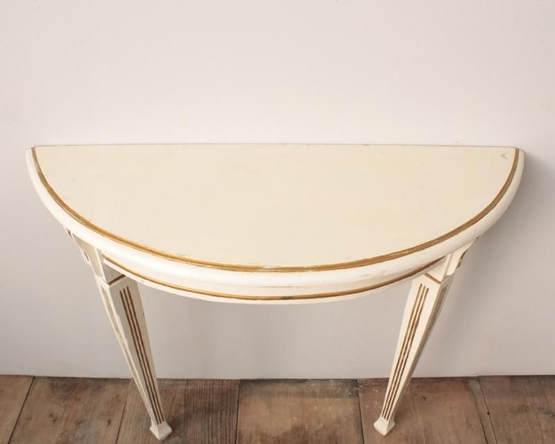 From : France ホワイトペイントにゴールドの装飾が エレガントな印象を感じるコンソールテーブルです。 シンプルな彫刻が施されたスラッと伸びた脚が 上品な佇まい。 コンパクトなサイズなので、花瓶や照明などを飾るの サイドテーブルとしてお勧めです。 こちらは、本体を壁に固定してお使いいただくタイプとなります。