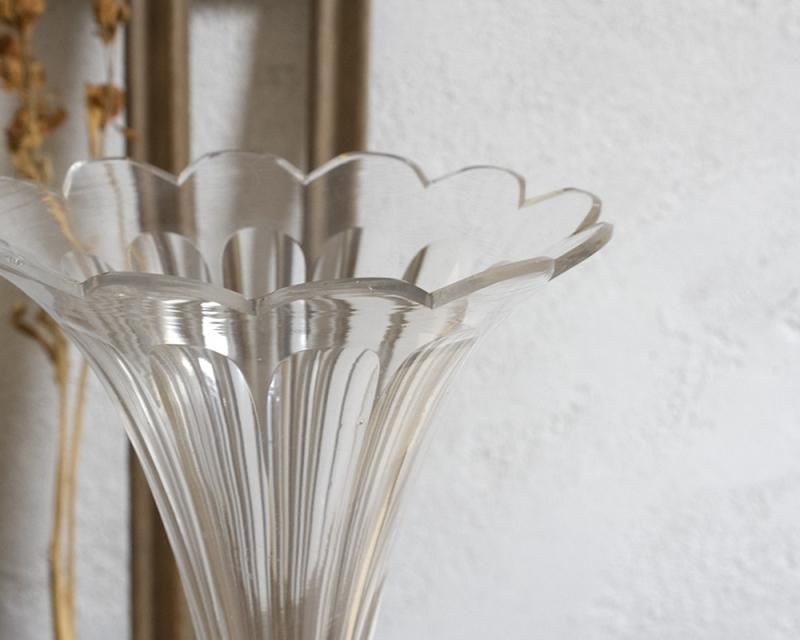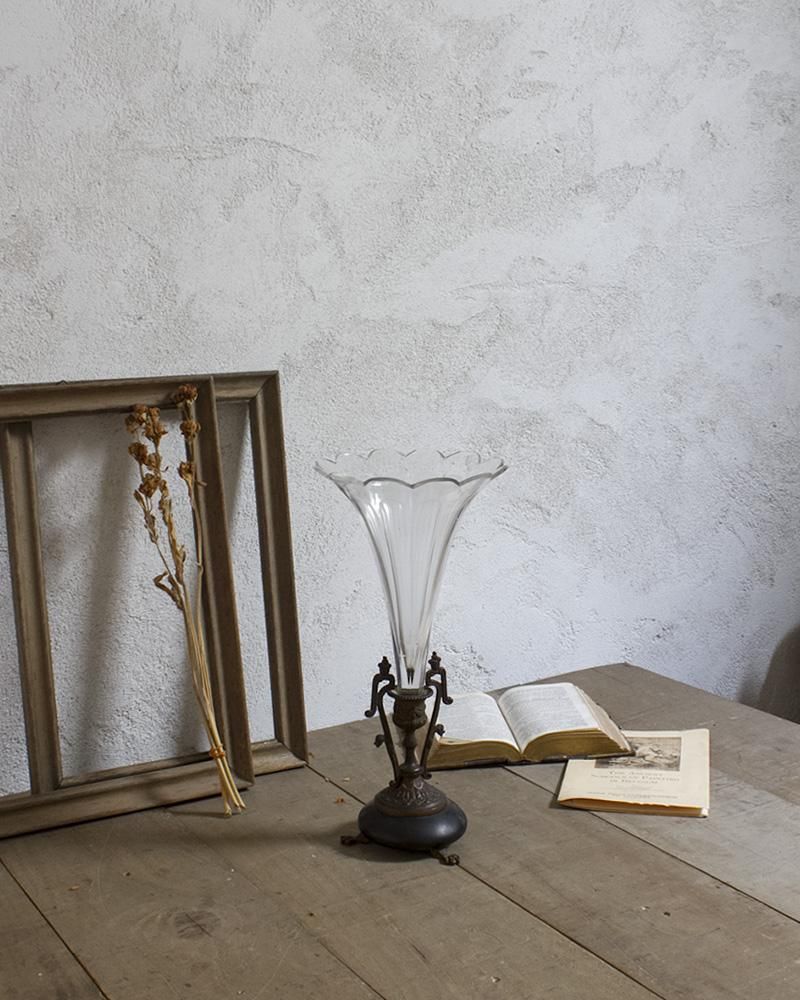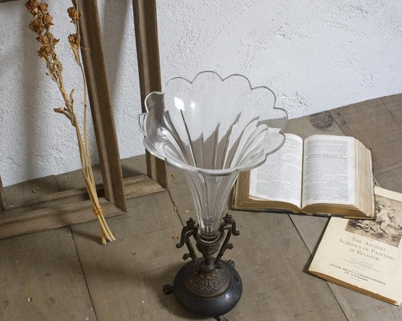 From : France 真鍮製のデコラティブなデザインのベースに 百合の花が咲いたようなガラスのシルエットが美しい フラワーベースです。 ゴージャス過ぎないにもかかわらず、重厚感を感じる フラワーベースはそのままディスプレイしても 充分な存在感があります。 ドライフラワーなどを飾るのはもちろん、 真鍮製の重みでベースがしっかりと安定しておりますので 水を入れて生花を生けるのにもお勧めです。