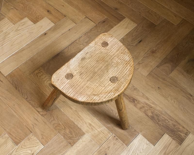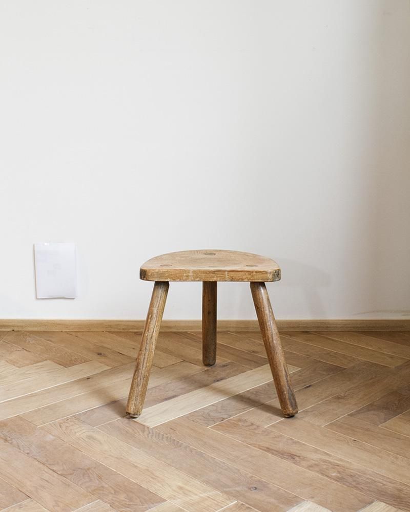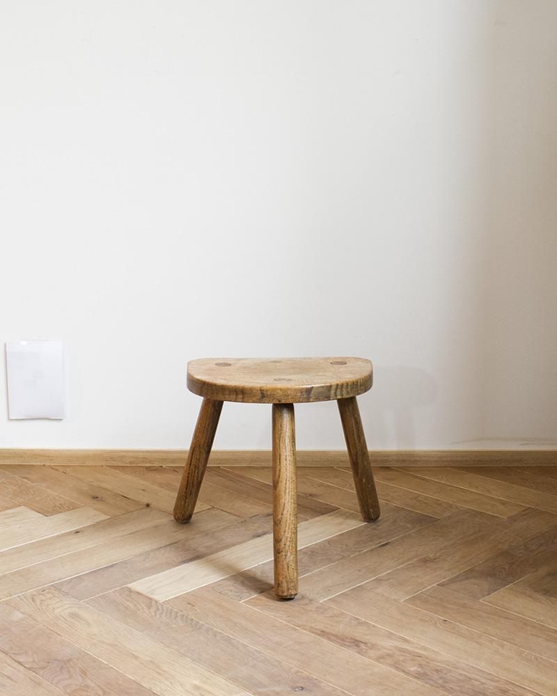 From : France シンプルなデザインのウッドスツール シンプルで小さいサイズながらも経年変化に よって生まれた木の風合いが味わい深く、 半円型の座面に末広がり上に外に伸びた脚が 可愛らしい木製のスツールです。 脚は末広がりのデザインとなっているので 安定感もあり、ちょっとした腰掛け用や サイドテーブル、ディスプレイ台など 様々な用途でお使いいただけるスツールです。