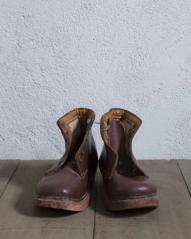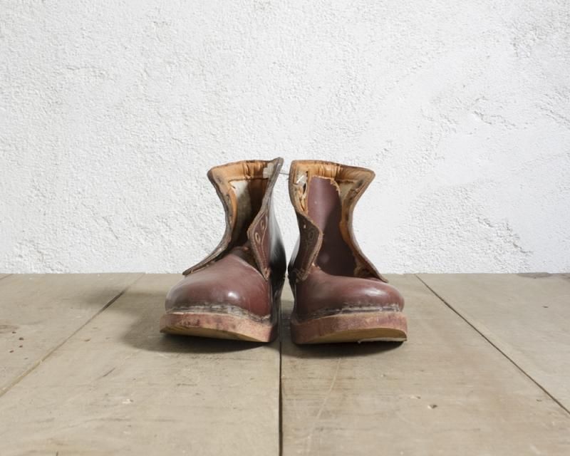 From : France キッズサイズが可愛らしい レザーのレースアップのショートブーツです。 5ホールタイプで靴底の素材は木製となっており 経年変化による革や木の風合いが魅力的で ディスプレイしているだけで雰囲気があります。 靴ひもは付属しておりません。 所々レザー剥げや傷、型崩れなどございます。 予めご了承くださいませ。 ソール全長 : 20.5cm 底幅 : 8cm