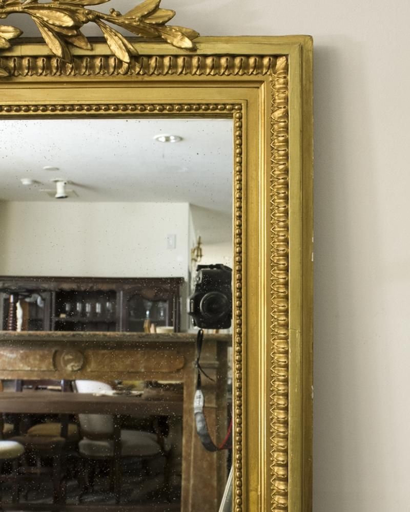From : France デコラティブな彫刻が目を引くデコラティブミラー ゴールドペイントに植物モチーフの繊細で 存在感のある装飾は、ゴージャスながらも気品があります。 また、大きいサイズなので空間を広く見せてくれ より一層、華やかでエレガントな空間を演出してくれます。 ミラー面に経年変化による銀錆や、小傷などがございます。 予めご了承くださいませ。