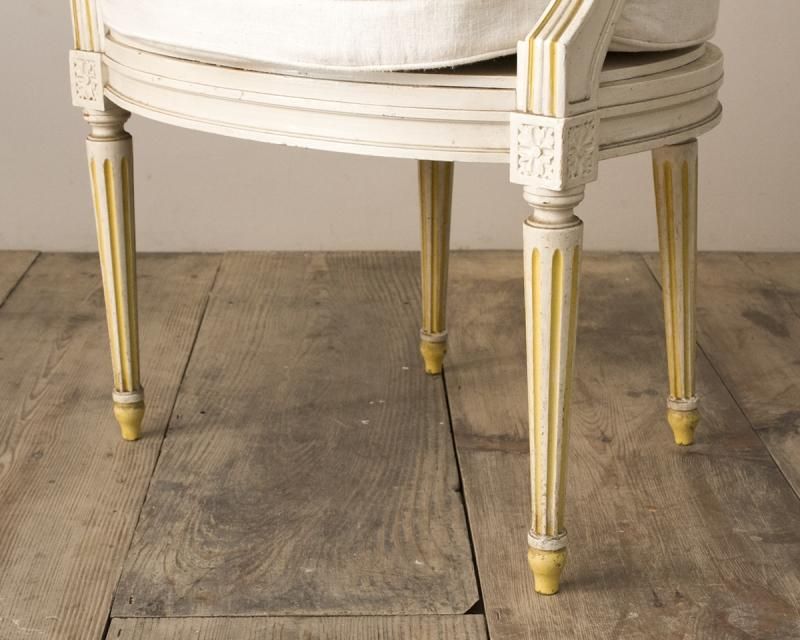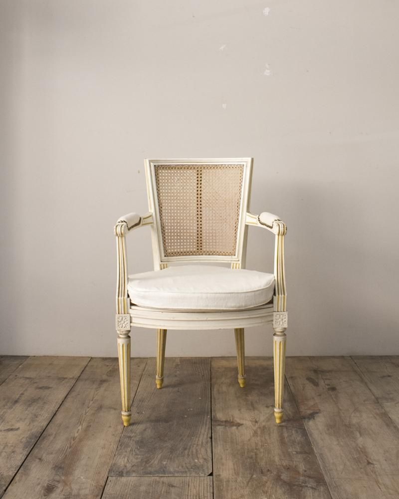 From : France 柔らかなホワイトカラーにイエローのラインが目を惹くアームチェア 背もたれはラタン編みの珍しいデザインで、丸みを帯びた シルエットと相まって、上品で可愛らしい印象を与えてくれ ディスプレイチェアとしても充分な存在感があります。 また、座り心地もよくダイニングチェアやワークチェアなどの 実用使いとしてもおすすめです。 生地は新しいものに張り替え済みです。