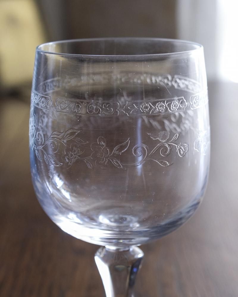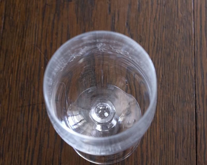 From : France フランスらしい美しいエッチングが施されたワイングラス。 蔦とお花の模様が非常に愛らしい逸品。 手に馴染みやすいスリムなステムには、 6面のパネルカットが施されています。 商品は複数在庫がございます。 ご注文時に必要脚数を設定してご注文くださいませ。 商品はアンティーク品のため使用感やくすみや小傷が ある場合がございます。予めご了承くださいませ。