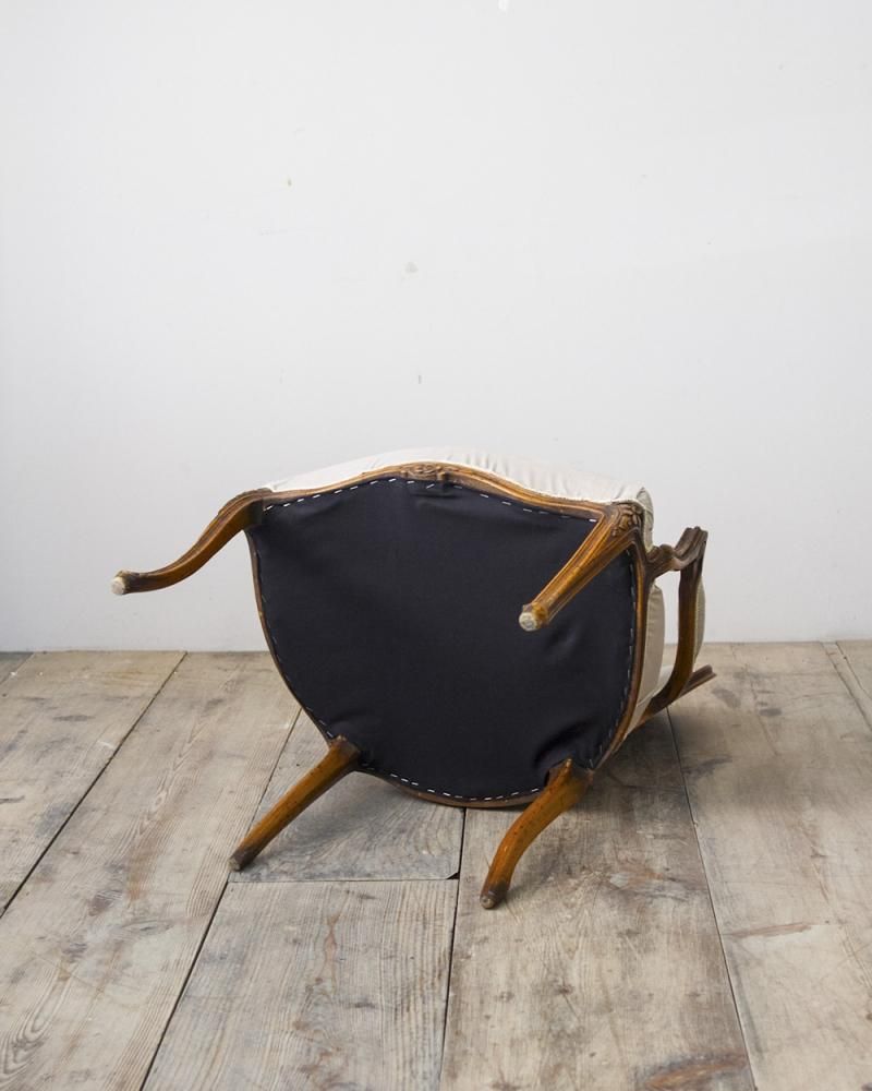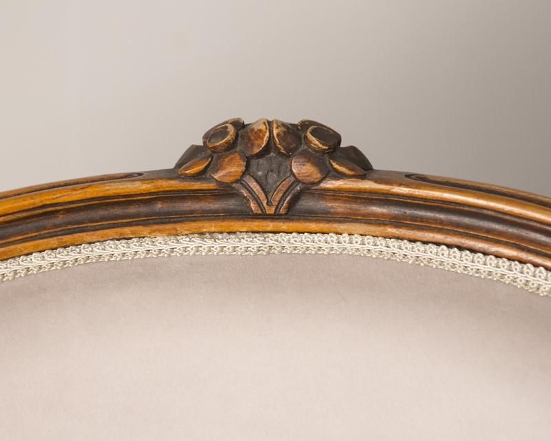 From : France フランスらしい繊細なフォルム、美しい シルエットが印象的なアームチェア 各所にさりげなく施されたお花の彫刻が愛らしく、 赤褐色のフレームにバランス良く合わせられた、 淡いニュアンスカラーの生地が上品さをより表現しています。 可憐さを感じさせる細く繊細なフレームに魅力を感じる逸品です。 生地は入荷後に張り替えております。