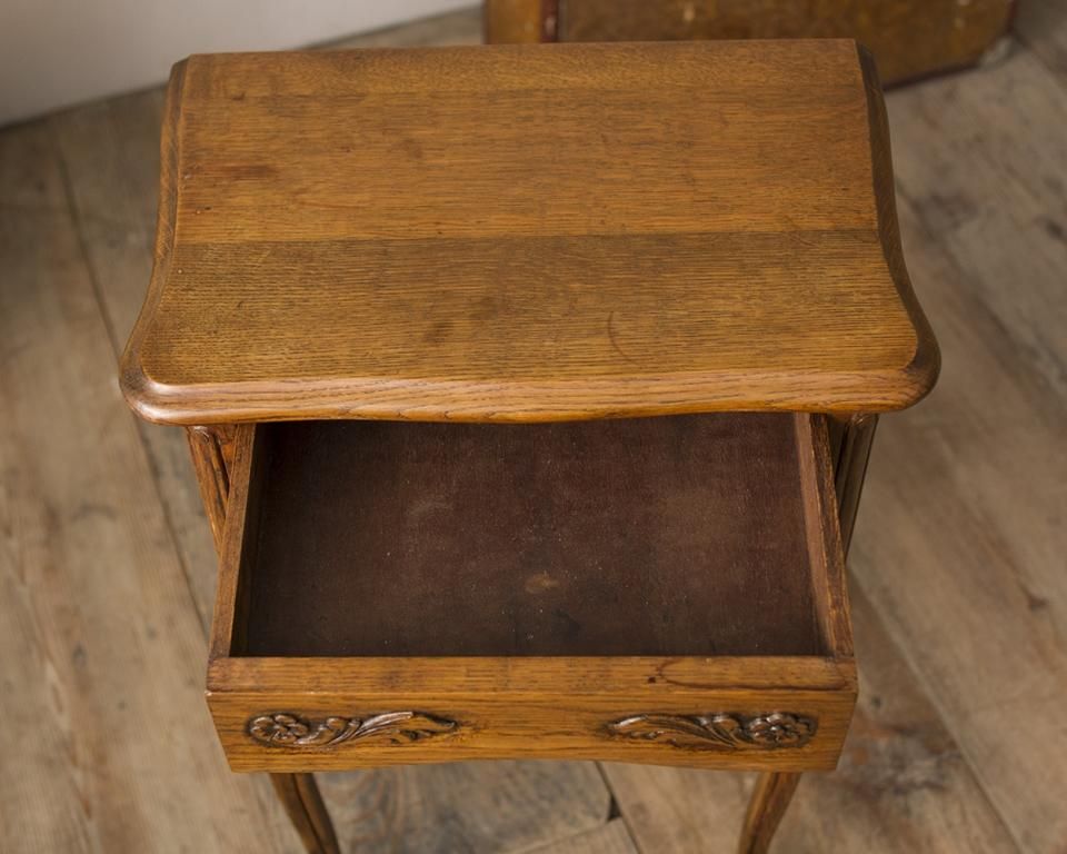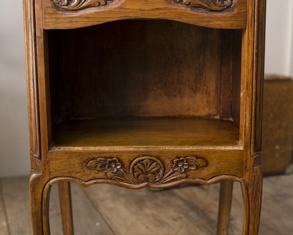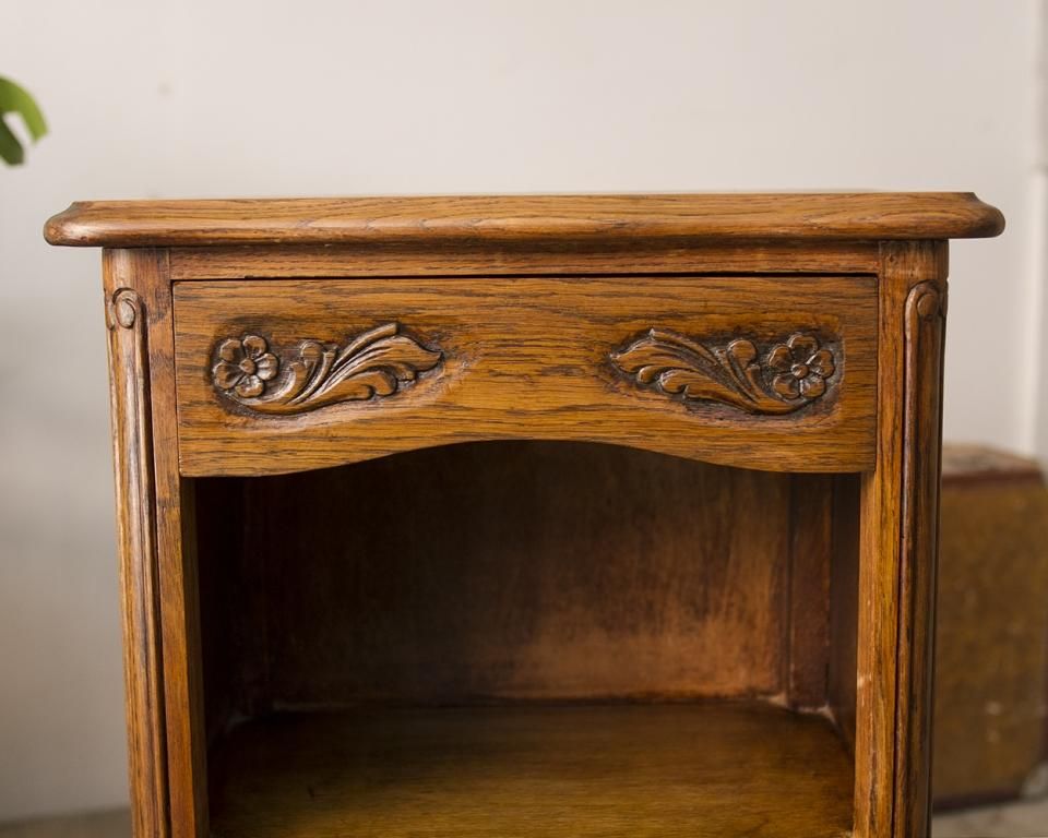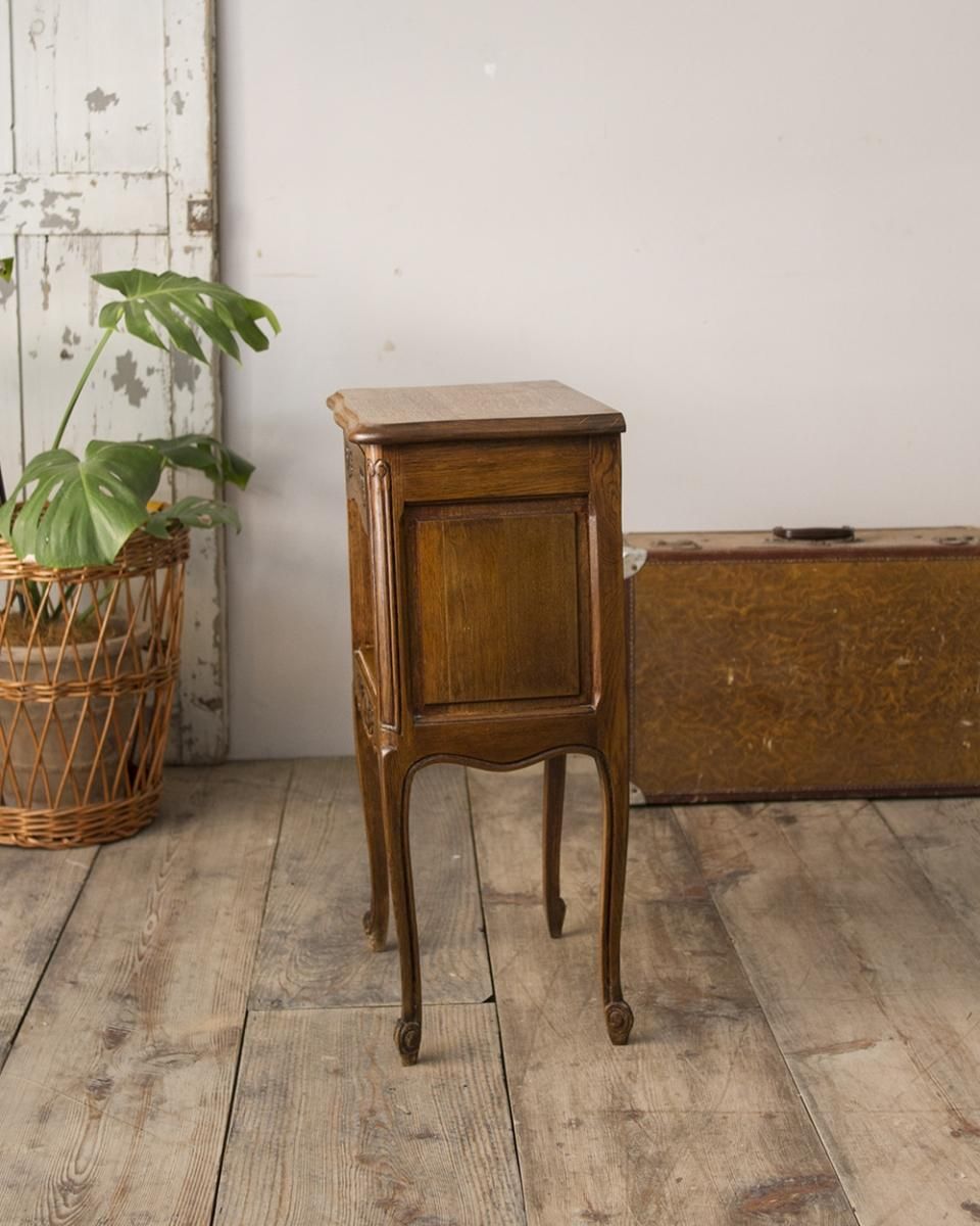 From : France 小ぶりなサイズのナイトテーブル 緩やかなカーブを描いたシルエットに植物の装飾や 猫脚のデザインなど、フランチアンティークの魅力を十分に 感じられるナイトテーブルです。 アンティーク特有の落ち着いた色味に美しい木目が奥床しく エレガントな雰囲気を醸し出してくれます。