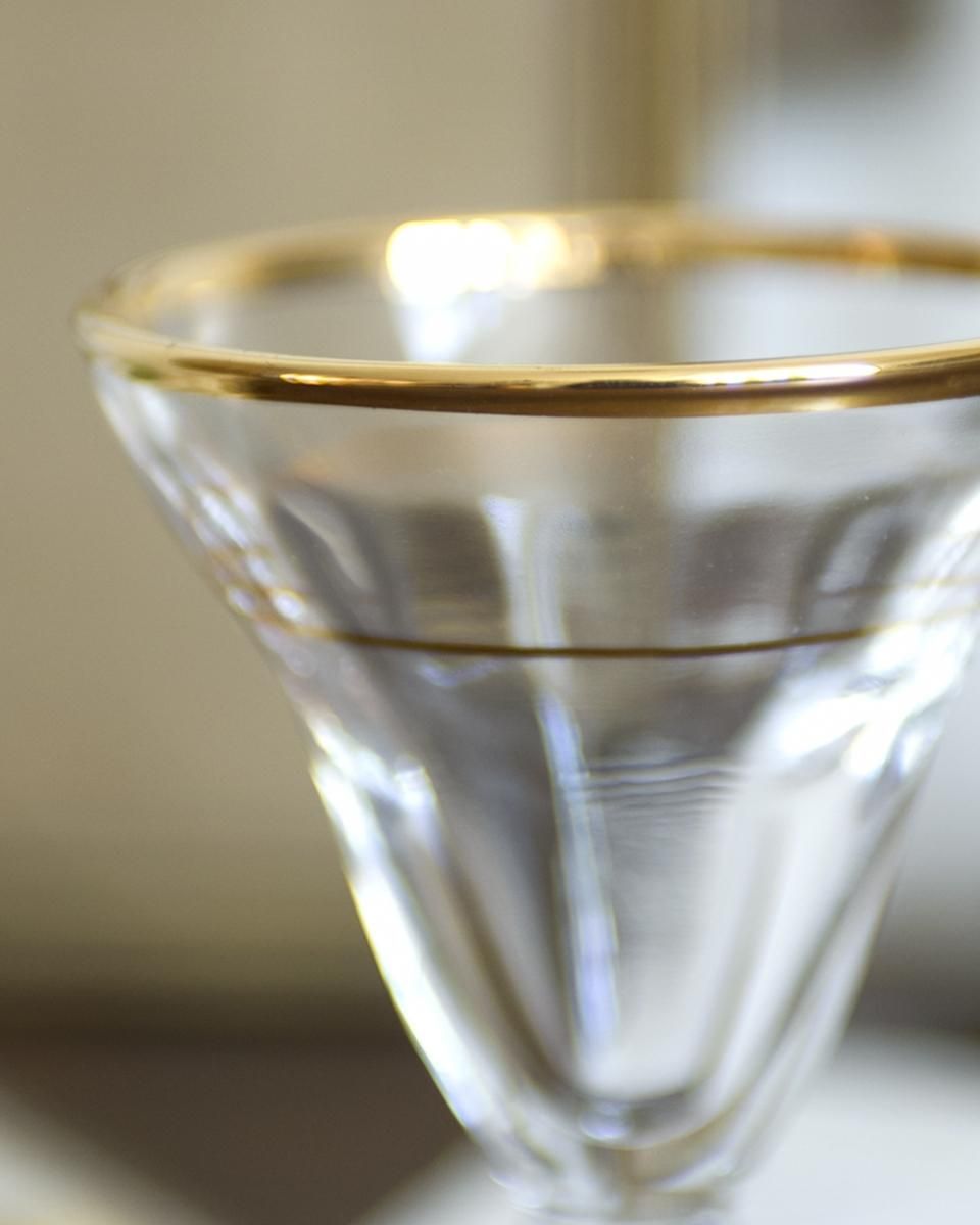 From : France フランスよりたくさん届いた愛らしい シルエットのグラス 円錐型の個性的なデザインが とても印象的で、お水を注ぐだけで ゆらゆらガラスが美しく輝きます。 また縁取りには金彩が施され、日常の食卓を 華やかに彩ります。 どこに置いても絵になりそうなアンティークグラス、 インテリアのオブジェとしてもお勧めです。 グラス容量 : 約 90ml こちらの商品は多数在庫がございます。 複数の購入をご希望される方はお気軽に お問い合わせ下さいませ。