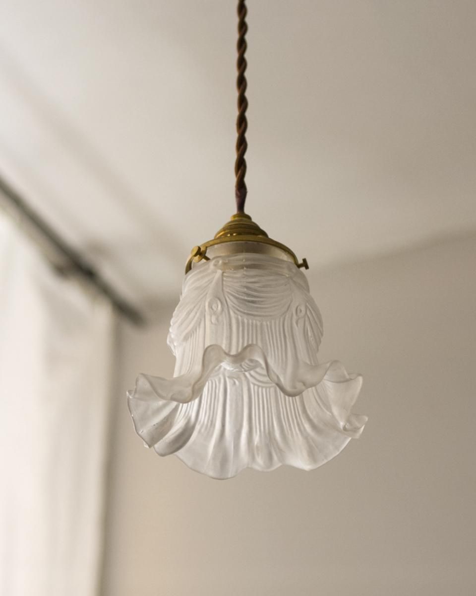 From : France まるでドレスのスカートのように広がるフリルが とても可愛らしいガラスシェードのペンダントライトです。 小ぶりなサイズなので、玄関や廊下・洗面室などの 狭小空間にもとてもお勧めです。 柔らかな明かりを灯し、空間を華やかにしてくれます。 使用電球サイズ:E17口金