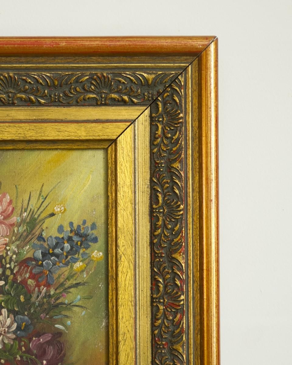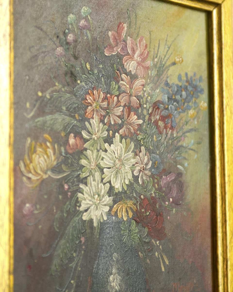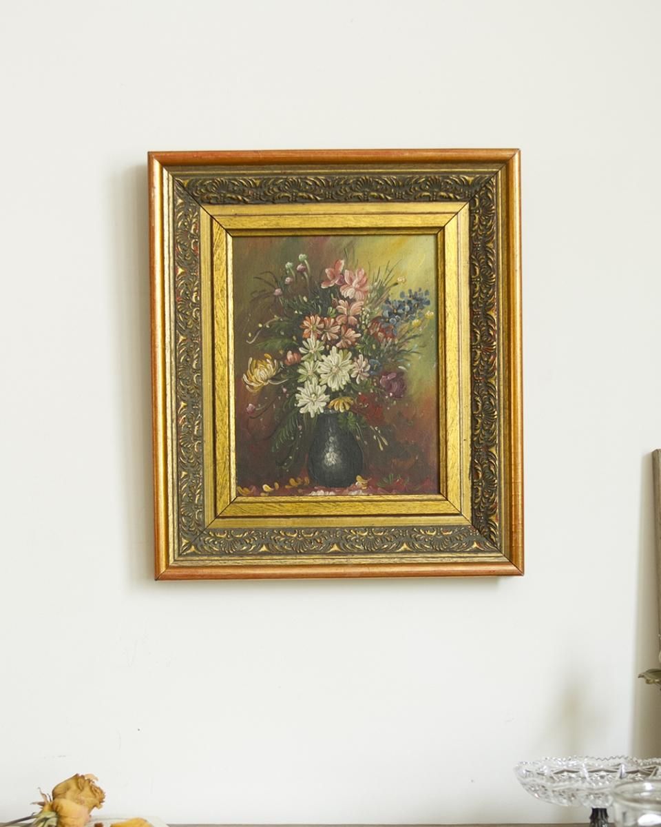 From : France 美しくデコラティブな額装が付いた静物画の油絵です 花瓶に生けられた色とりどりの花束は 落ち着いたトーンで描かれており、 繊細な彫刻が施されたゴールドのフレームと相まって シックでエレガントな雰囲気を醸し出しています。 商品はアンティーク品のため、お写真では伝わり難い 色褪せや小傷などがございます。 追加のお写真をご希望の方はお気軽にお問合せくださいませ。