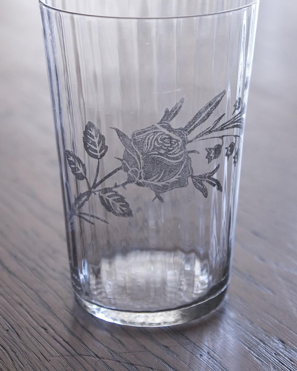 From : France ストライプに加工されたガラスが目を惹くグラスです。 表面にはエレガントな1輪のバラが描かれており シンプルながらも上品で美しい雰囲気が魅力的なグラスです。 商品はアンティーク品のため気泡や使用感 くすみや小傷がある場合がございます。 予めご了承くださいませ。