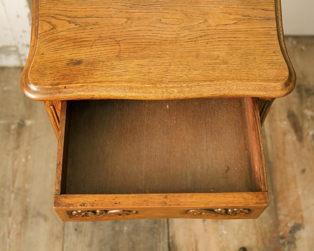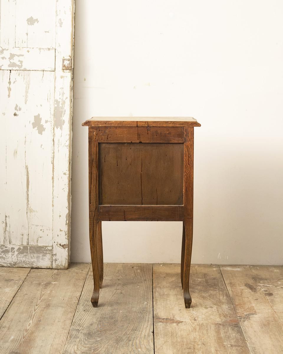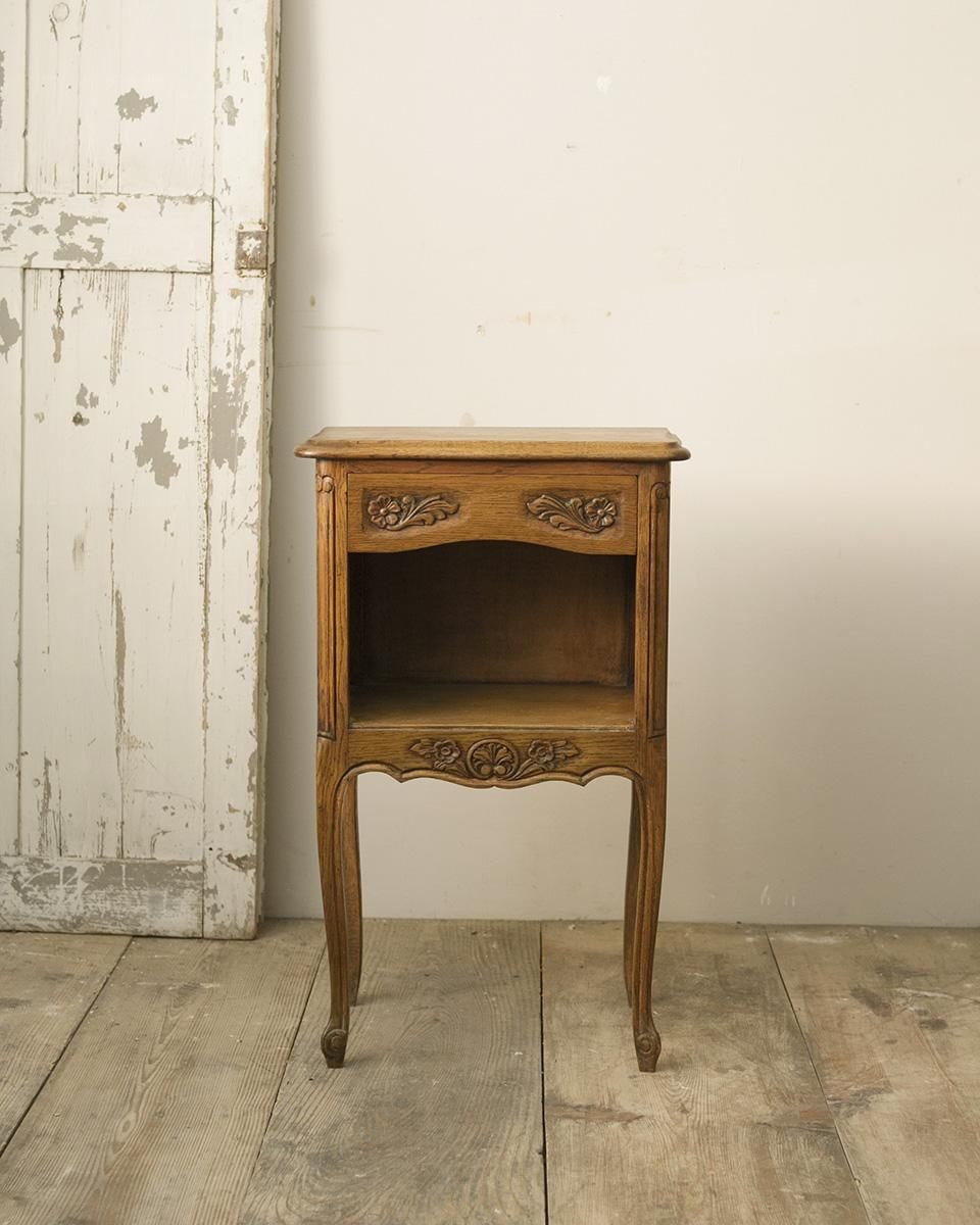 From : France 小ぶりなサイズのナイトテーブル 緩やかなカーブを描いたシルエットに植物の装飾や 猫脚のデザインなど、フランチアンティークの魅力を十分に 感じられるナイトテーブルです。 アンティーク特有の落ち着いた色味に美しい木目が奥ゆかしく エレガントな雰囲気を醸し出してくれます。