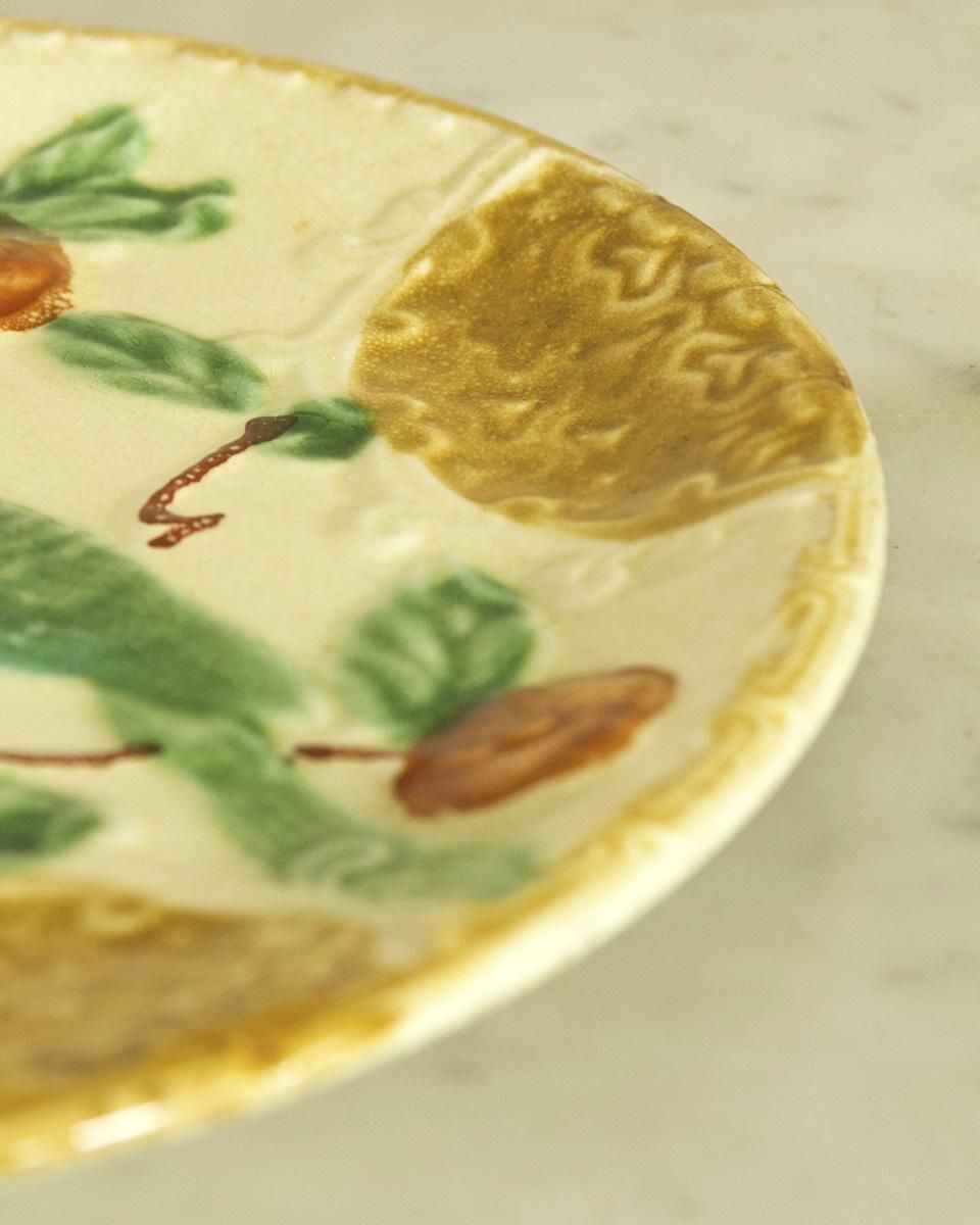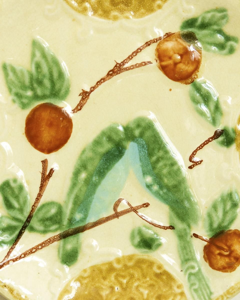 浮彫りに成型した陶器に、不透明な釉薬を用いて