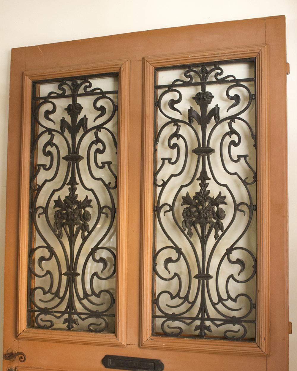 彫刻が施されたペイントアイアンドア。