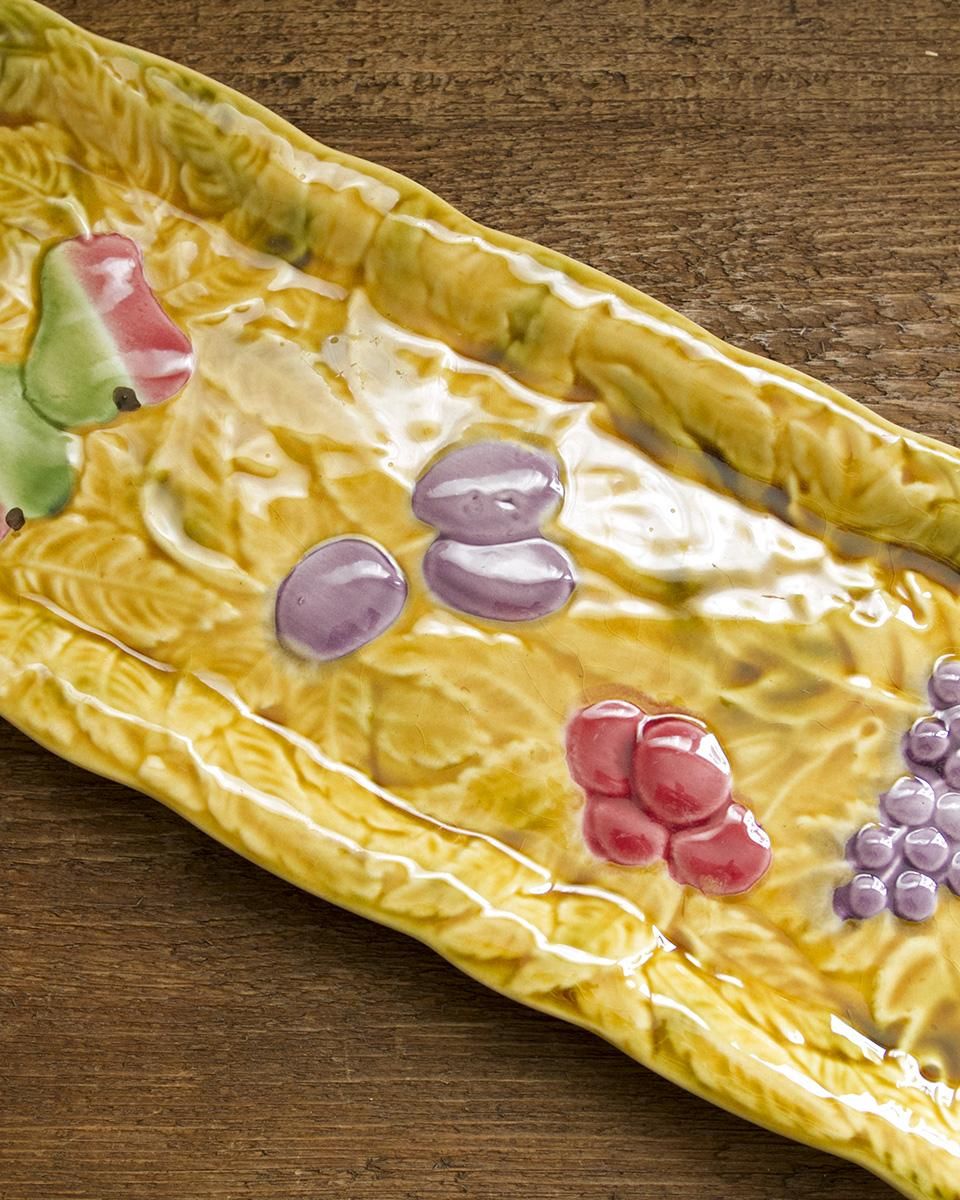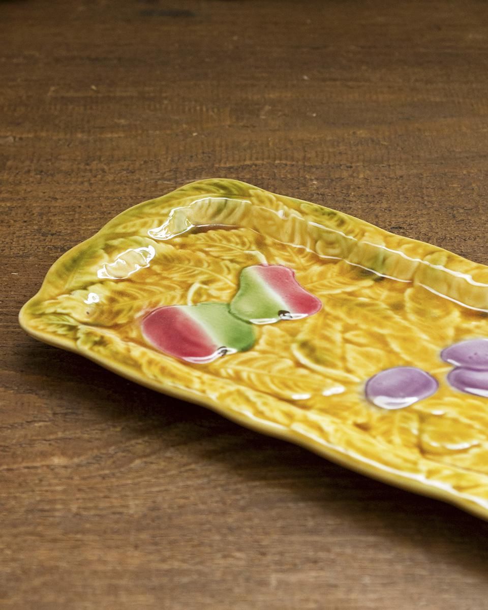 山吹色のリーフの模様をベースに、イチゴやプラム、ブドウなどの
