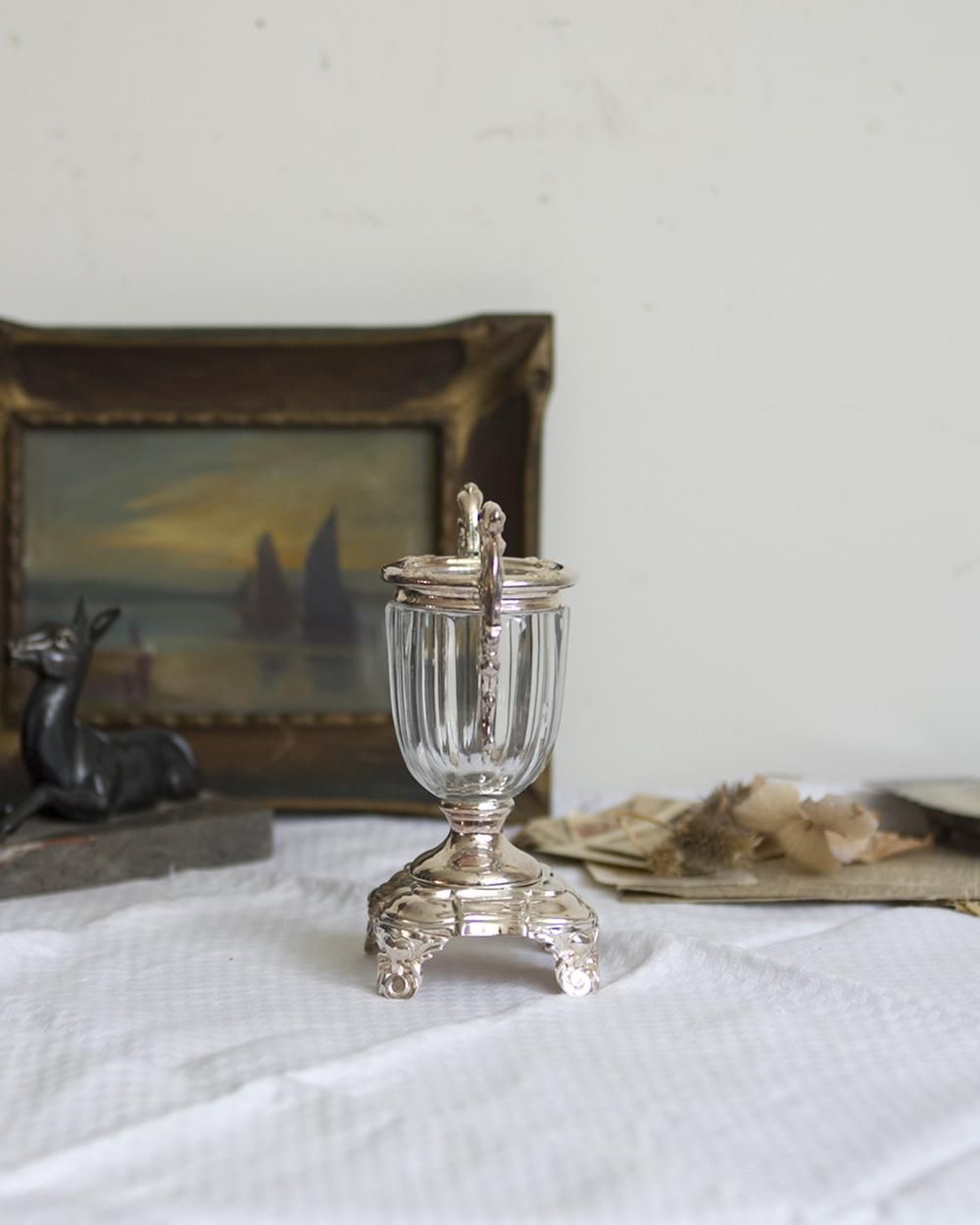 From : France シルバーとガラスの素材のコントラストが美しい 美しいキャンディポット。 上品なフォルムで食卓を華やかな彩るアイテムです。 商品はアンティーク品のため、お写真では伝わり 難い色褪せや小傷などがございます。 追加のお写真をご希望の方はお気軽にお問合せくださいませ。