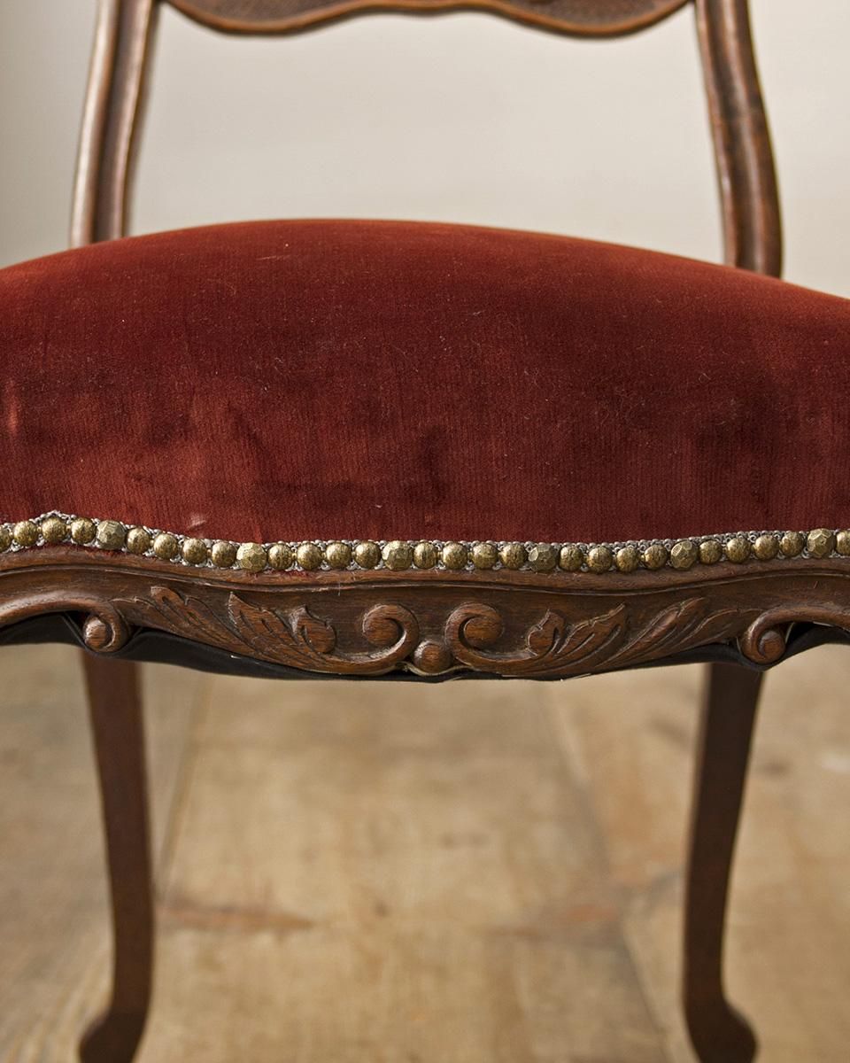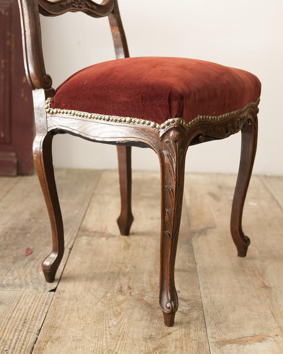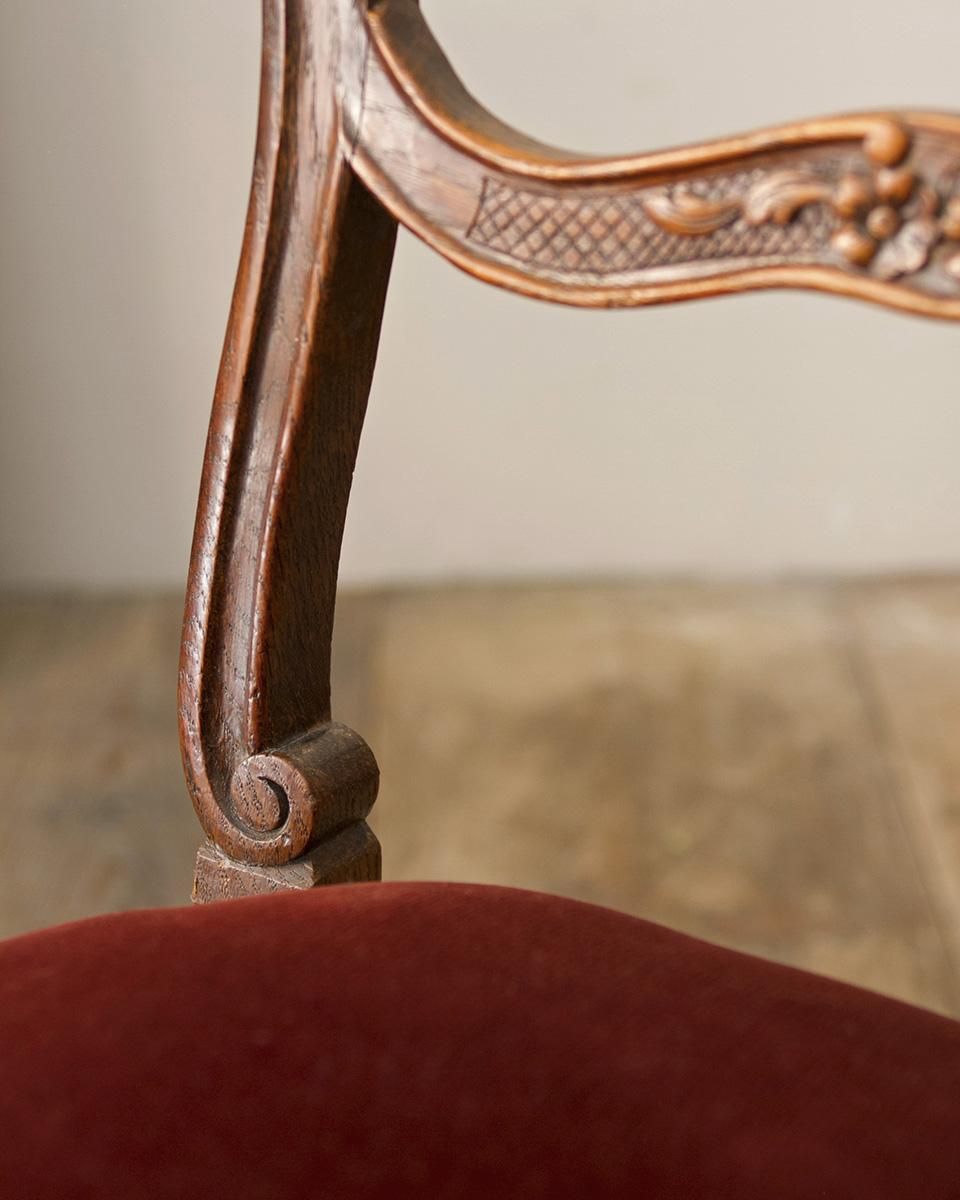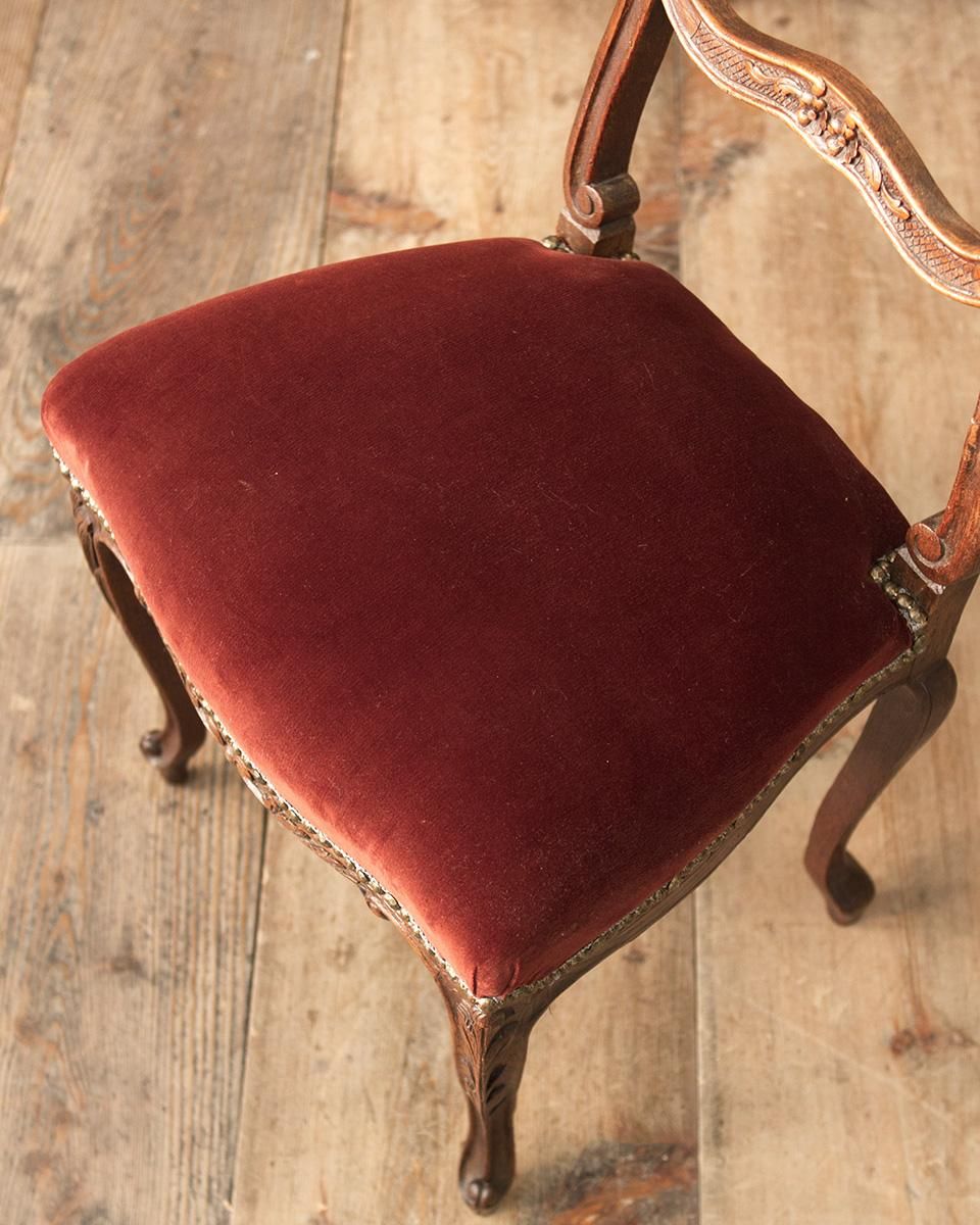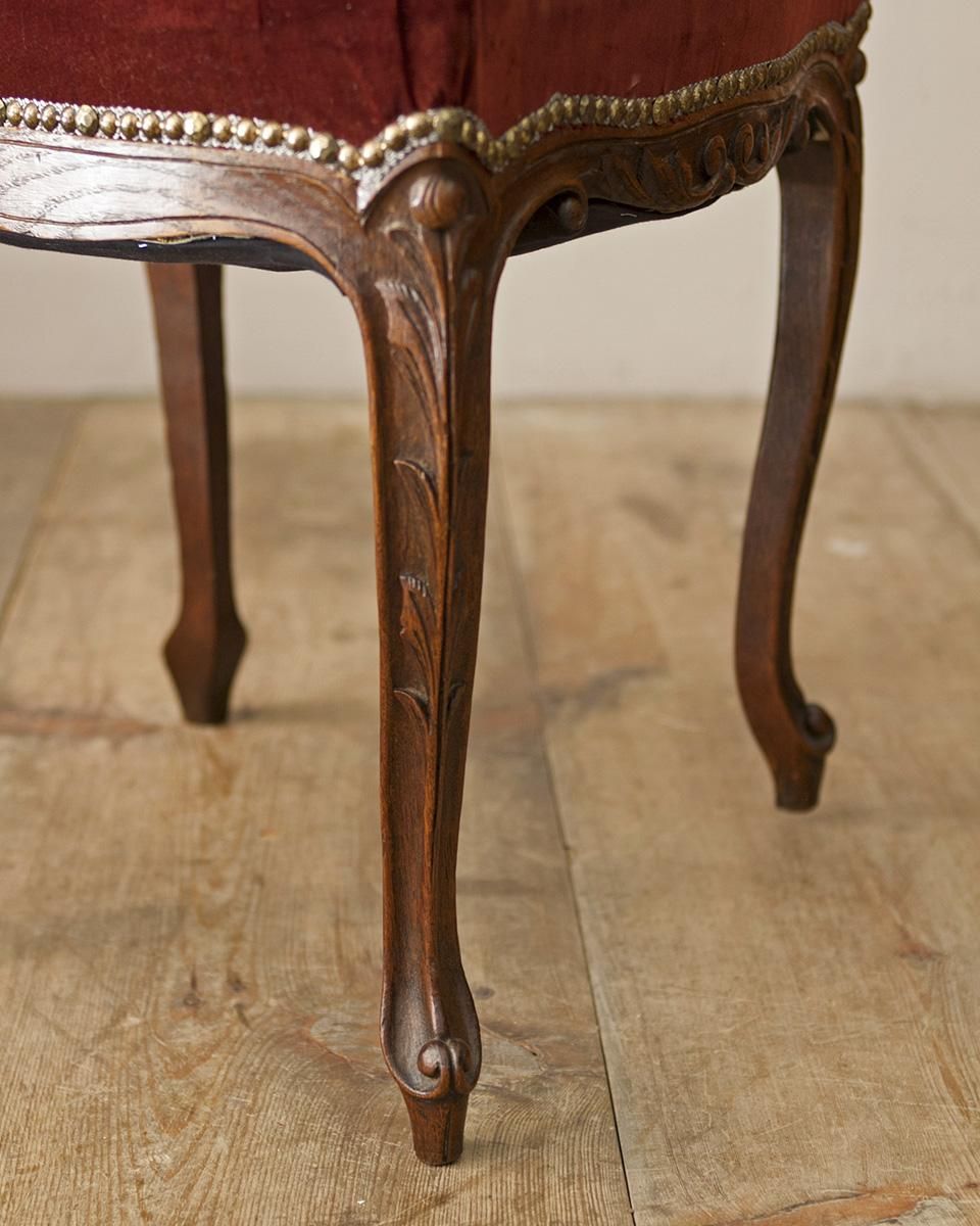 背もたれや脚元に施されたロカイユや花の彫刻が美しく、