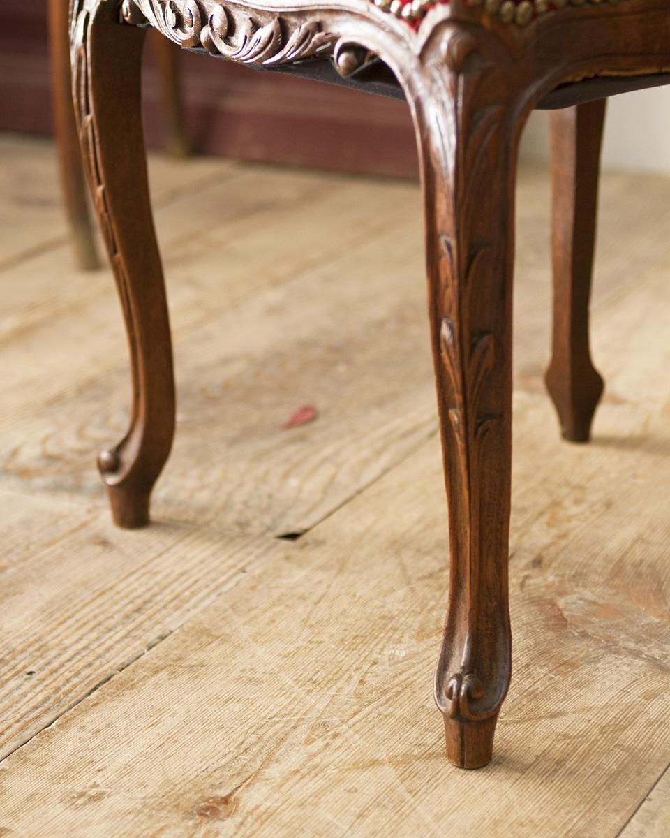 背もたれや脚元に施されたロカイユや花の彫刻が美しく、