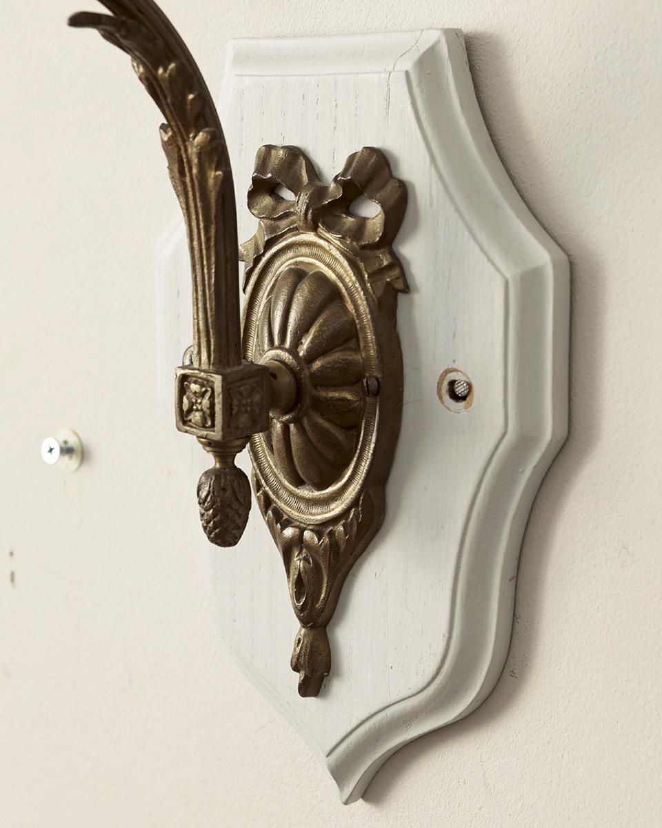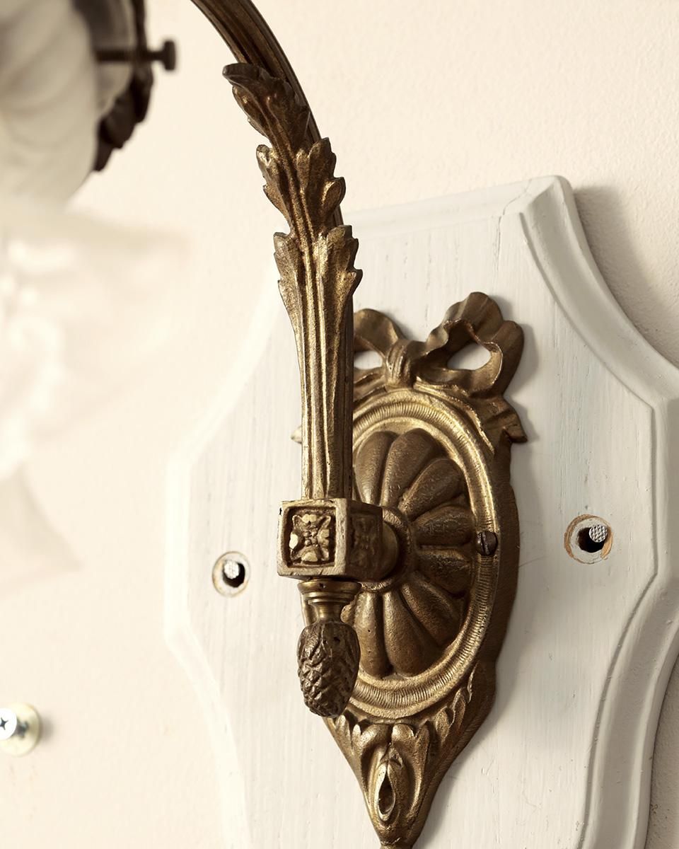 リボンと草花をモチーフとした鈍く輝く真鍮製の装飾に