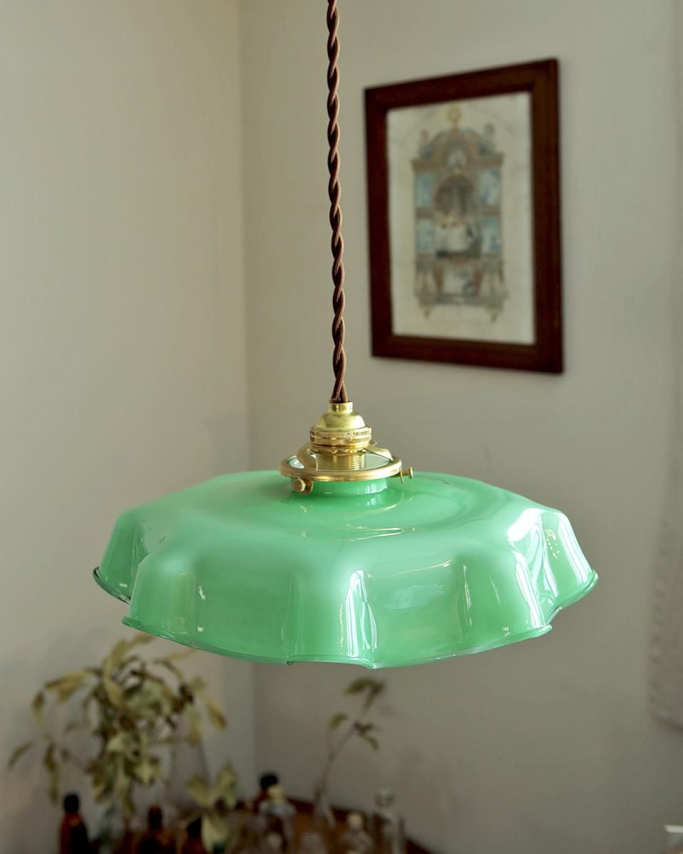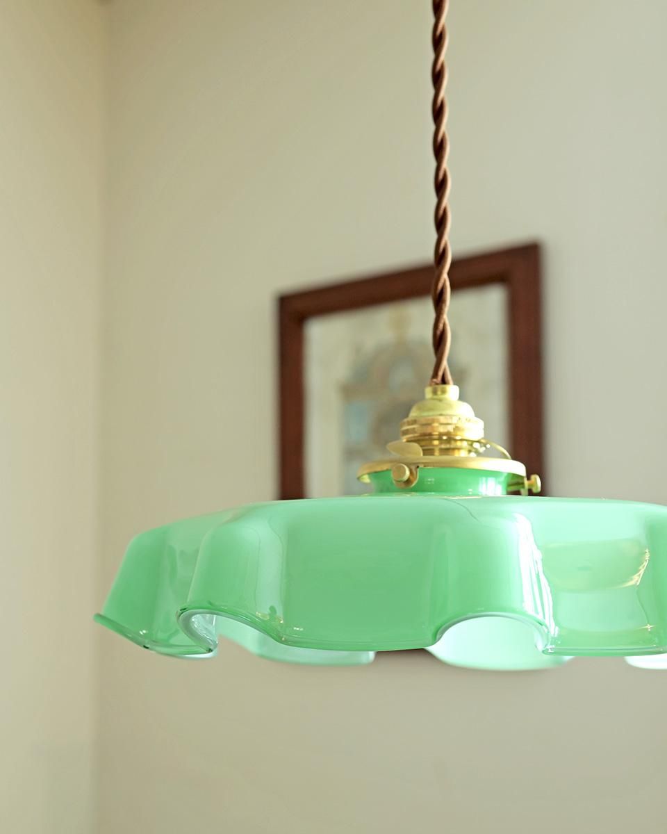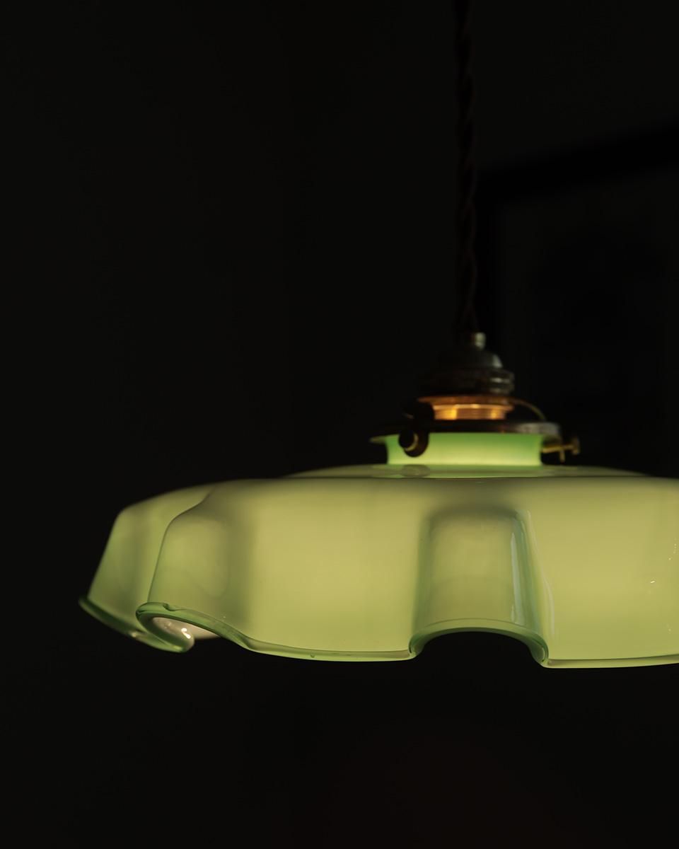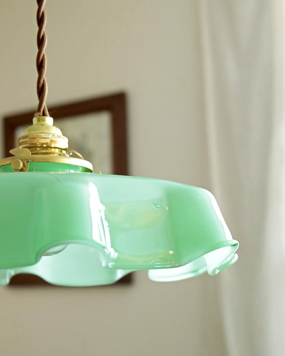 淡いグリーンのミルクガラスが魅力的なシェードランプです。
