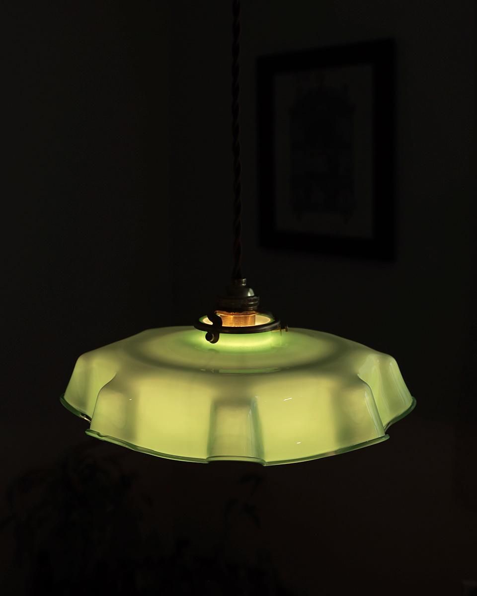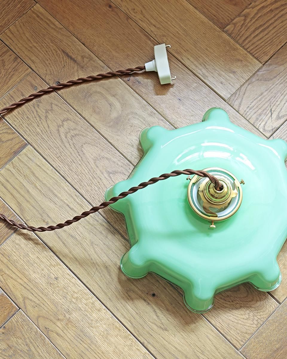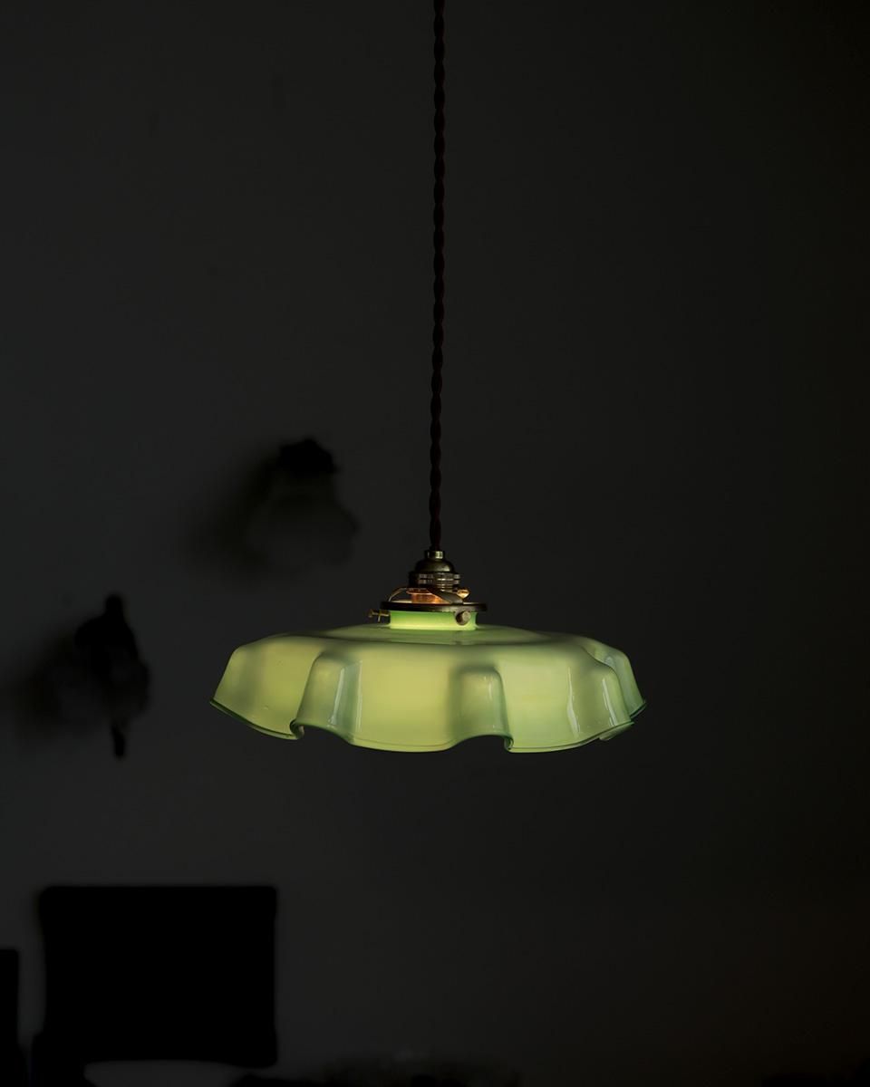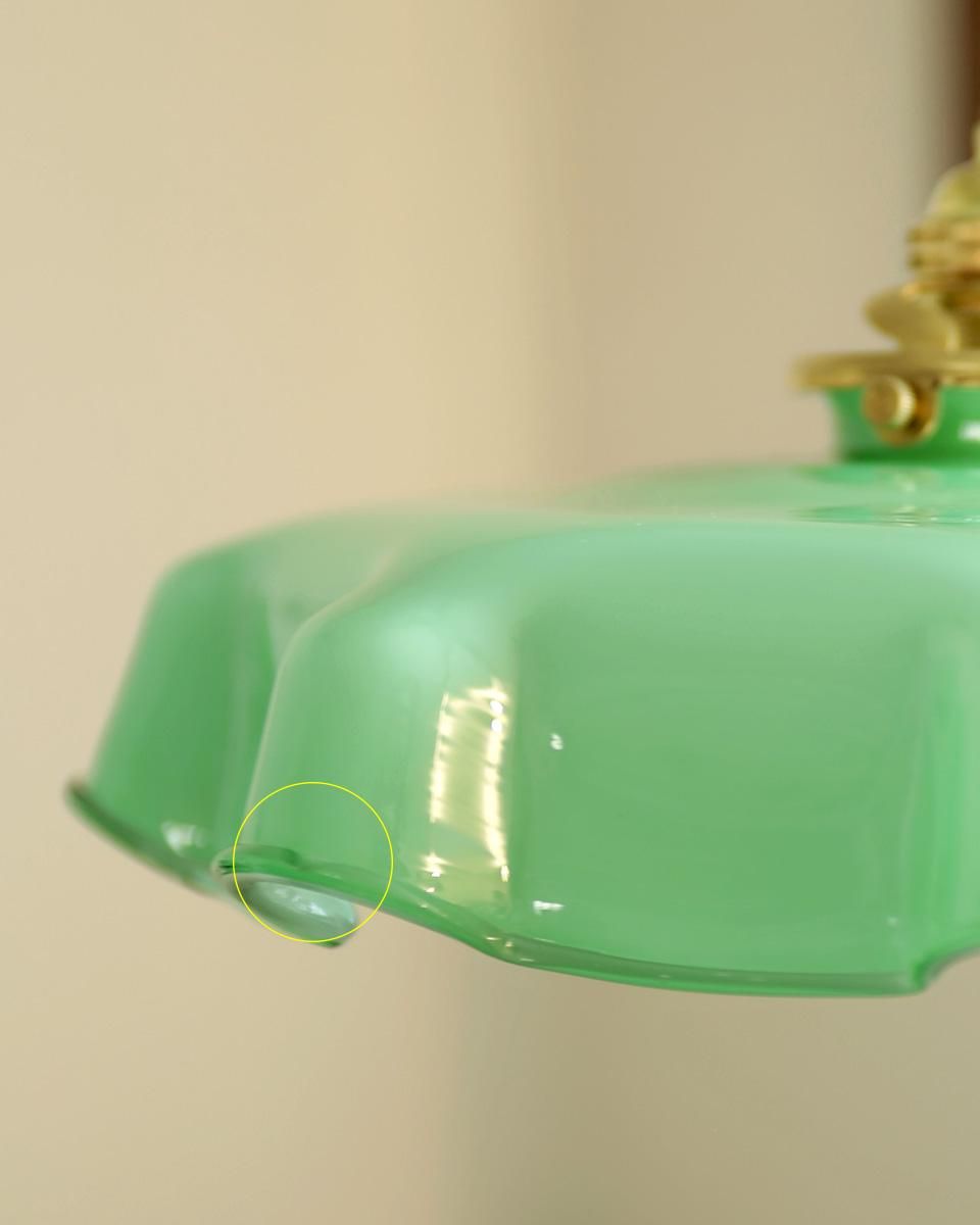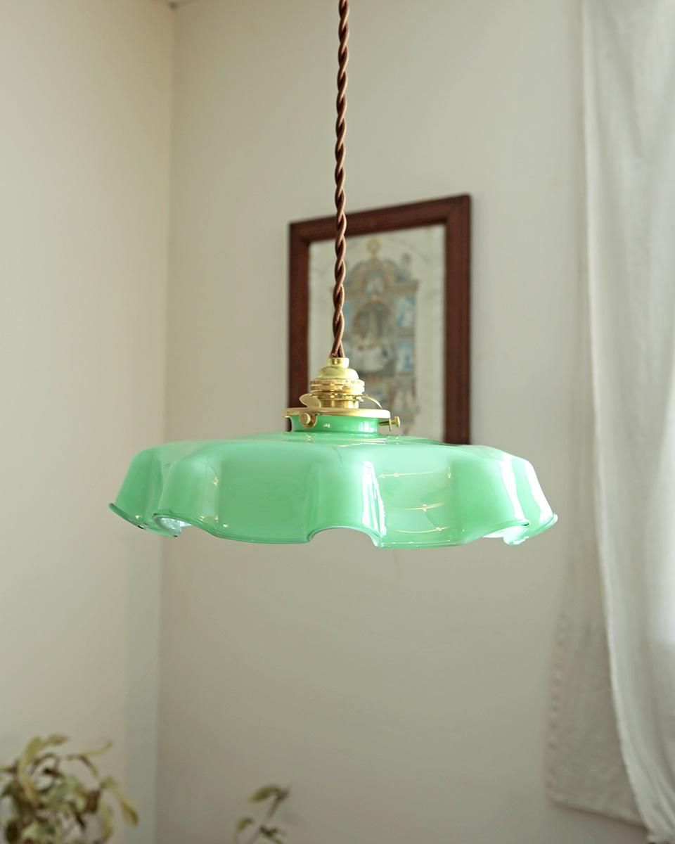 淡いグリーンのミルクガラスが魅力的なシェードランプです。