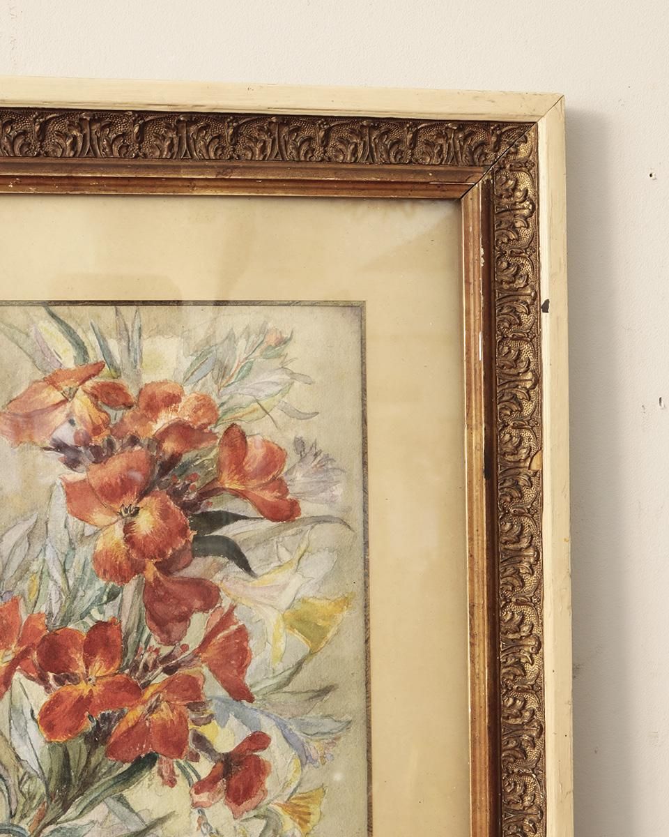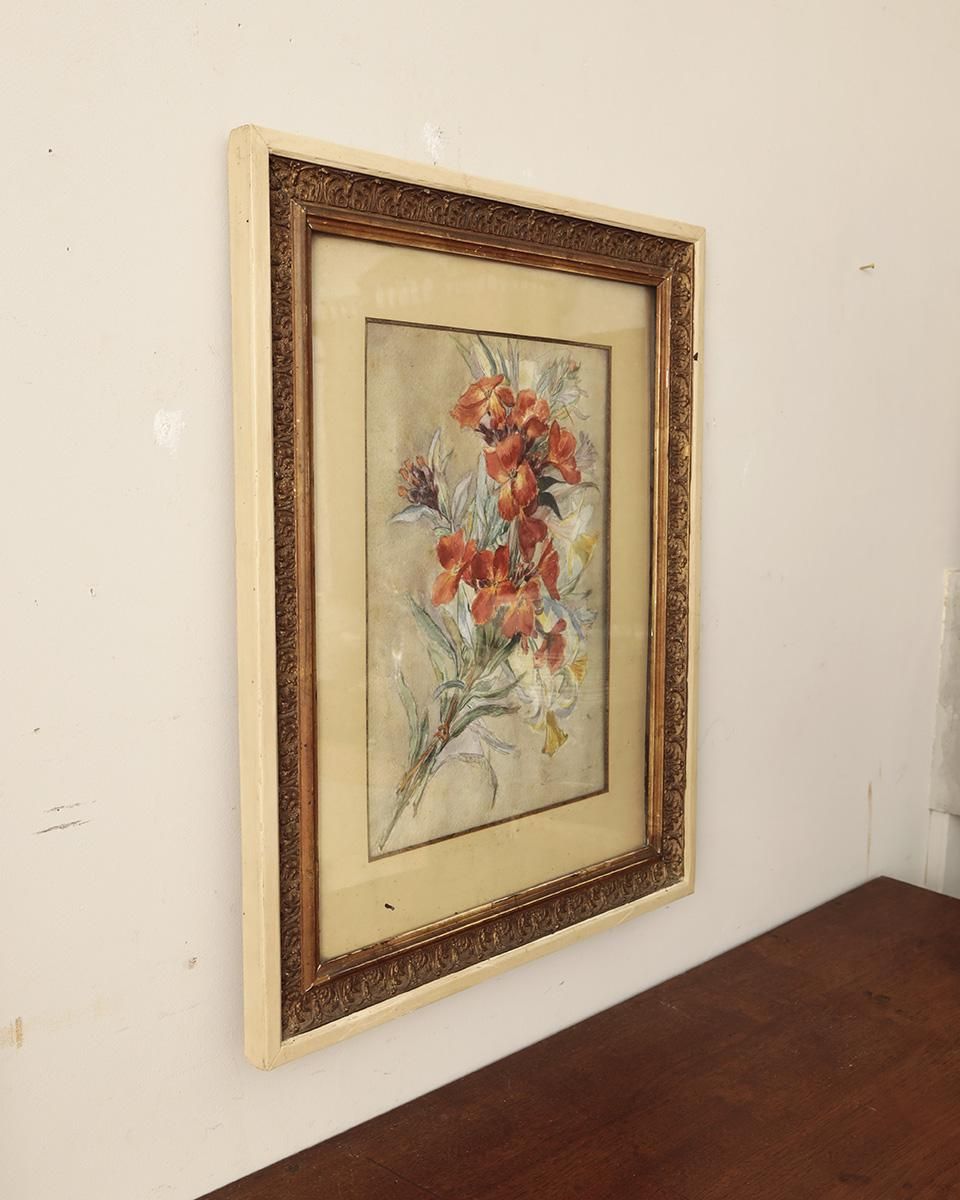 木製のフレームに、落ち着いたトーンで描かれたお花の
