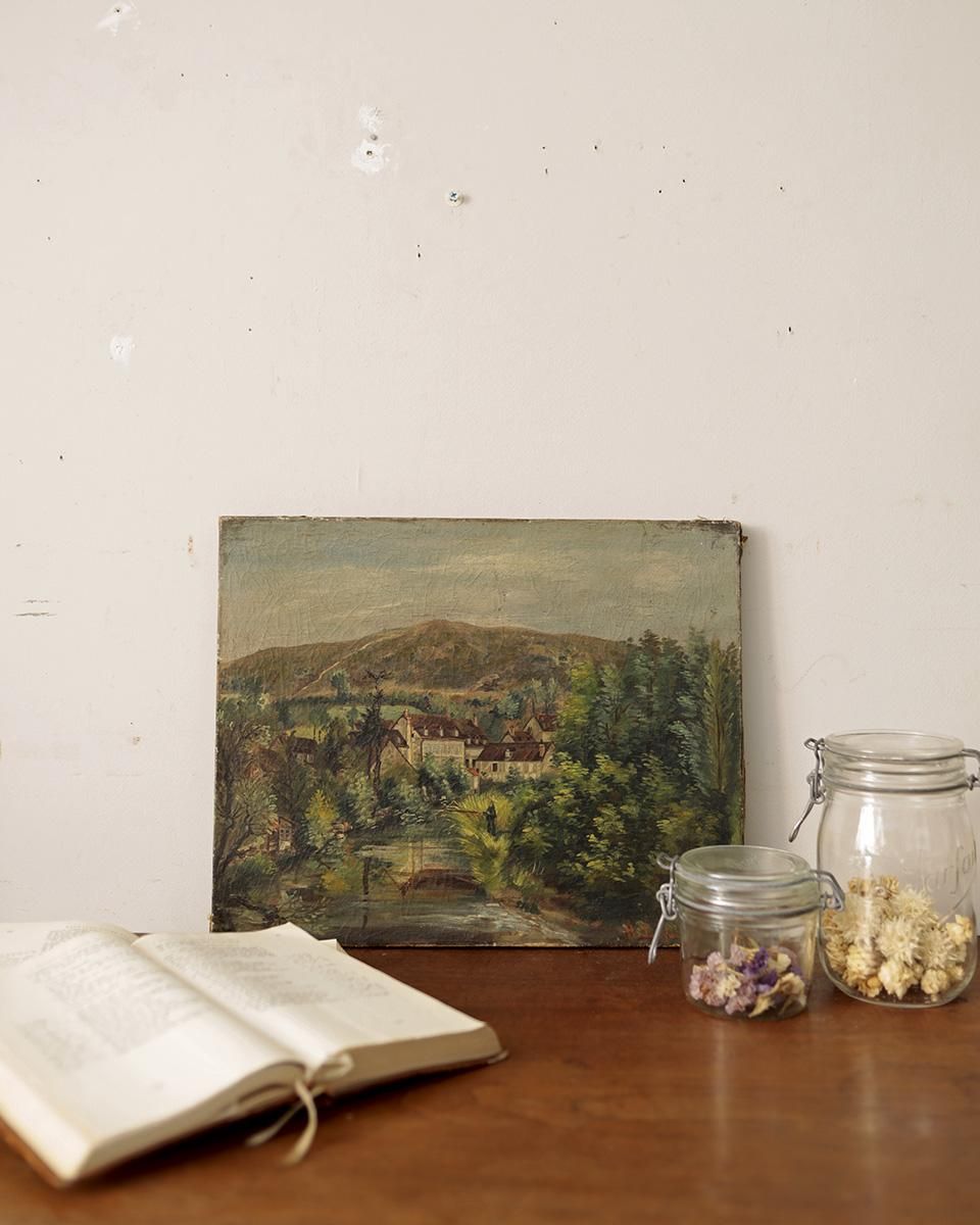 From : France 1900年代初頭に描かれた、印象派の油絵画です。 落ち着いたトーンで描かれた風景がシックな 雰囲気を醸し出しながらも 川で釣りをしている男性がどこか穏やかな 時の流れを感じさせてくれます。 アーティストのサインと「1901」との記載があります。 商品はアンティーク品のため、お写真では伝わり難い 絵具剥がれや、色褪せ、小傷や汚れなどがございます。 追加のお写真をご希望の方はお気軽にお問合せくださいませ。