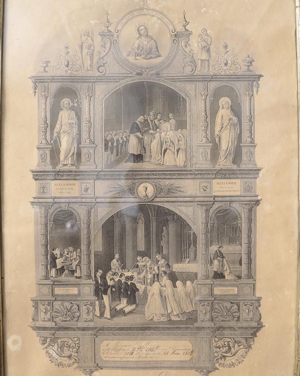 From : France フランスより届いたアンティーク ピクチャーフレーム。 教会もしくは聖堂の記念品として婚礼や懺悔などの 様子が描かれた複製版となります。 黒塗りのフレームがスタイリッシュな印象で、 インテリアのエッセンスとして壁面を装飾いたします。 フレーム内寸:W31cm/H46.2cm 商品はアンティーク品のため、お写真では伝わり 難い色褪せや小傷などがございます。 追加のお写真をご希望の方はお気軽にお問合せくださいませ。