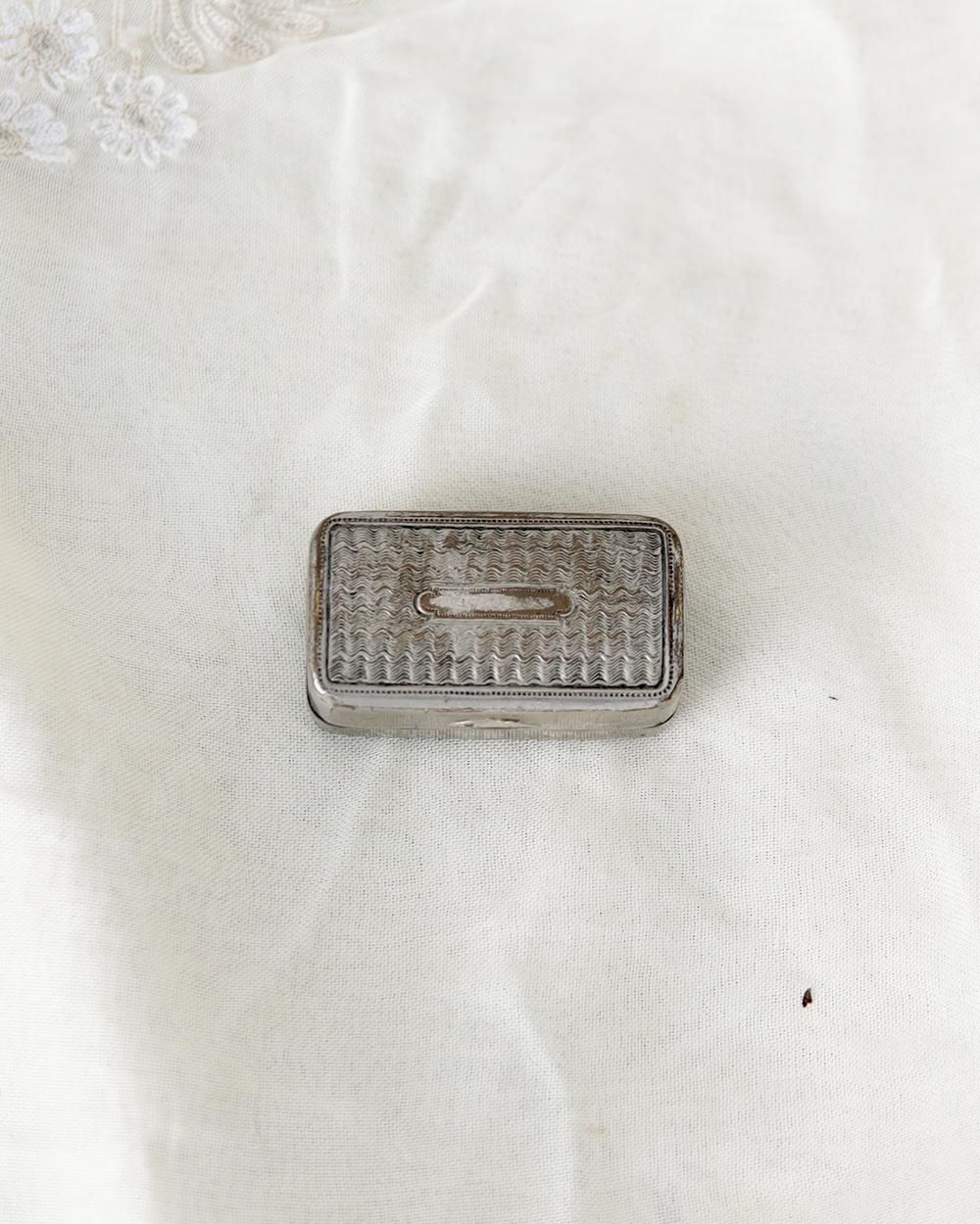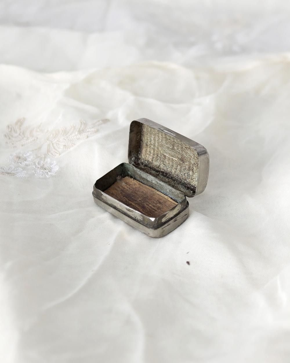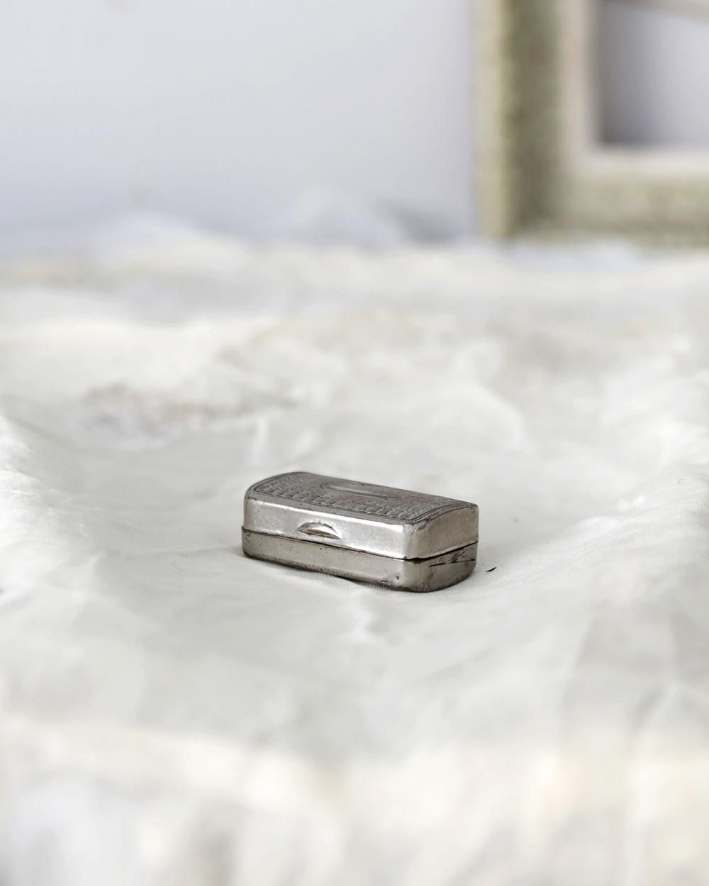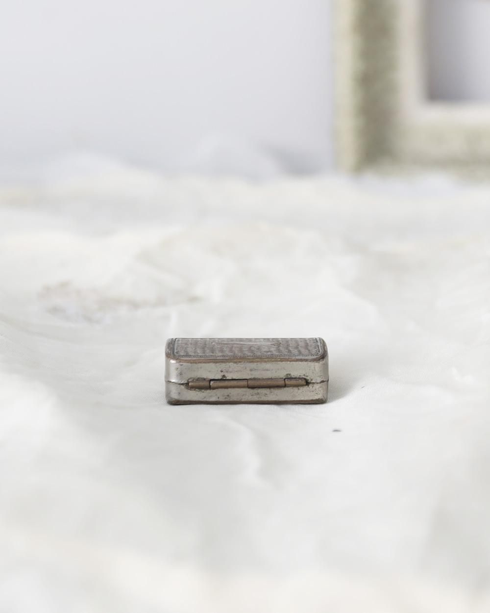 From : France シルバープレート製のジュエリーケースです。 小さいサイズながらも表面の細やかな 装飾がクールな佇まい。 旅行やお出かけの際に薬やジュエリーなど ちょっとしたものを持ち運ぶケースにお勧めです。 商品はアンティーク品のため、お写真では伝わり 難い小さな傷やくすみ、腐食などがございます。 追加のお写真をご希望の方はお気軽にお問合せくださいませ。