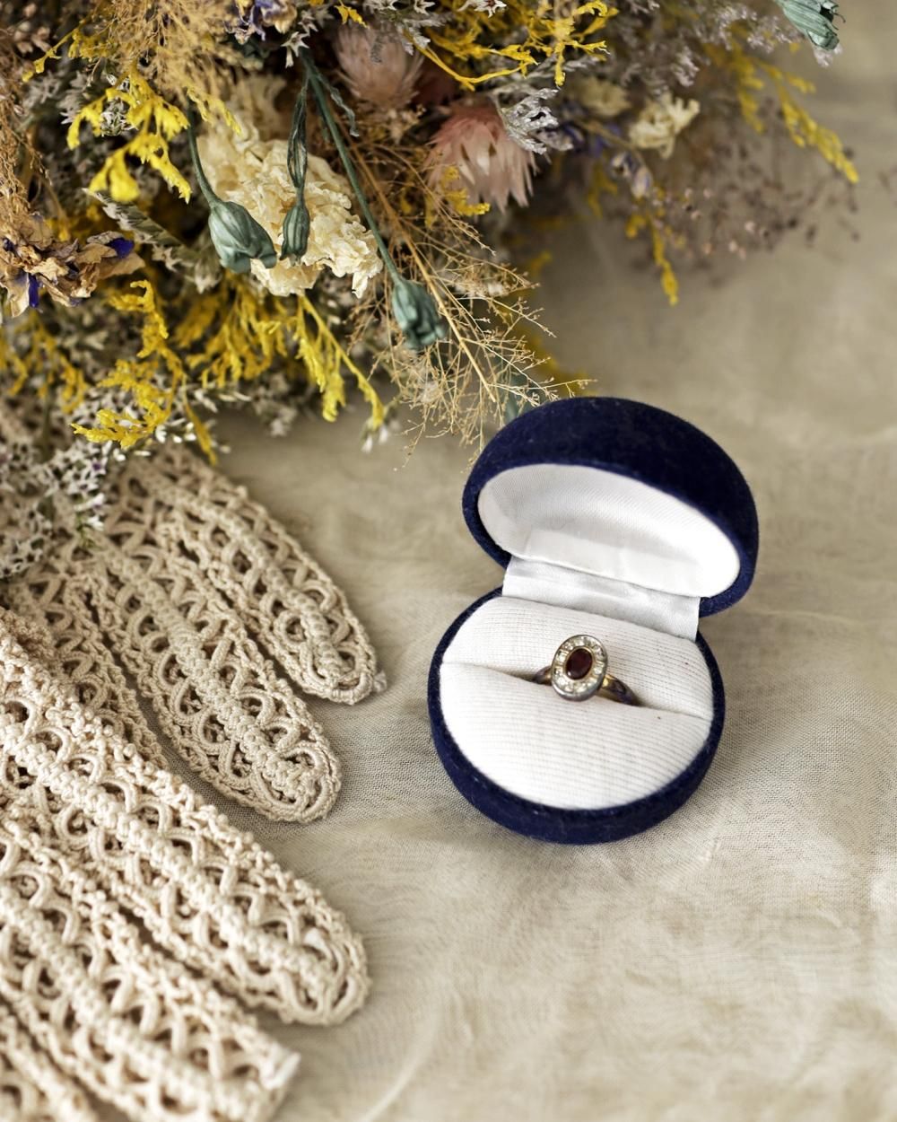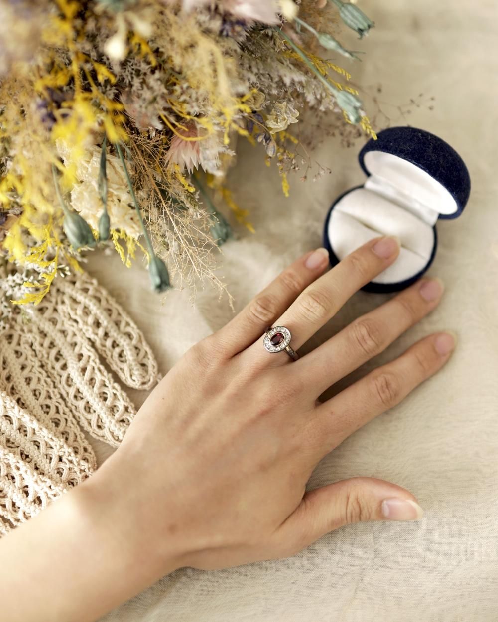 深い赤色のストーンに、その周りを囲むように