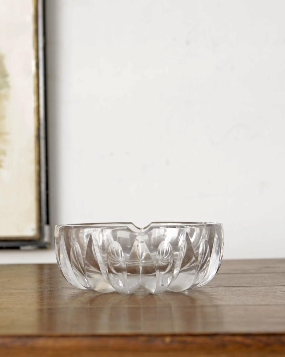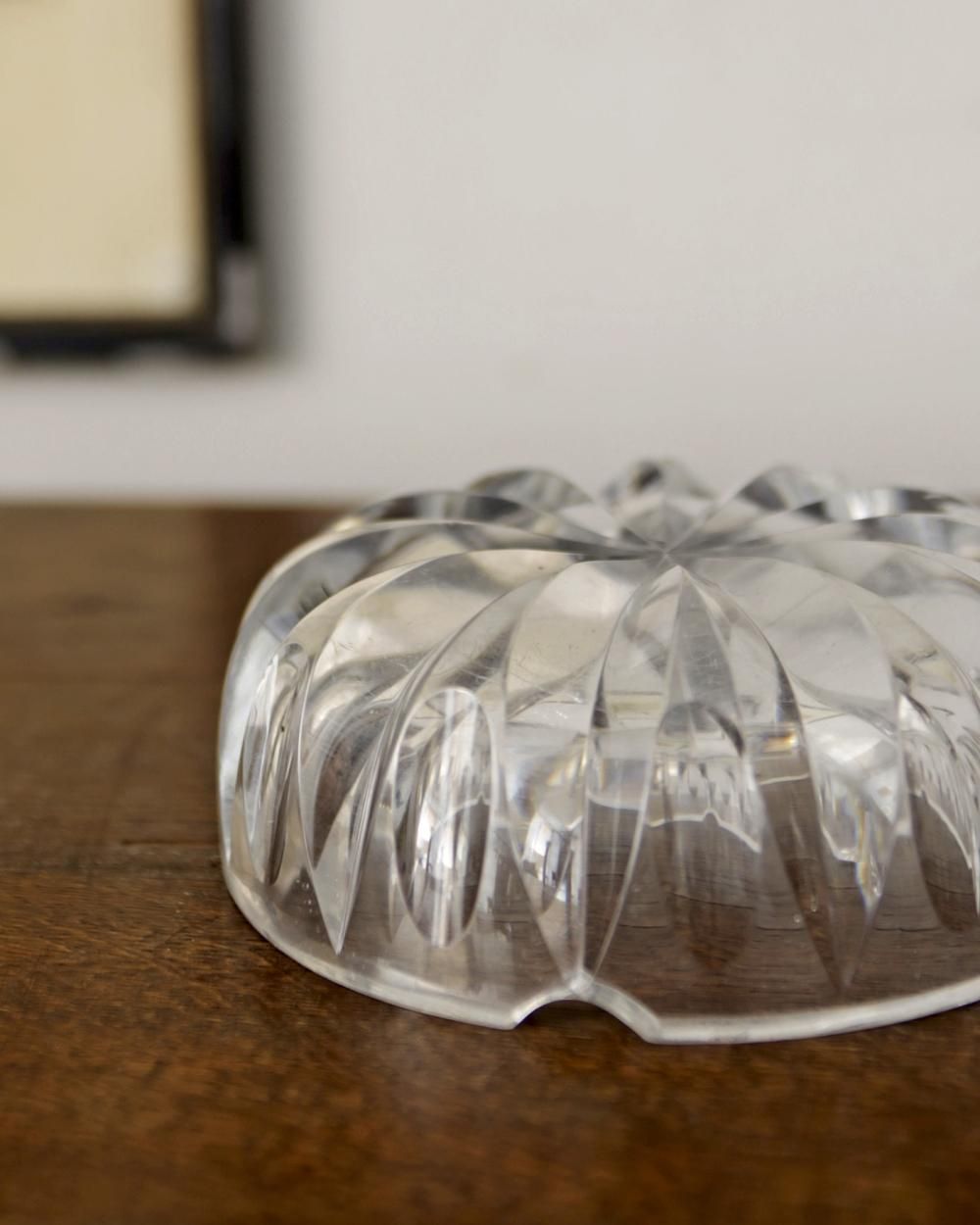 From : France プレスドガラスのアッシュトレイ(灰皿)です。 とても厚みのあるクリアガラスに大胆な カッティングの装飾が重厚でレトロな佇まいが 魅力的なガラスプレートです。 灰皿としてだけじゃなく、アクセサリーや鍵、 小物入れとしてもお勧めです。 商品はアンティーク品のため、お写真では伝わり難い くすみや白濁、汚れや小傷などがございます。 追加のお写真をご希望の方はお気軽にお問合せくださいませ