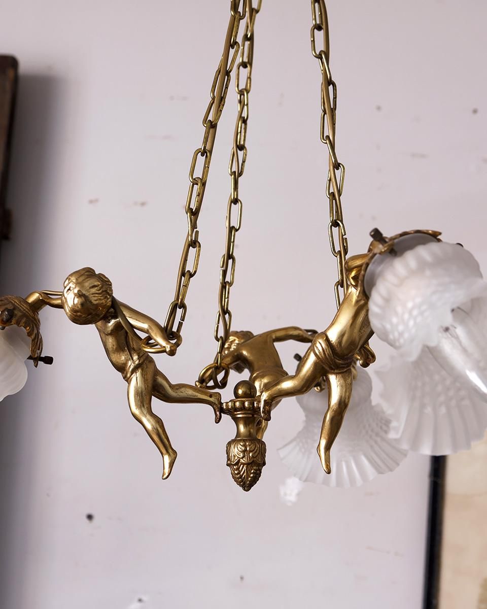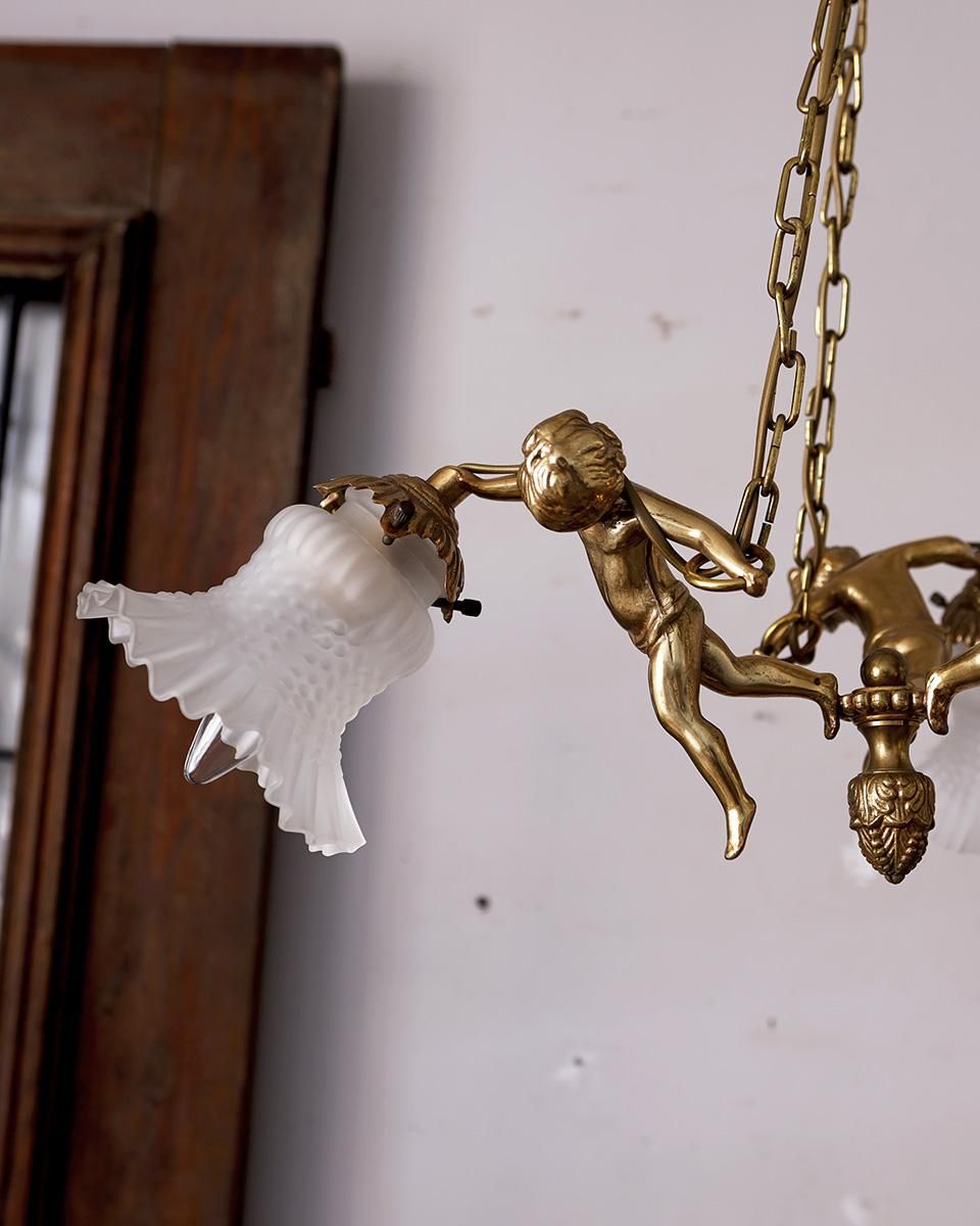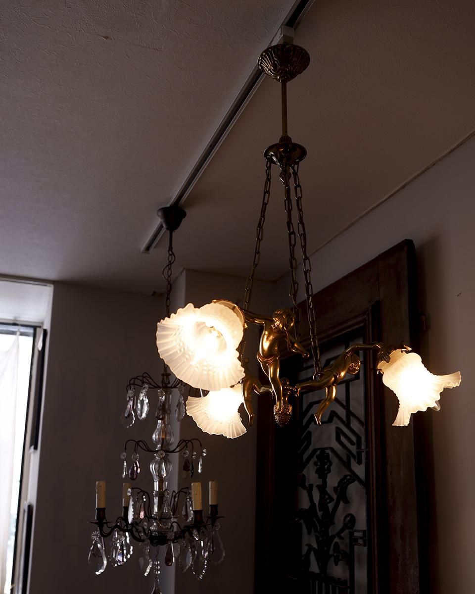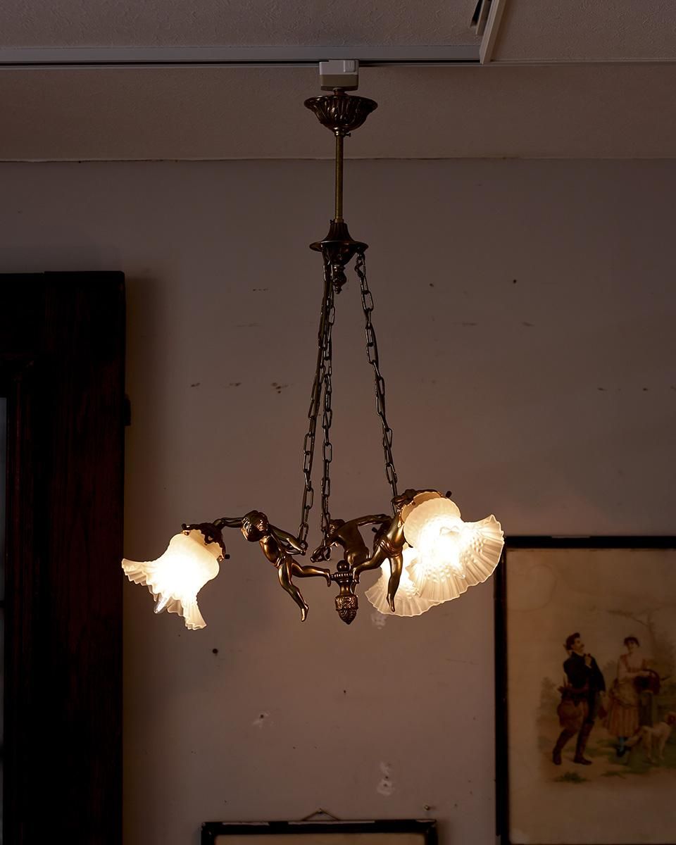 デザインが目を惹く、真鍮製の3灯タイプのシャンデリアです。