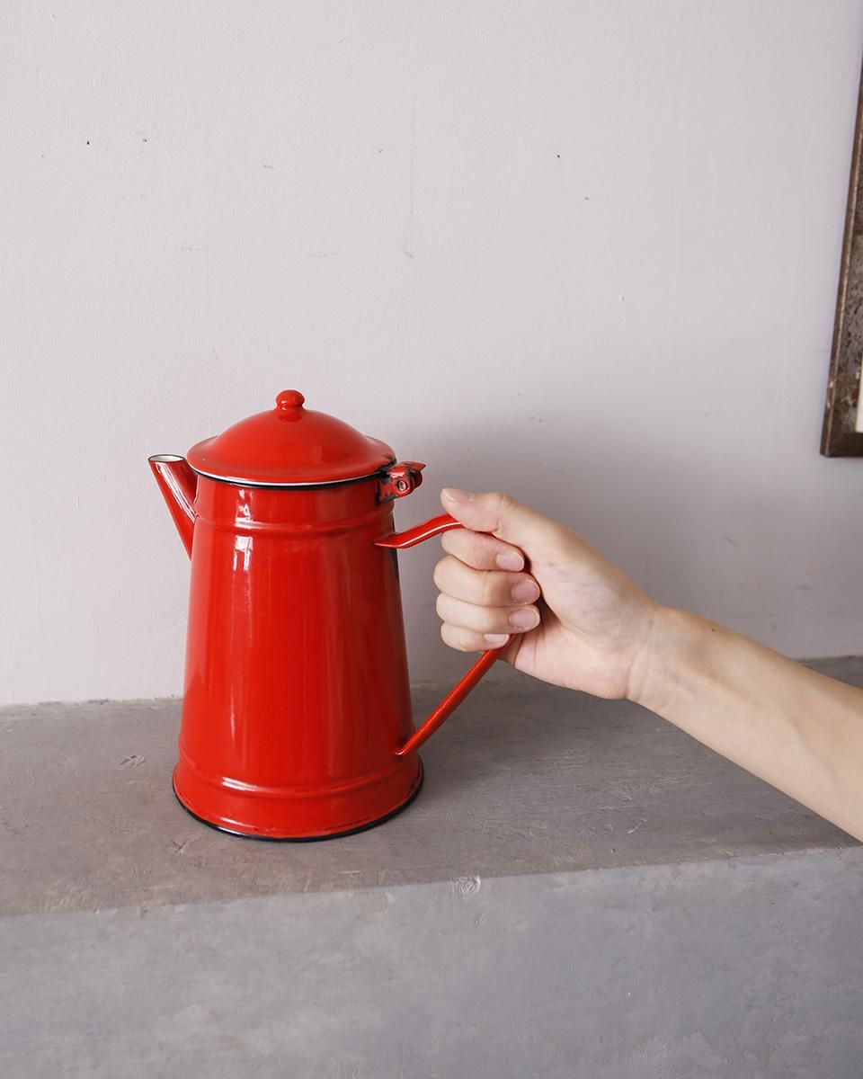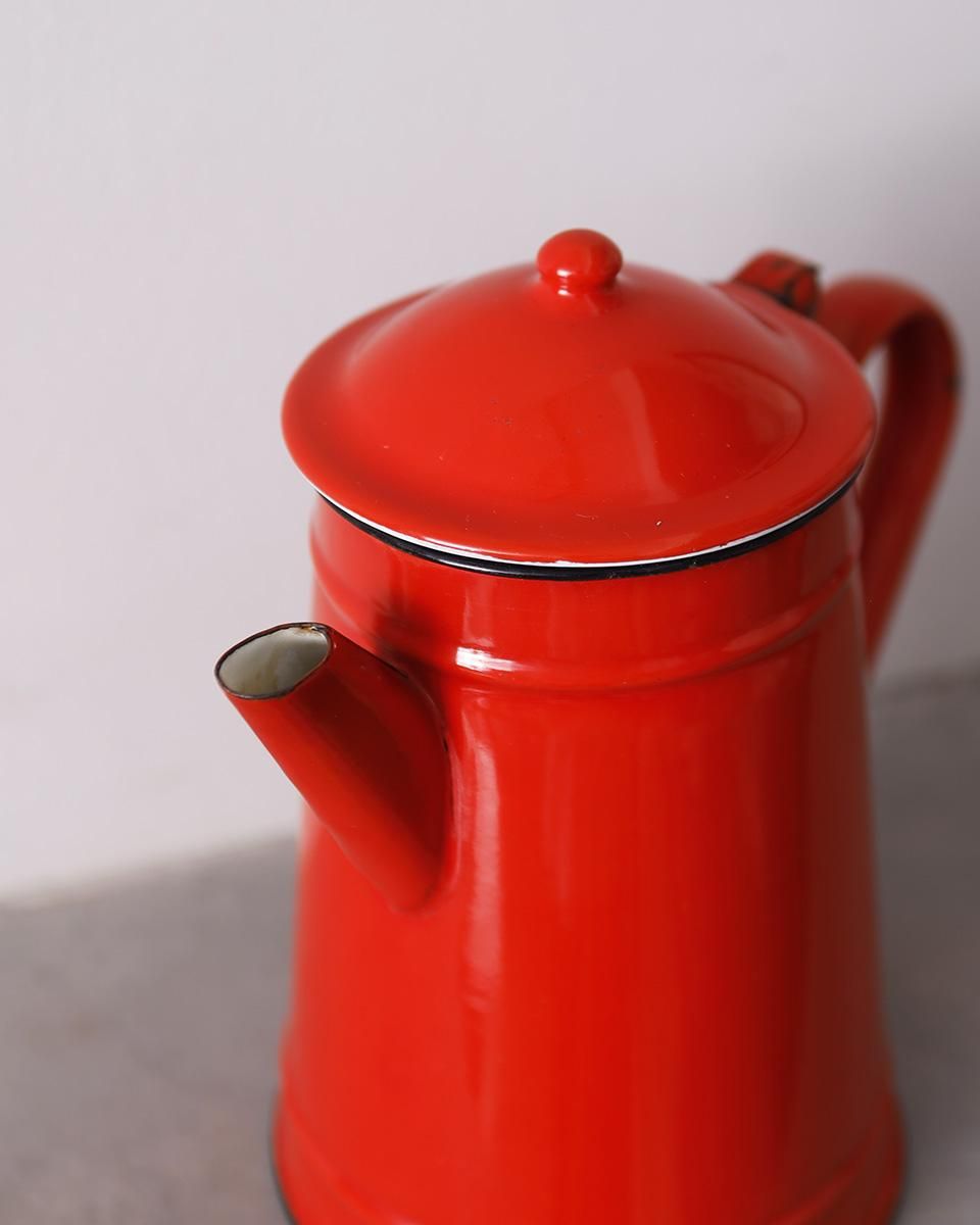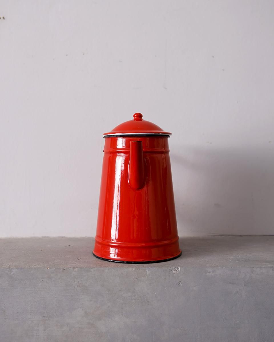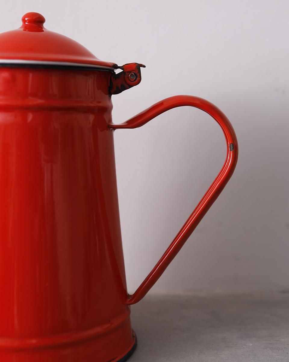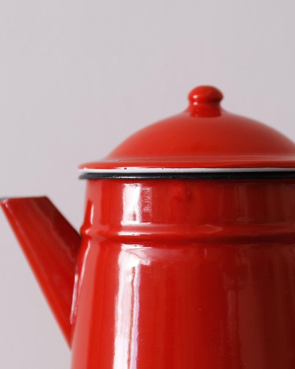 鮮やかな赤色が目を惹くホーロー製のコーヒーポットです。