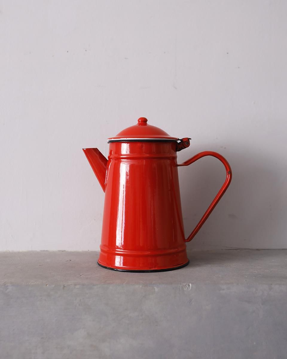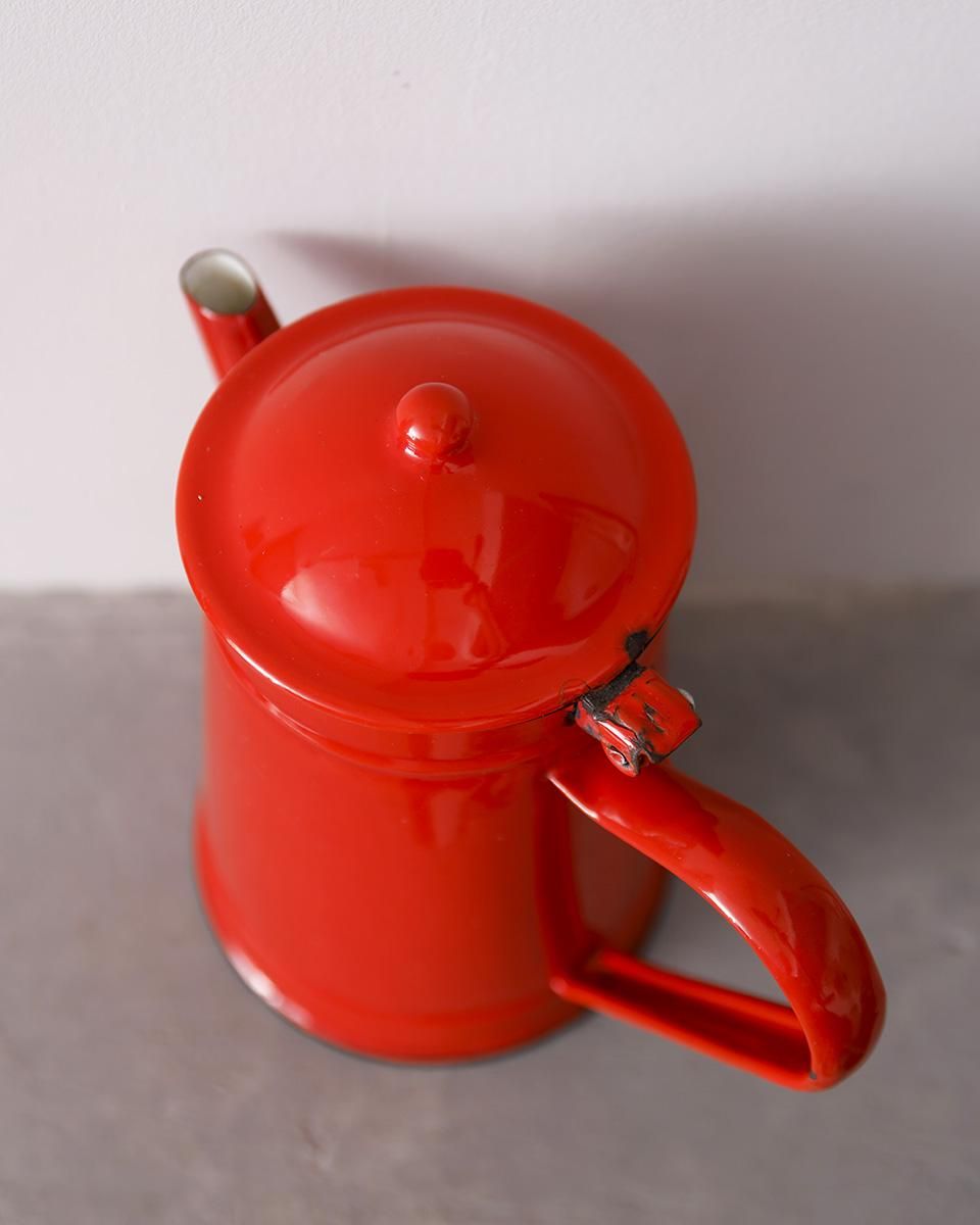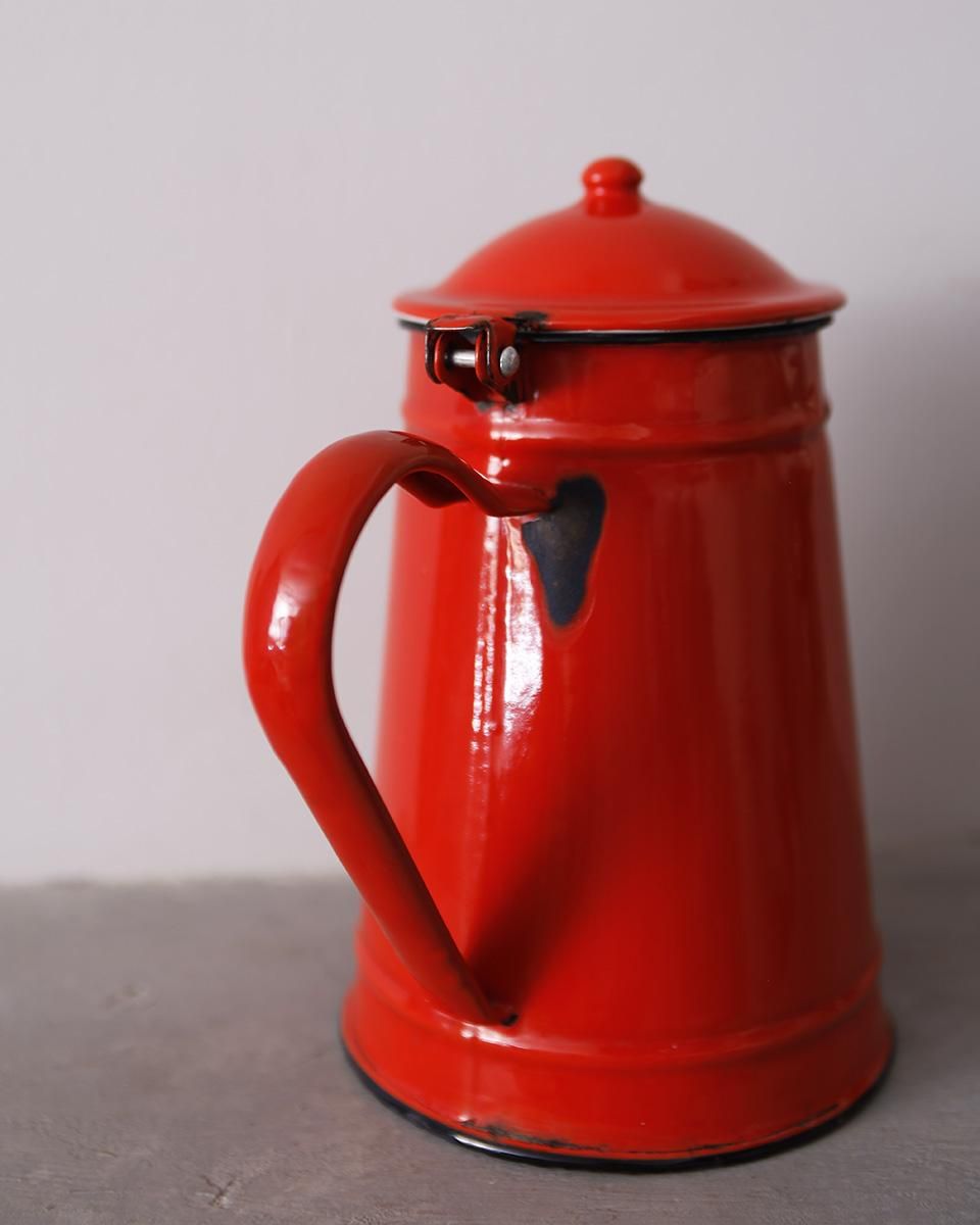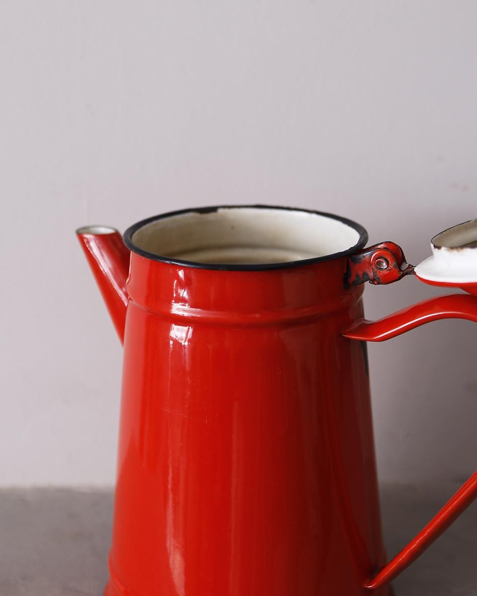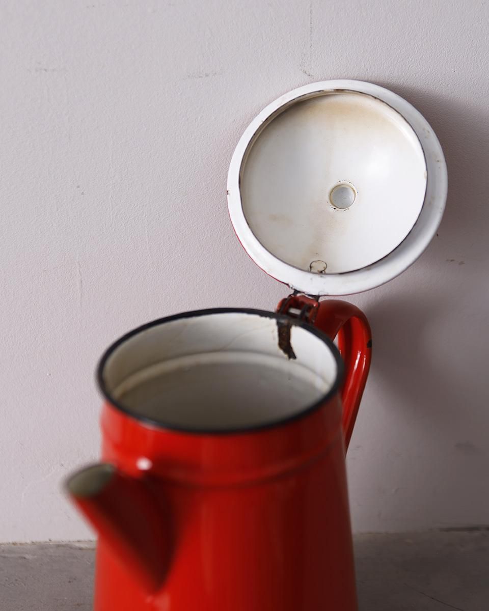 鮮やかな赤色が目を惹くホーロー製のコーヒーポットです。