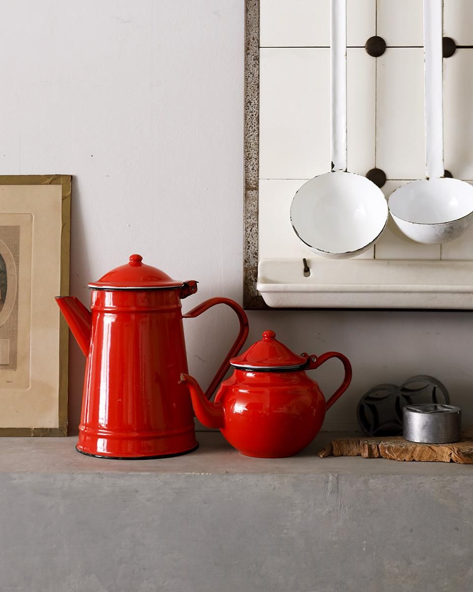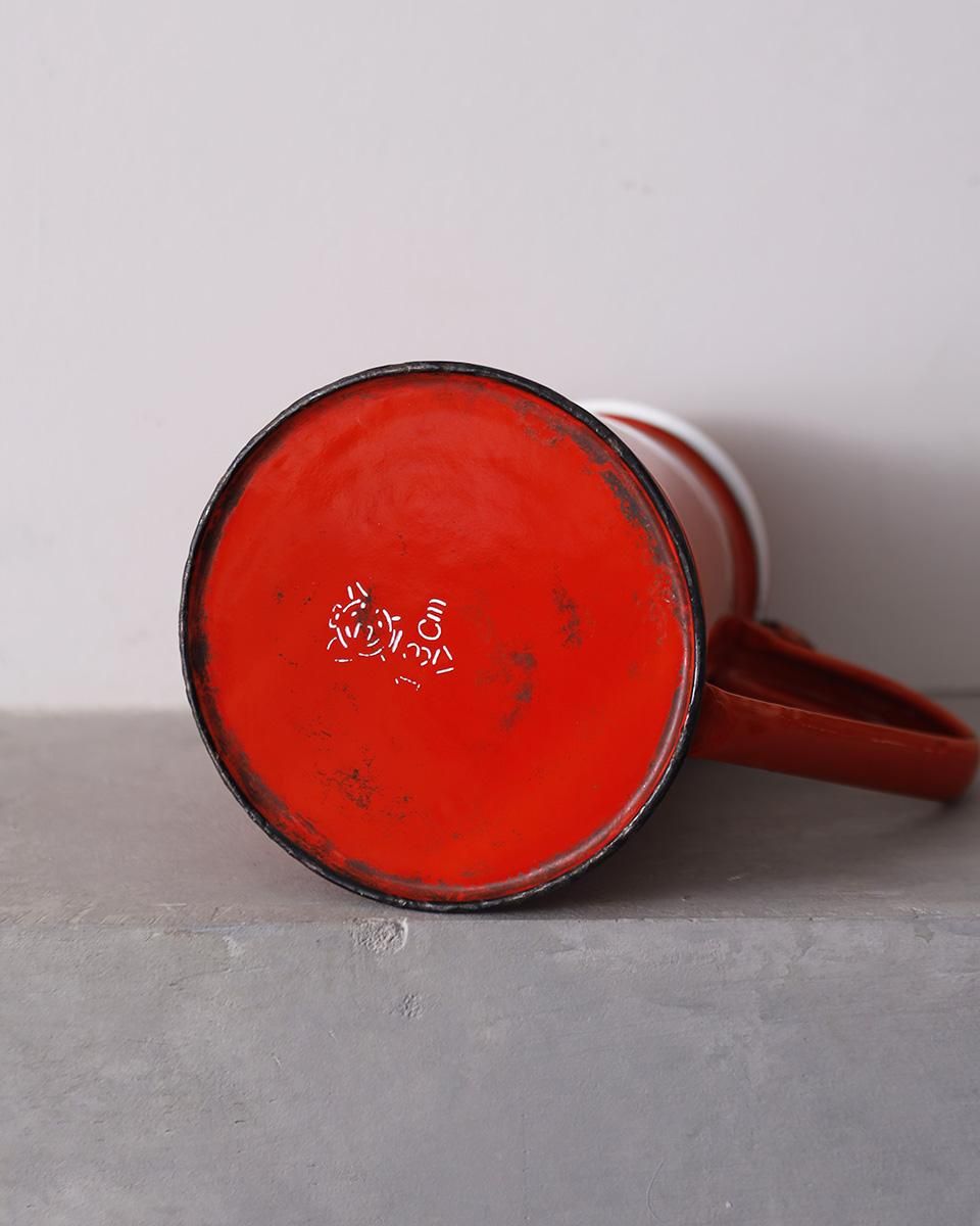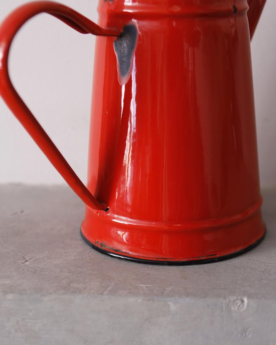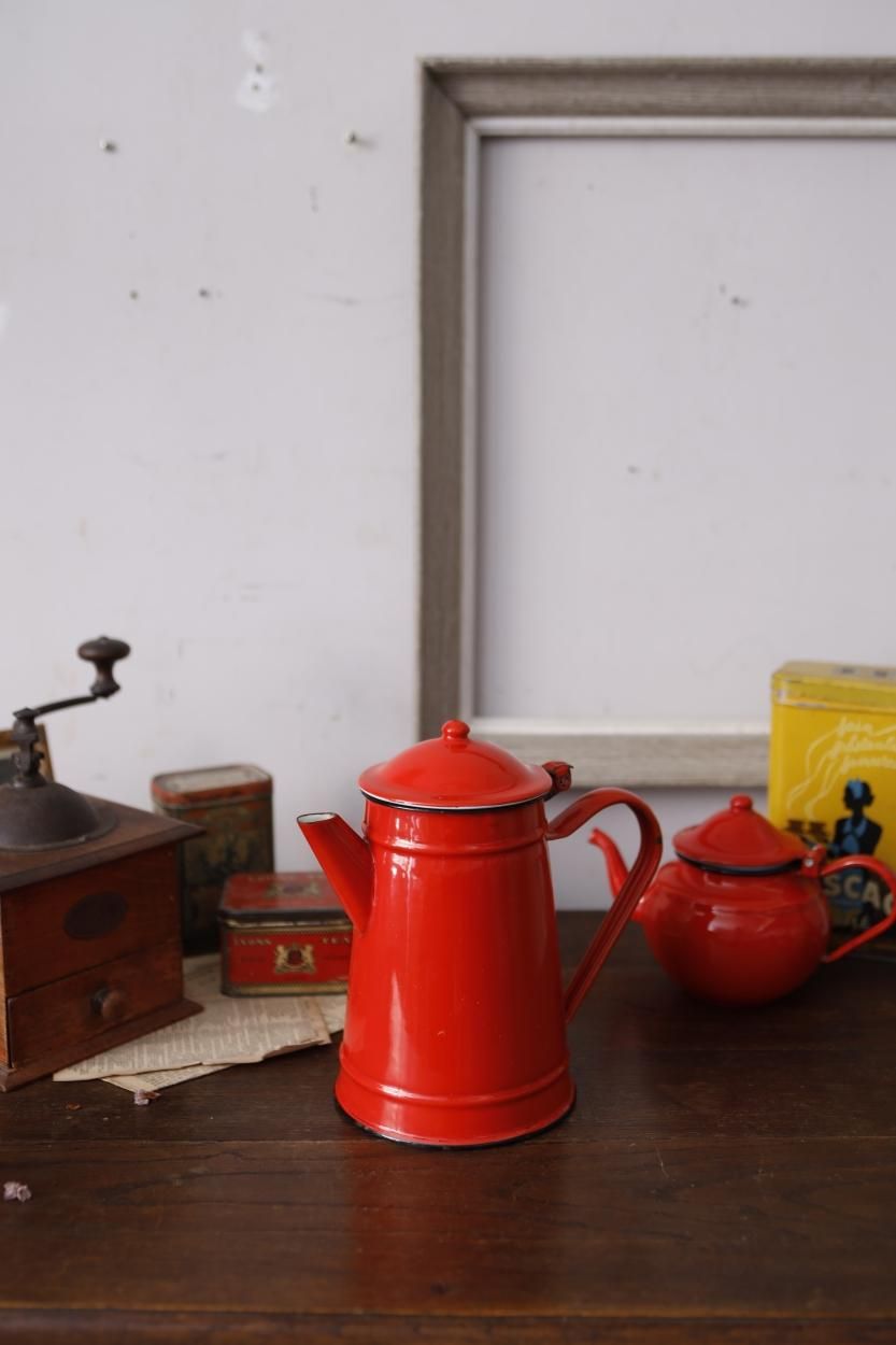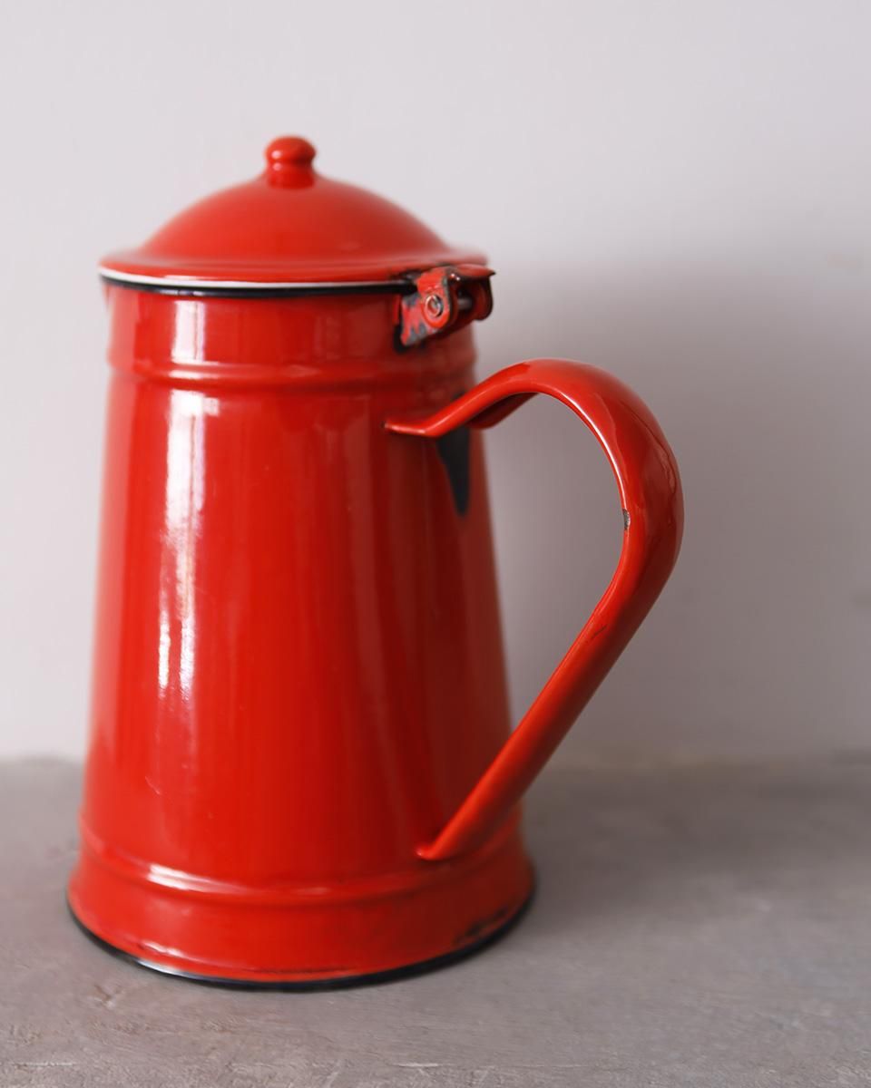 鮮やかな赤色が目を惹くホーロー製のコーヒーポットです。