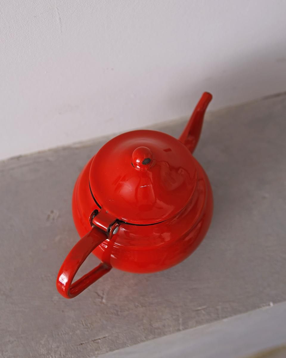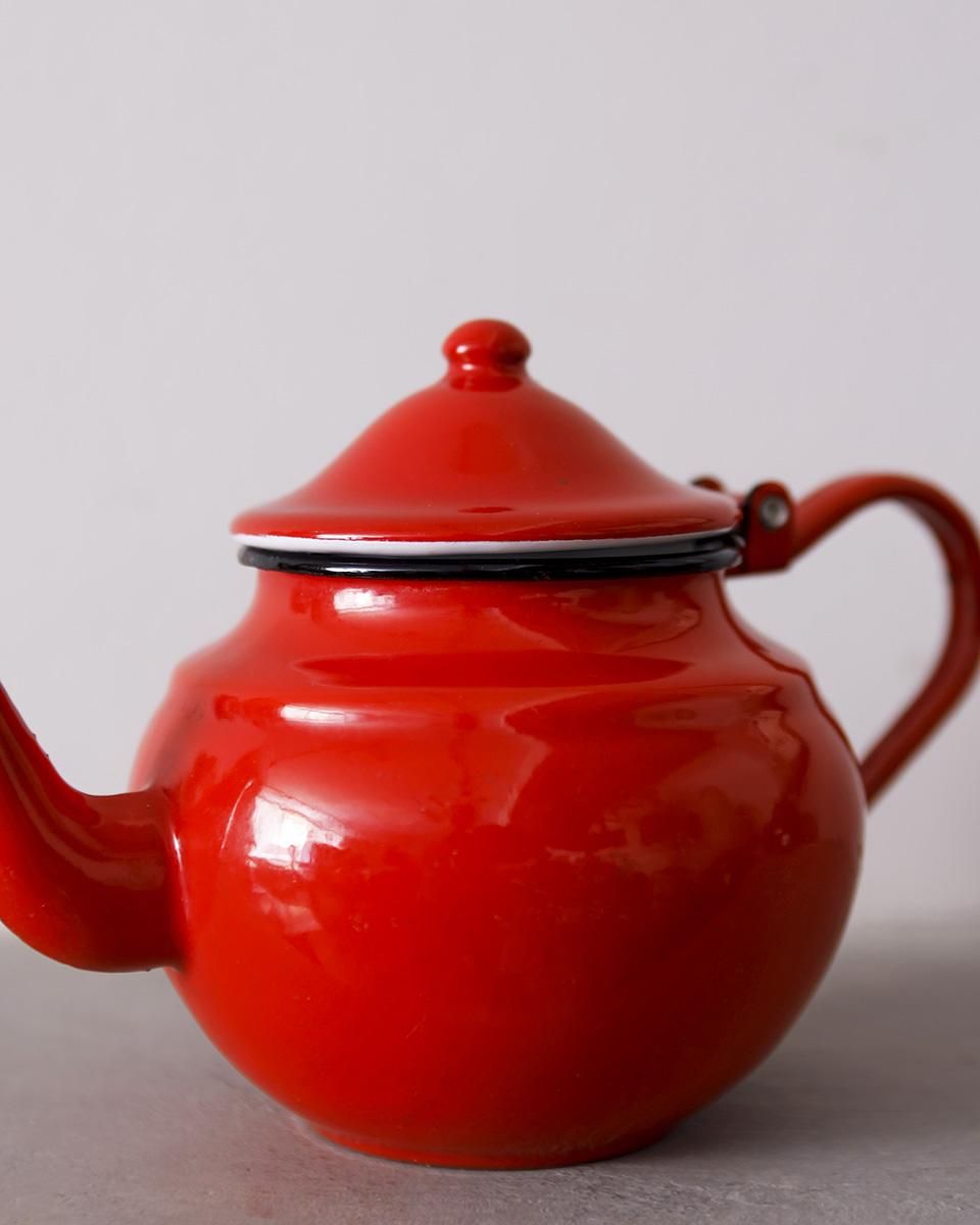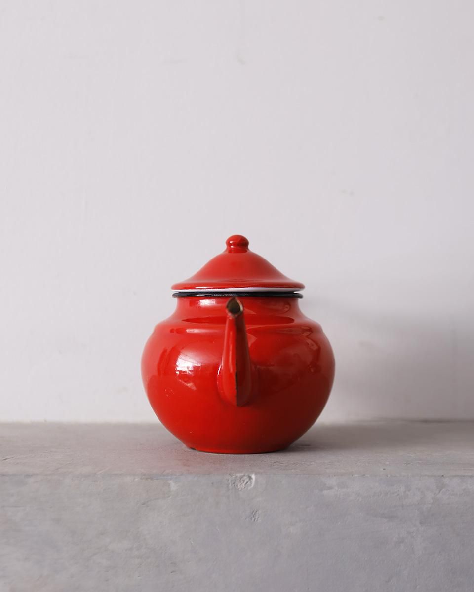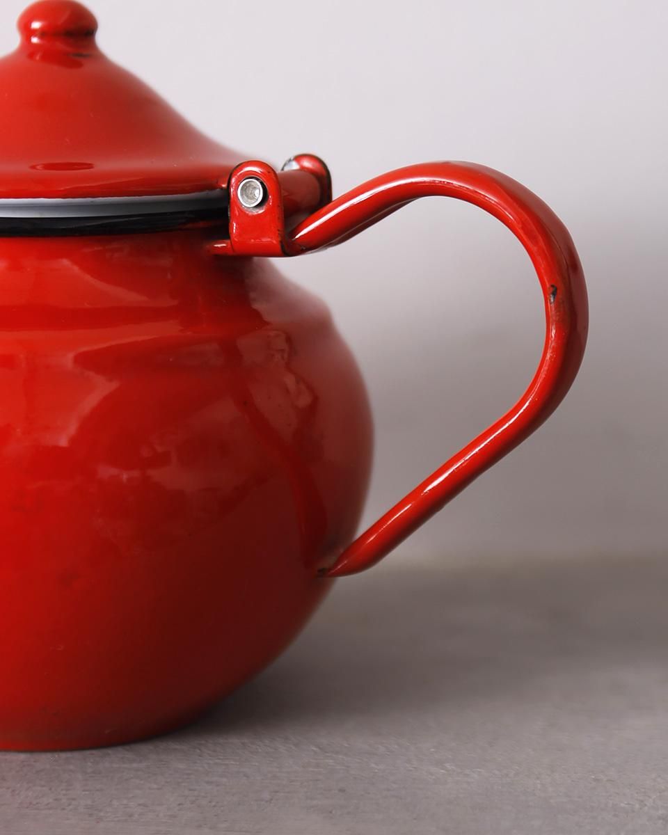 鮮やかな赤色が目を惹くホーロー製のティーポットです。