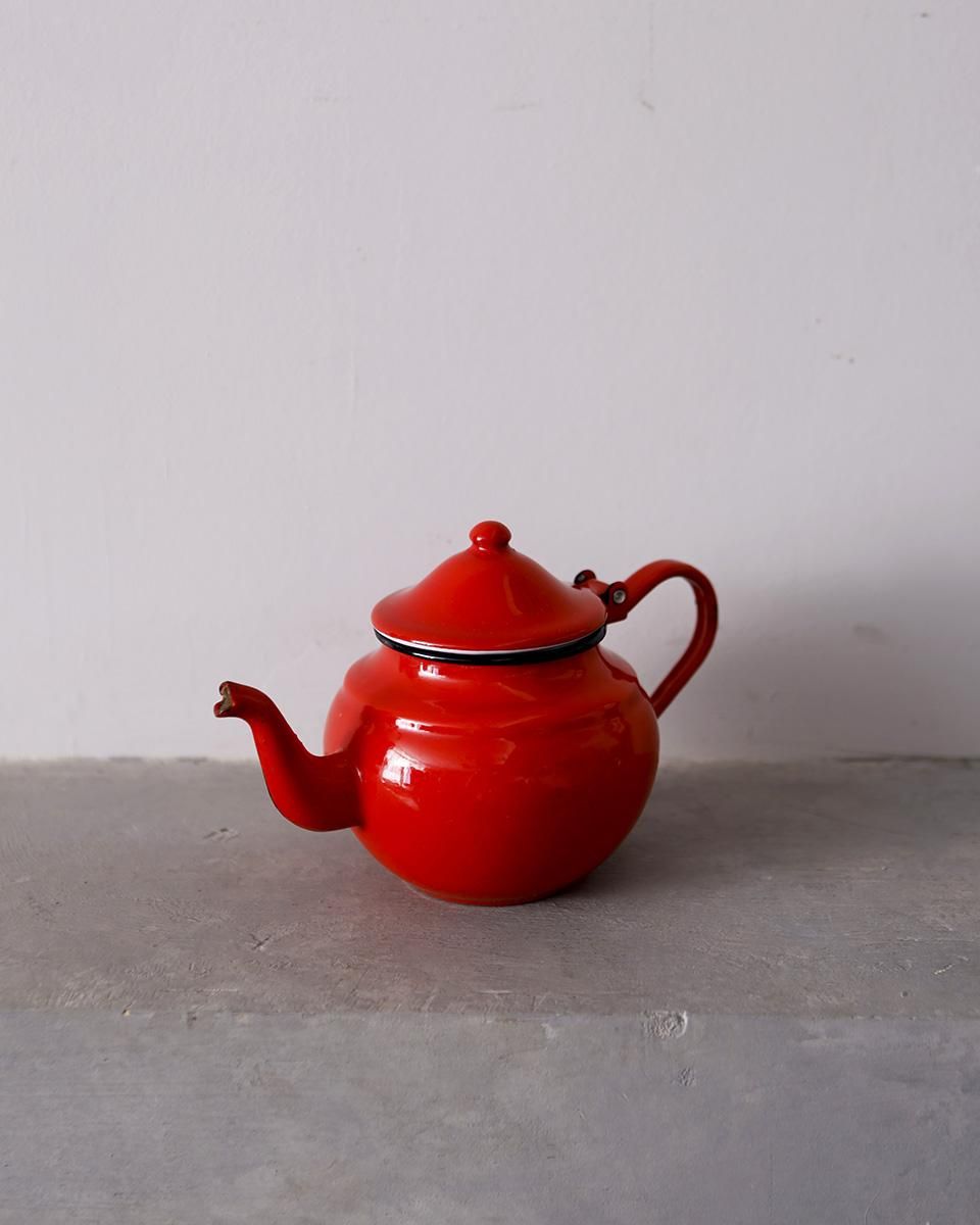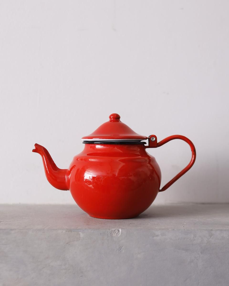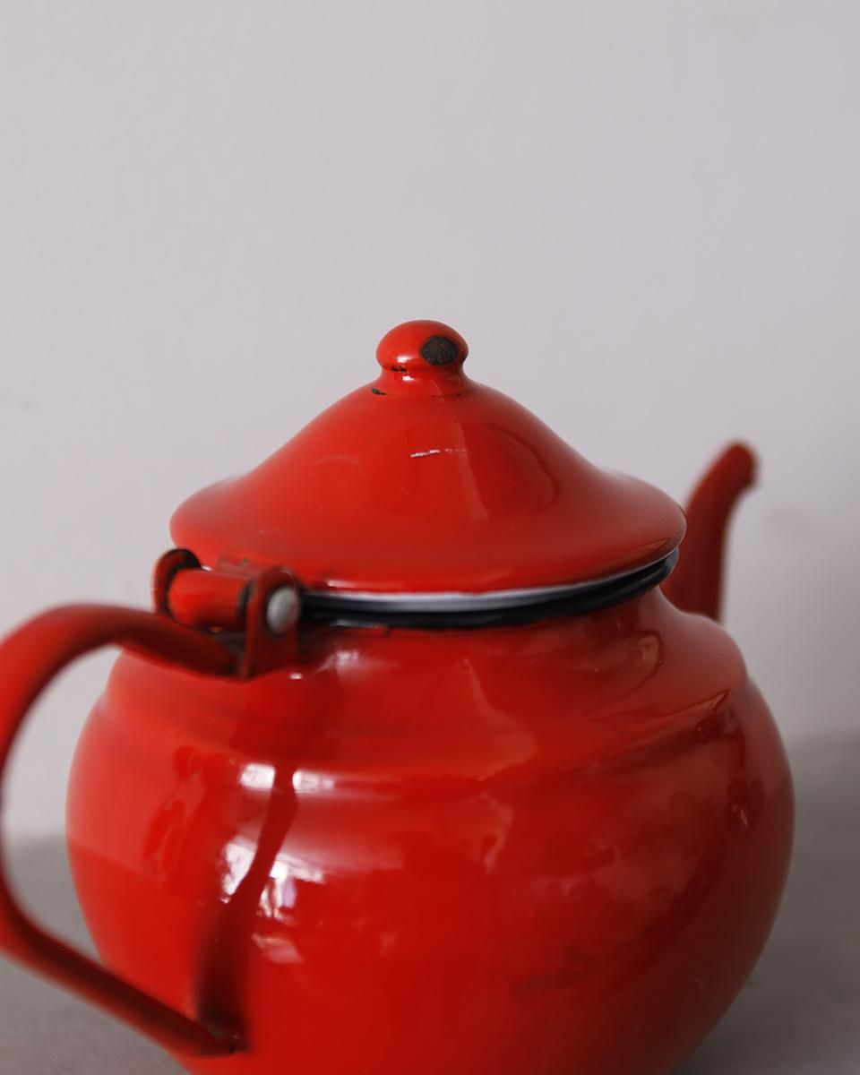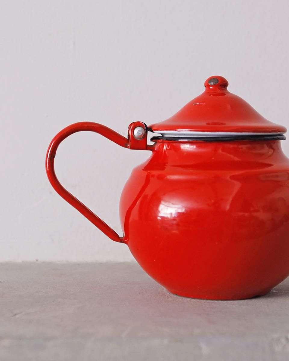 鮮やかな赤色が目を惹くホーロー製のティーポットです。