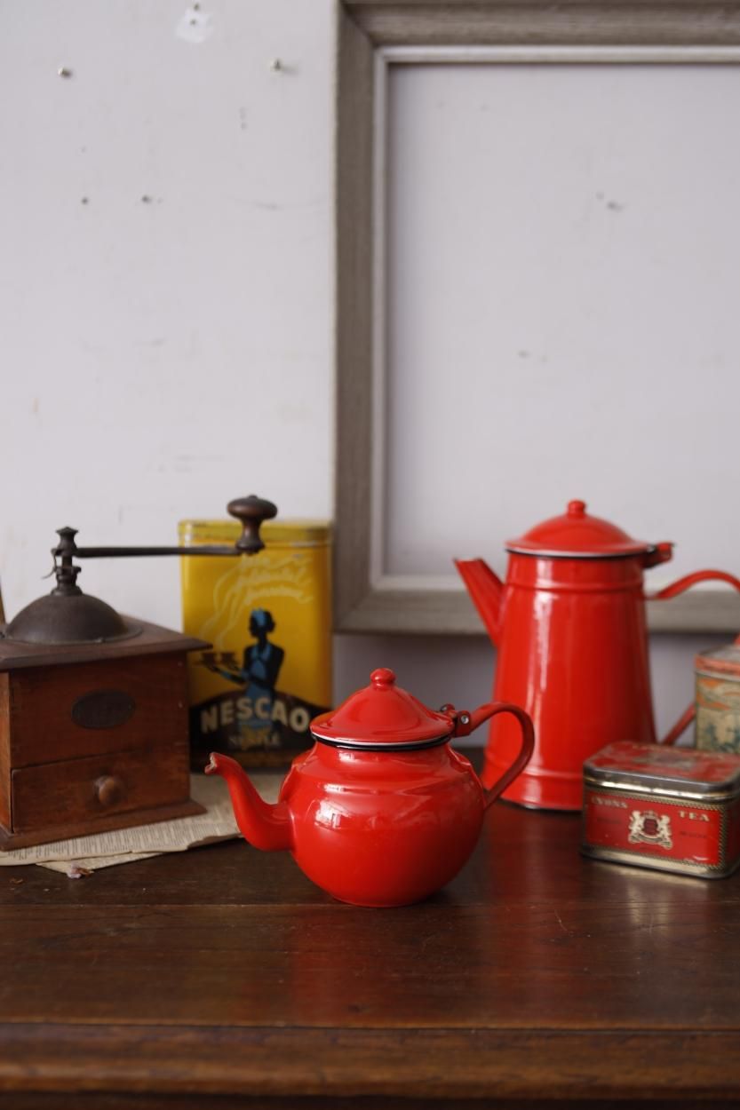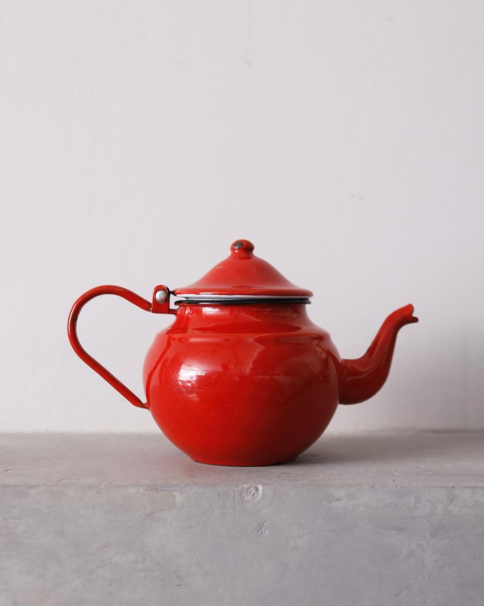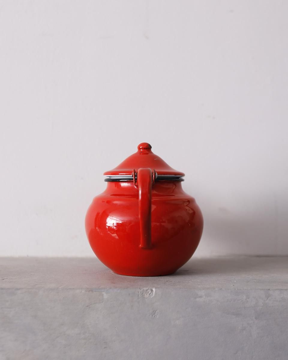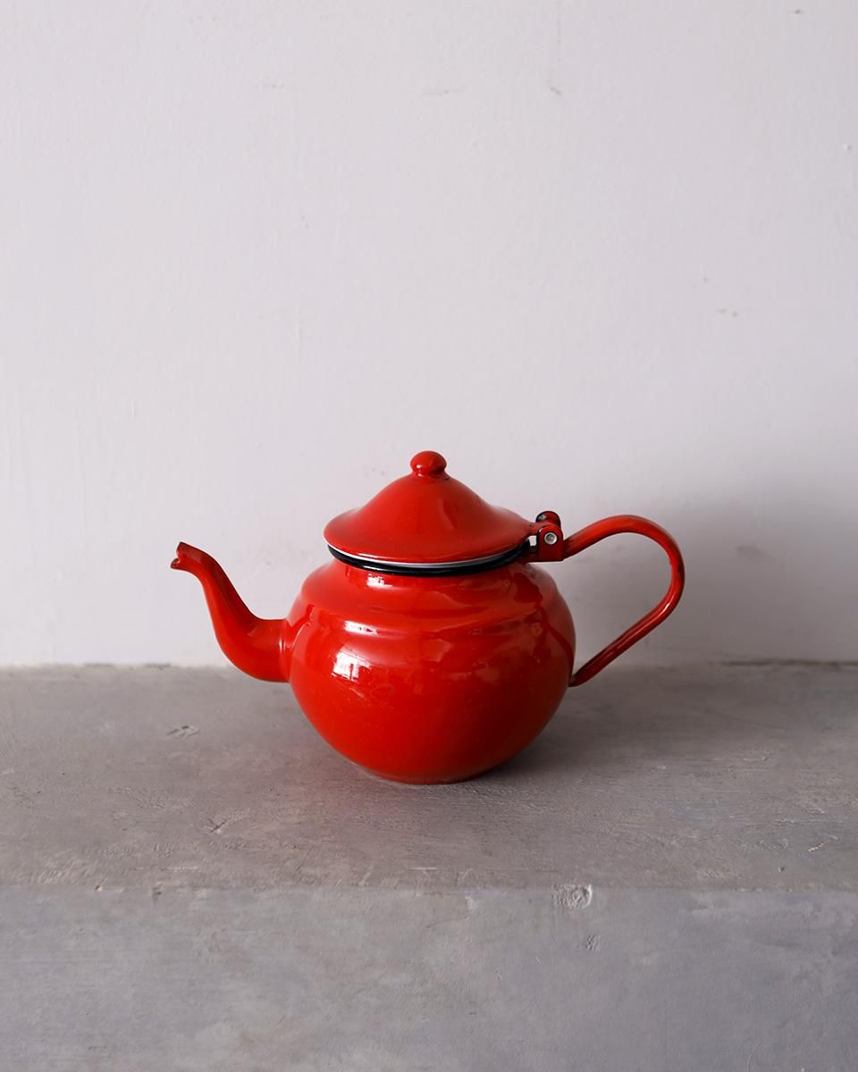 鮮やかな赤色が目を惹くホーロー製のティーポットです。