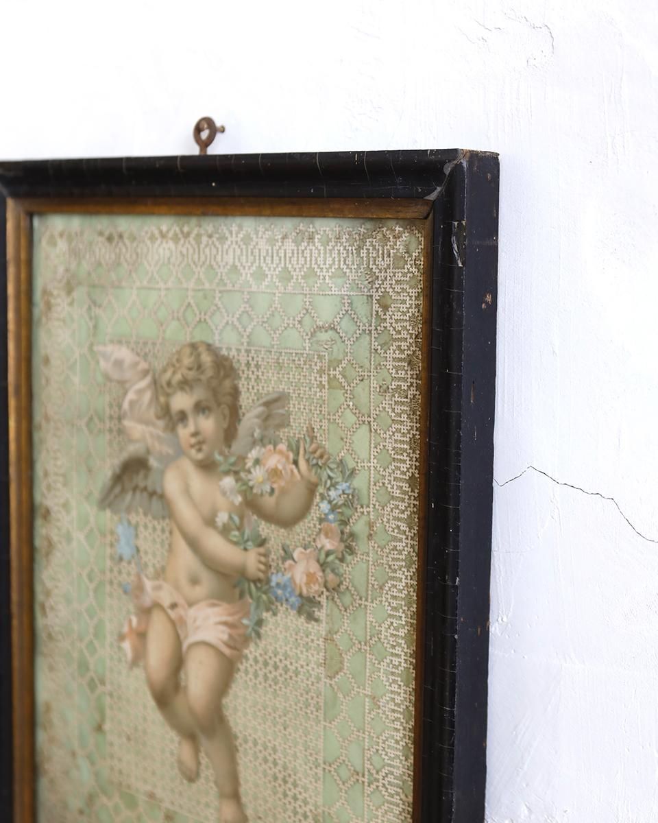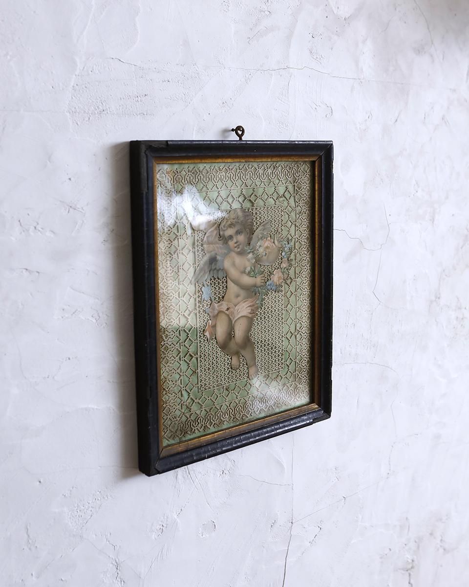 From : France フランスで見つけた天使が描かれた絵画。 1960年代頃に考案されたクロモスのウォールアートで チャーミングな天使が目を惹きます。 ナポレオンIII世時代の艶めいたブラック×ゴールドの フレームが気品高くひきしまった印象を添えます。 商品はアンティーク品のため、お写真では伝わり 難い色褪せや小傷などがございます。 追加のお写真をご希望の方はお気軽にお問合せくださいませ。
