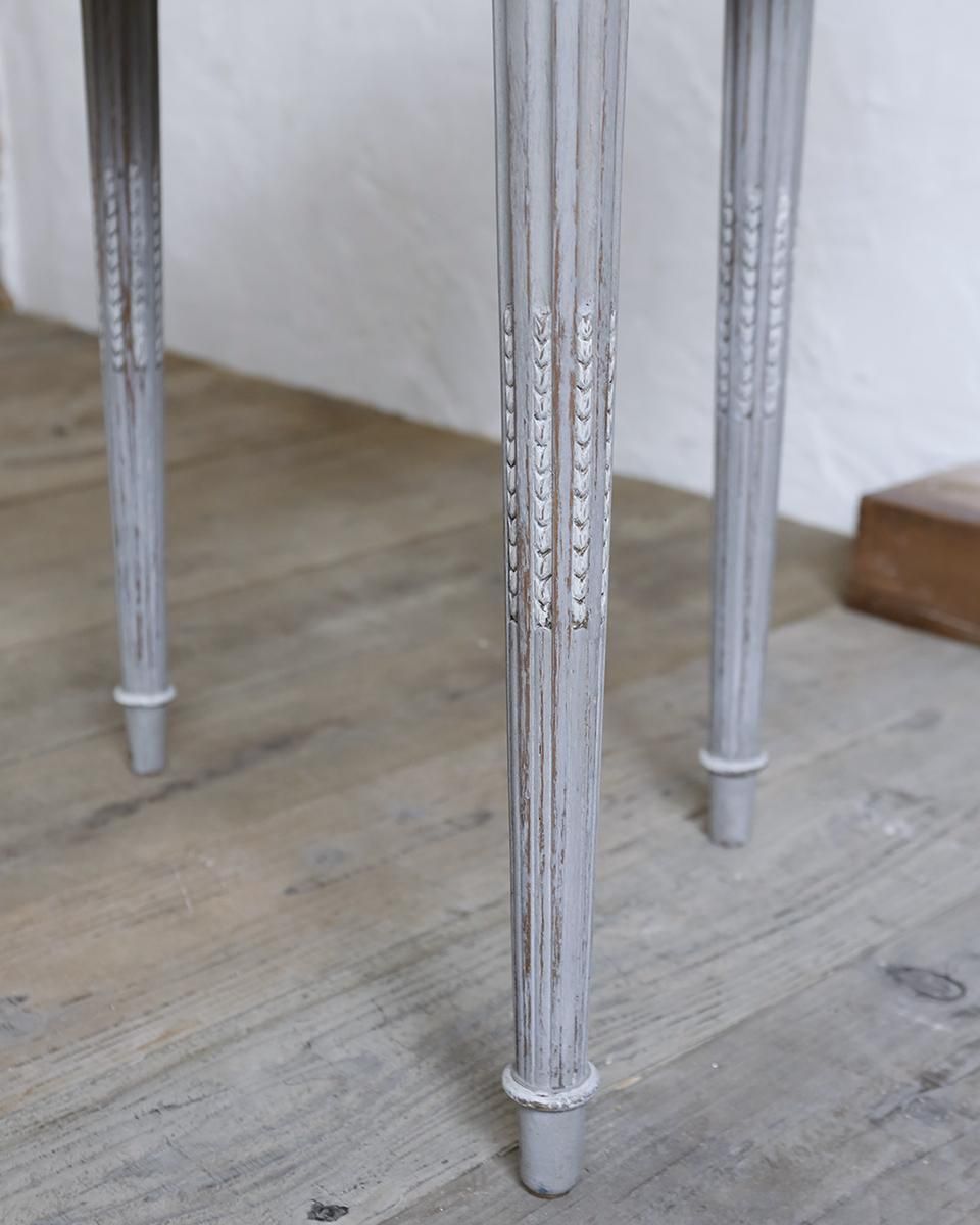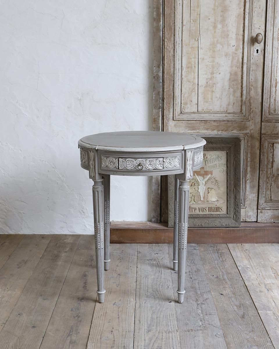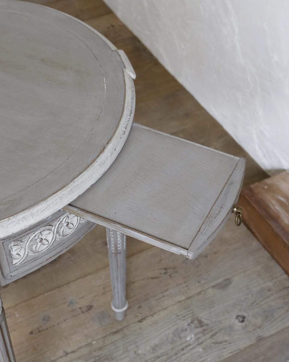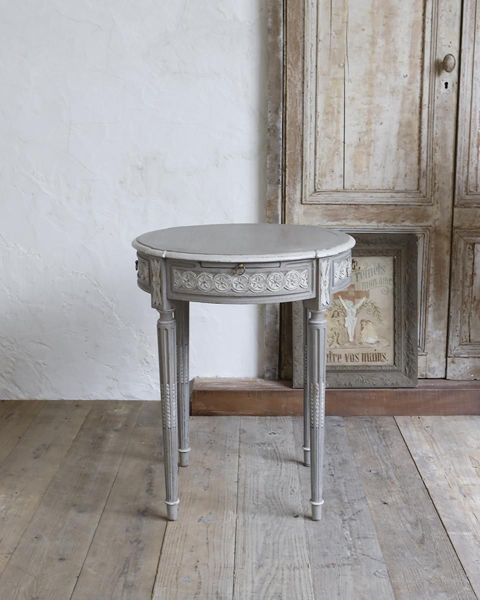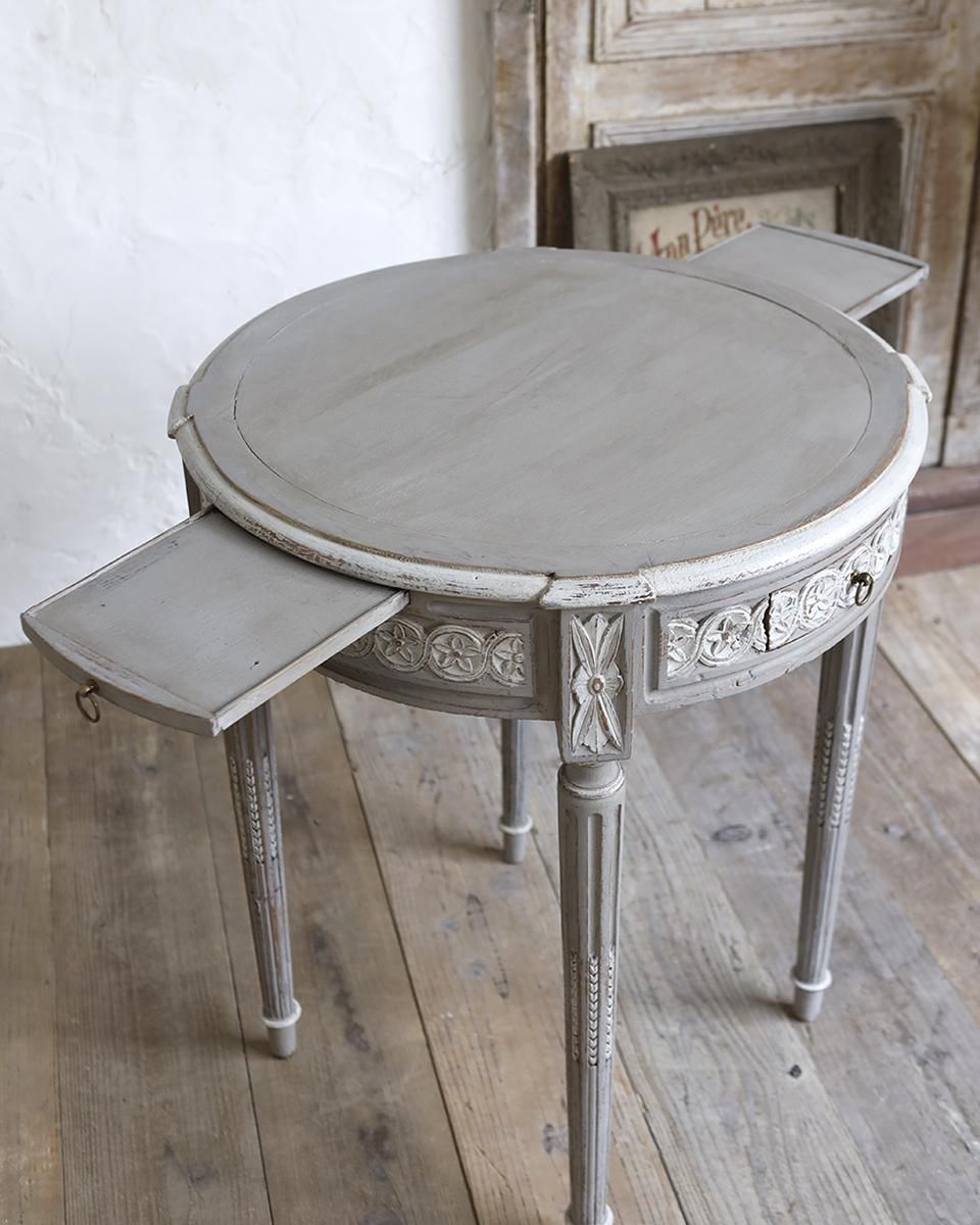 円形の幕板には二杯の抽き出しとスライド式の天板が配され、