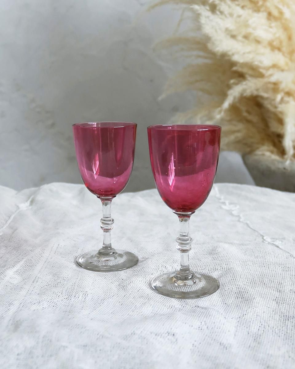 クランベリーカラーの美しいグラスは、光の当たり方や