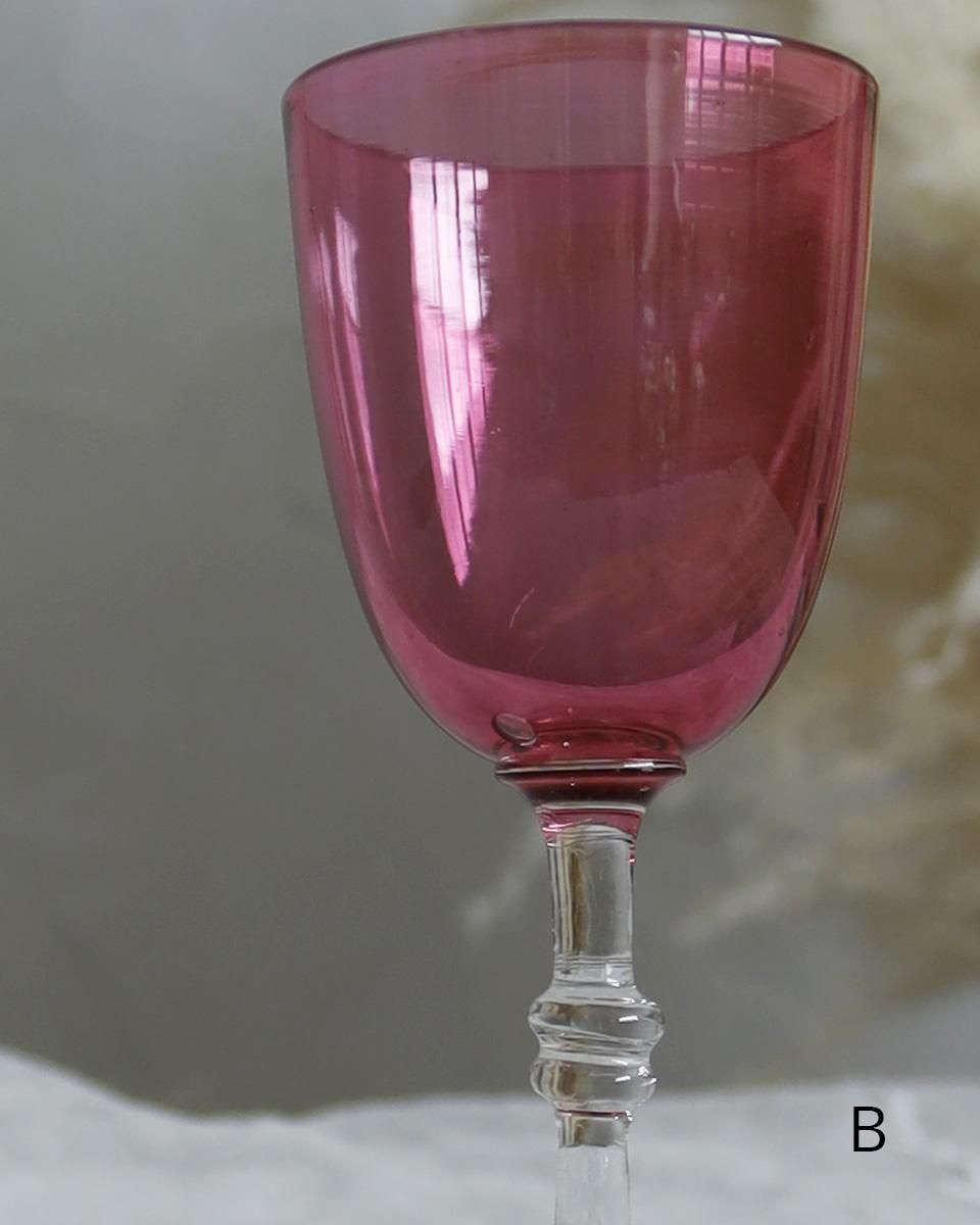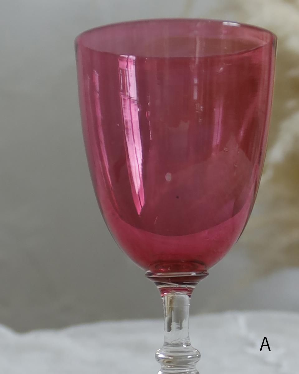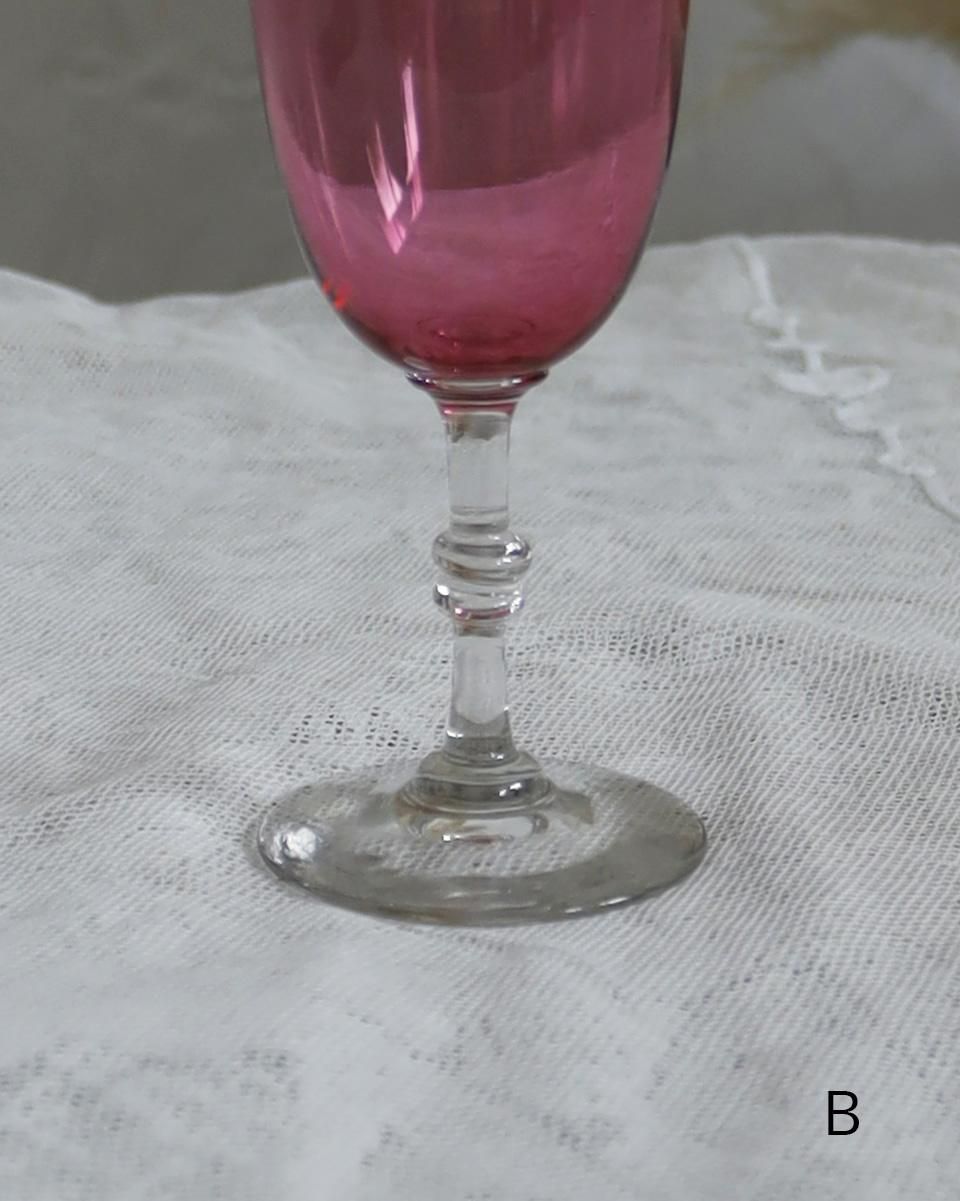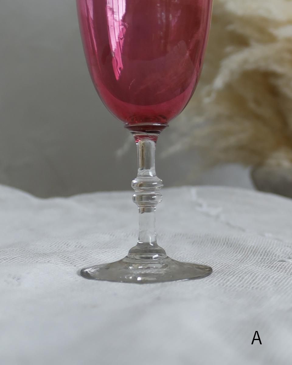 クランベリーカラーのカップにクリアなステムとベースが美しい