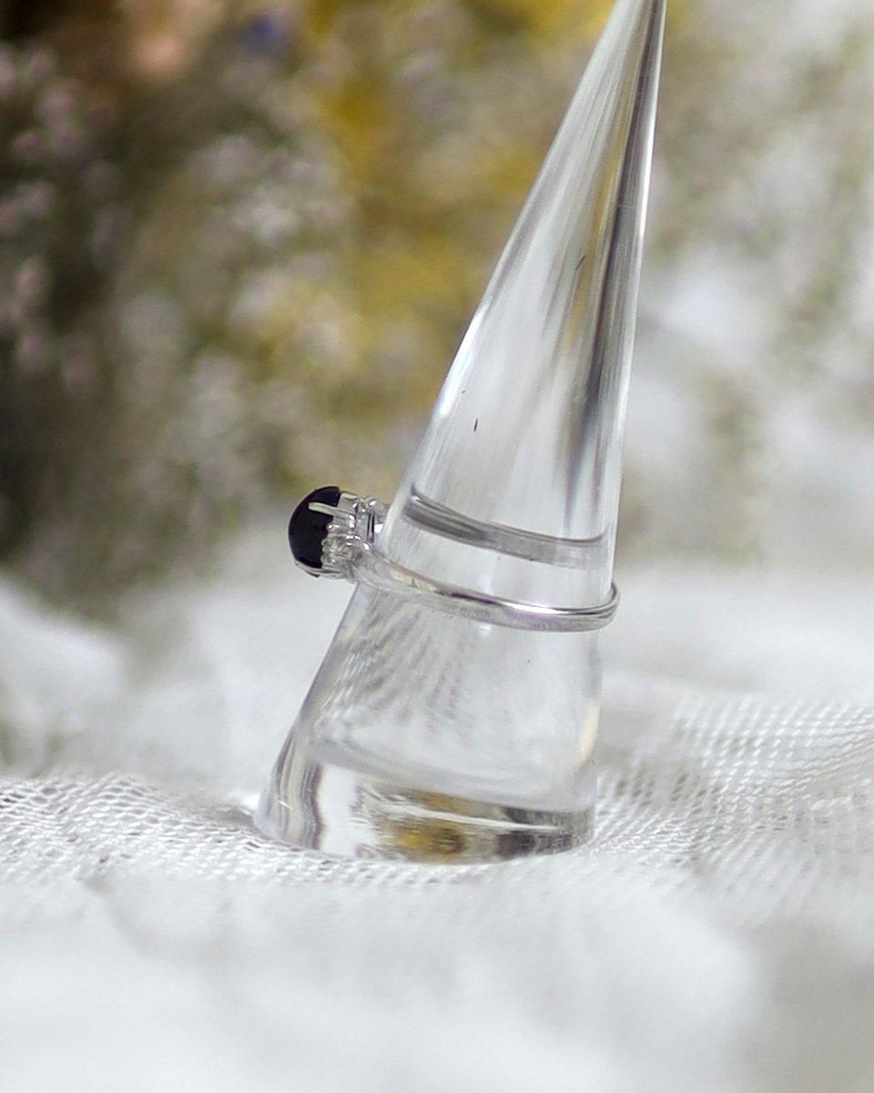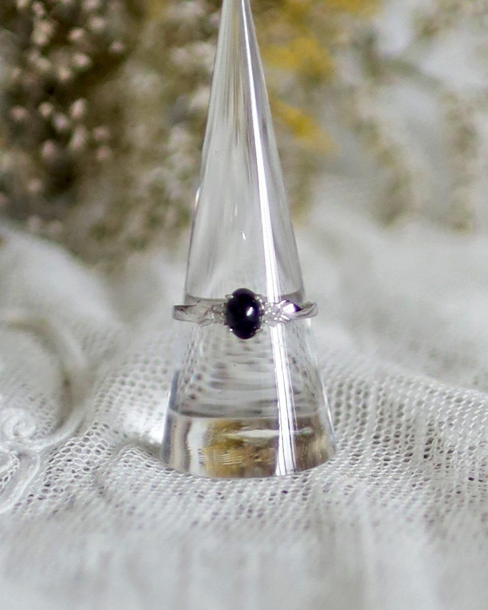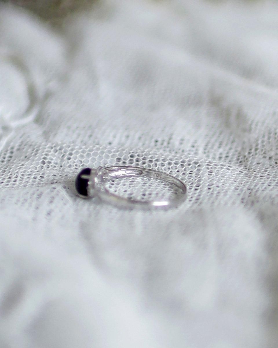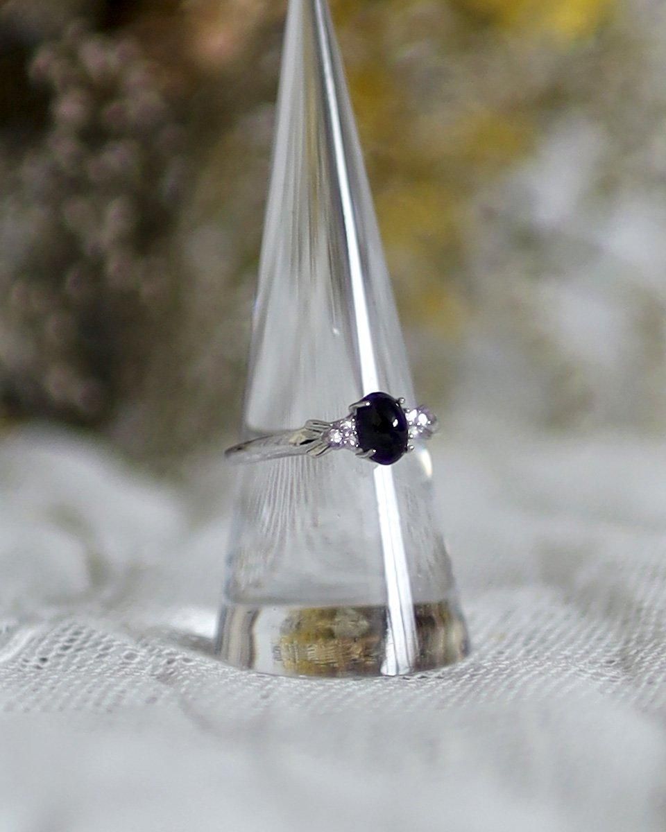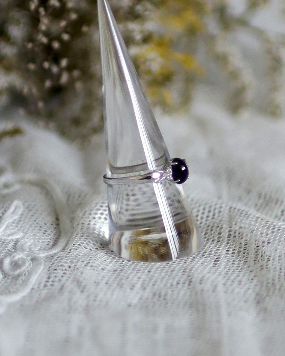 細めのシルバーのリングに、サファイアのような