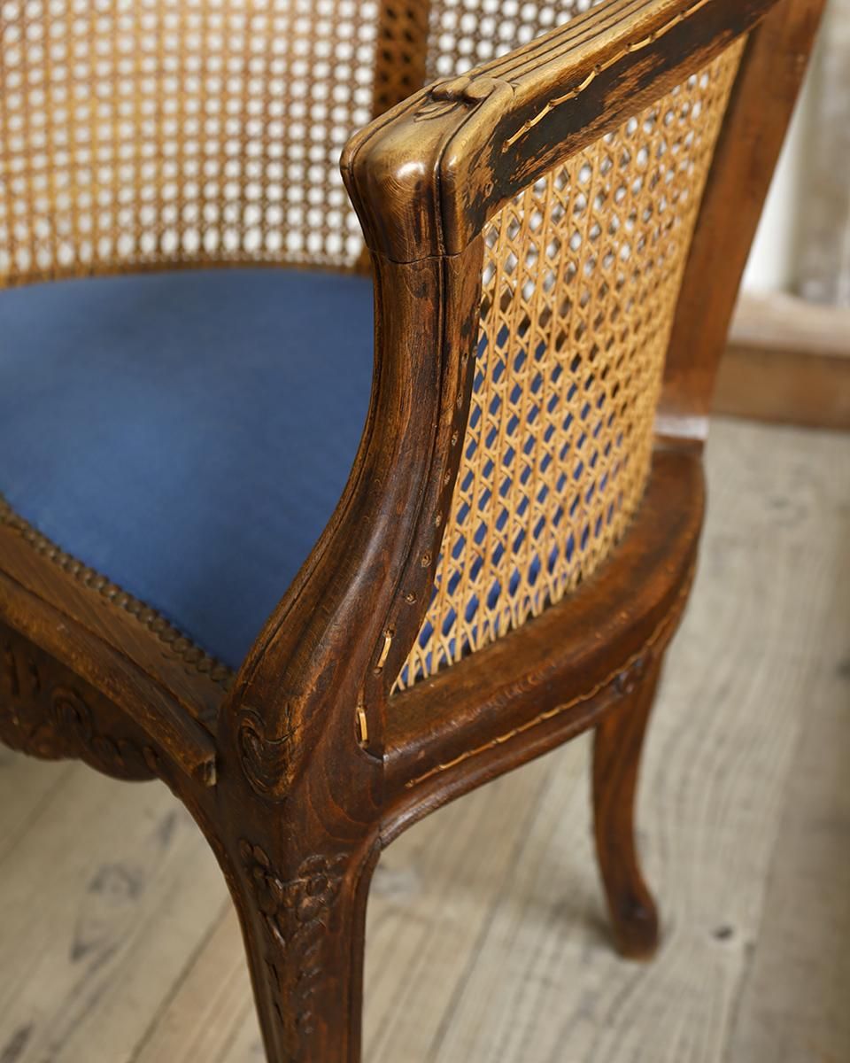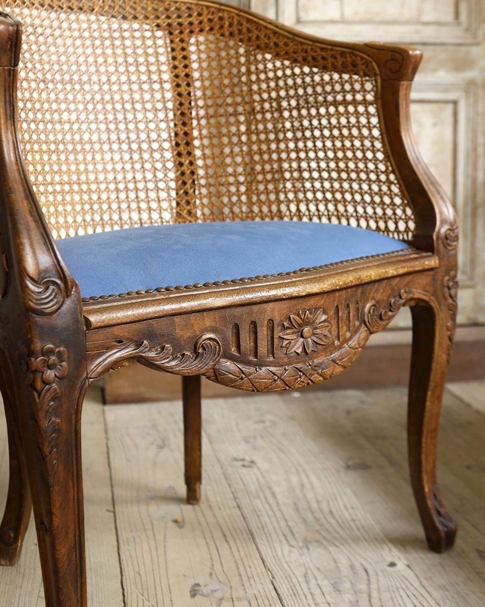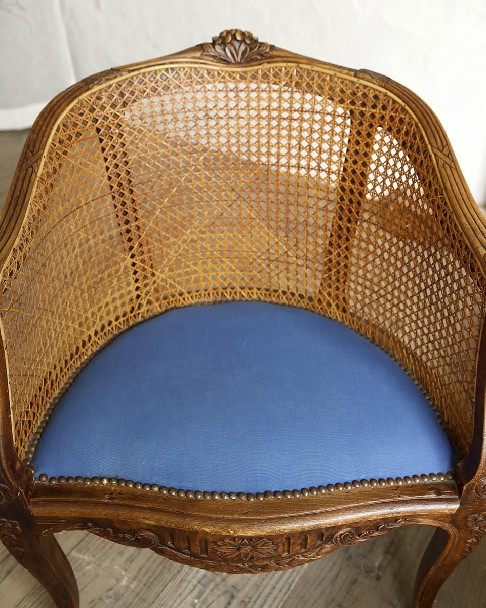 印象が引き立つお花と植物のモチーフ、座面の青いファブリック