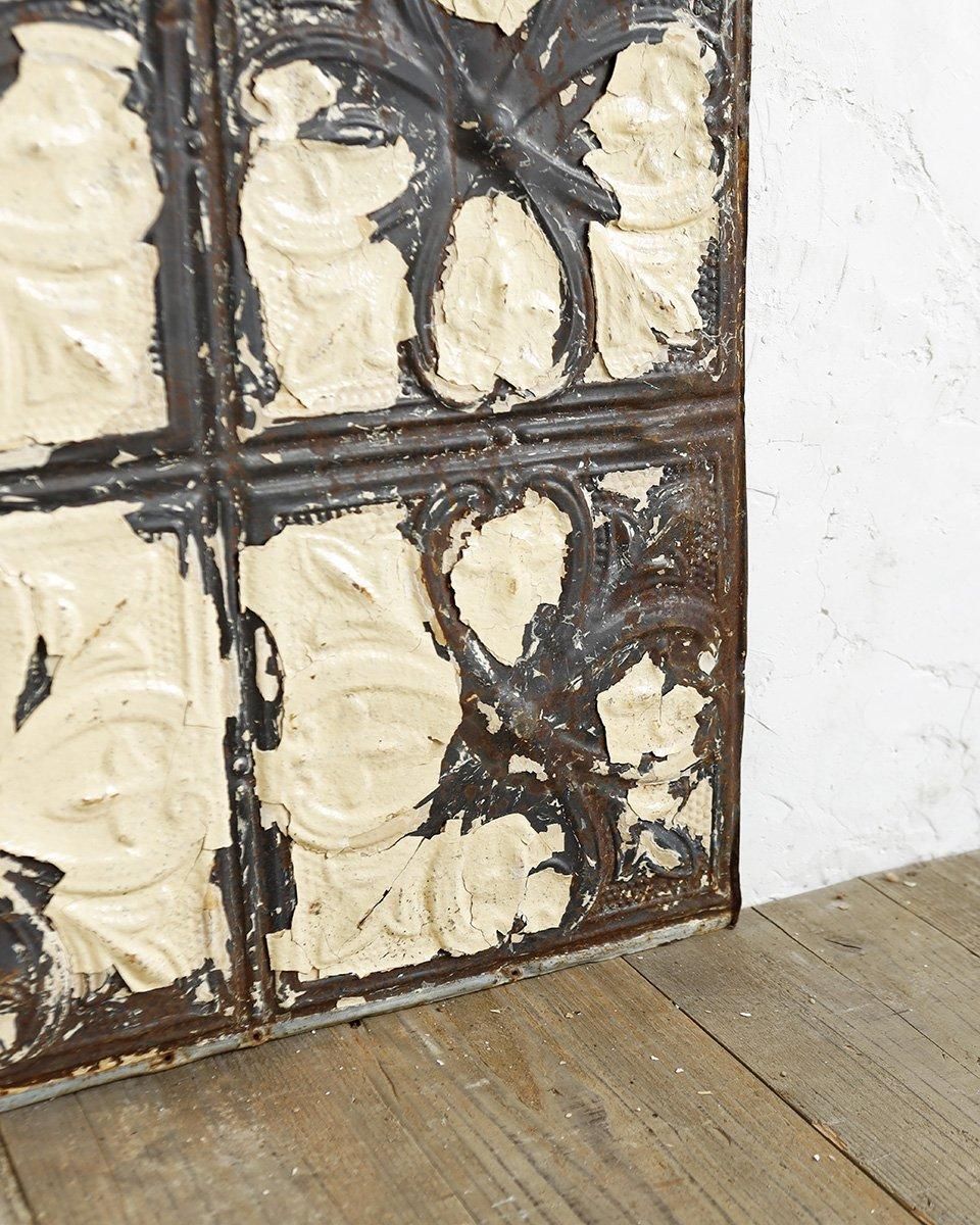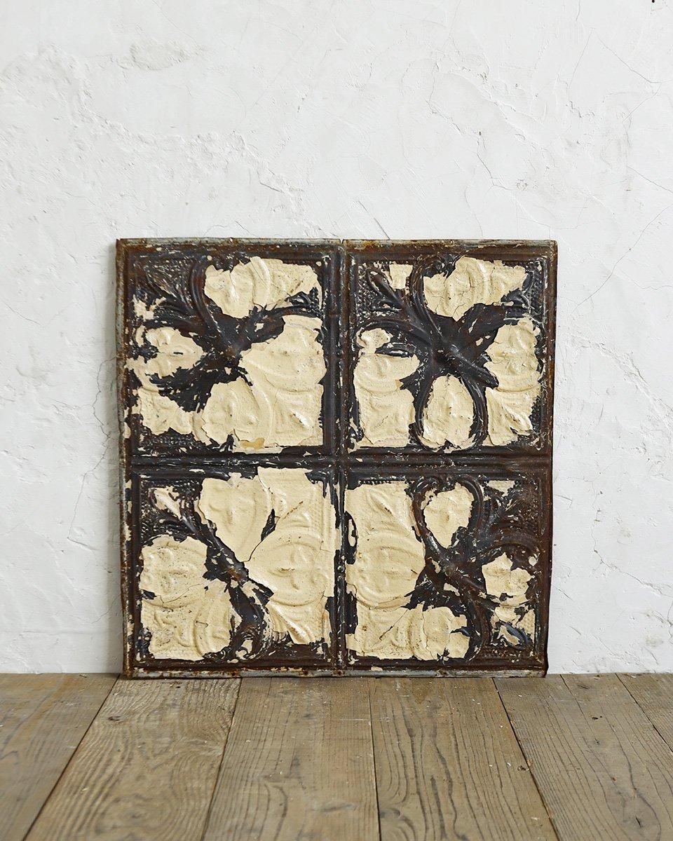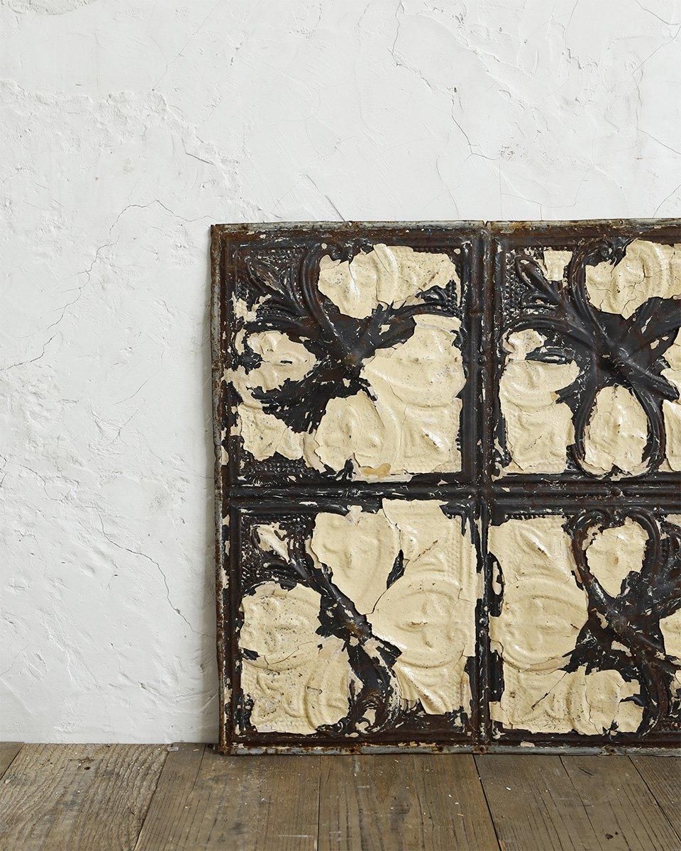 ペイントが施されたブリキ製のパネルに、美しい型押し