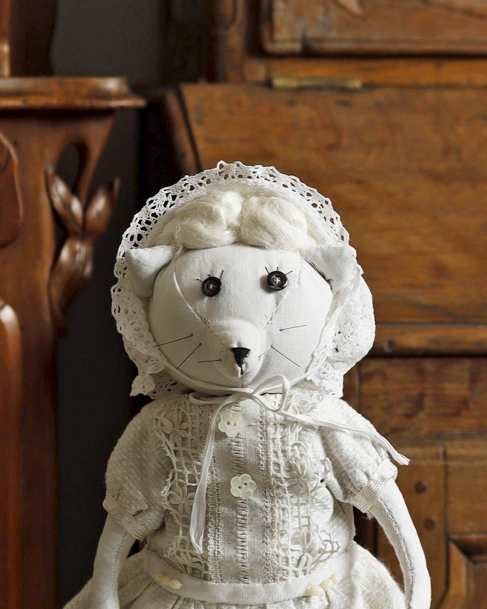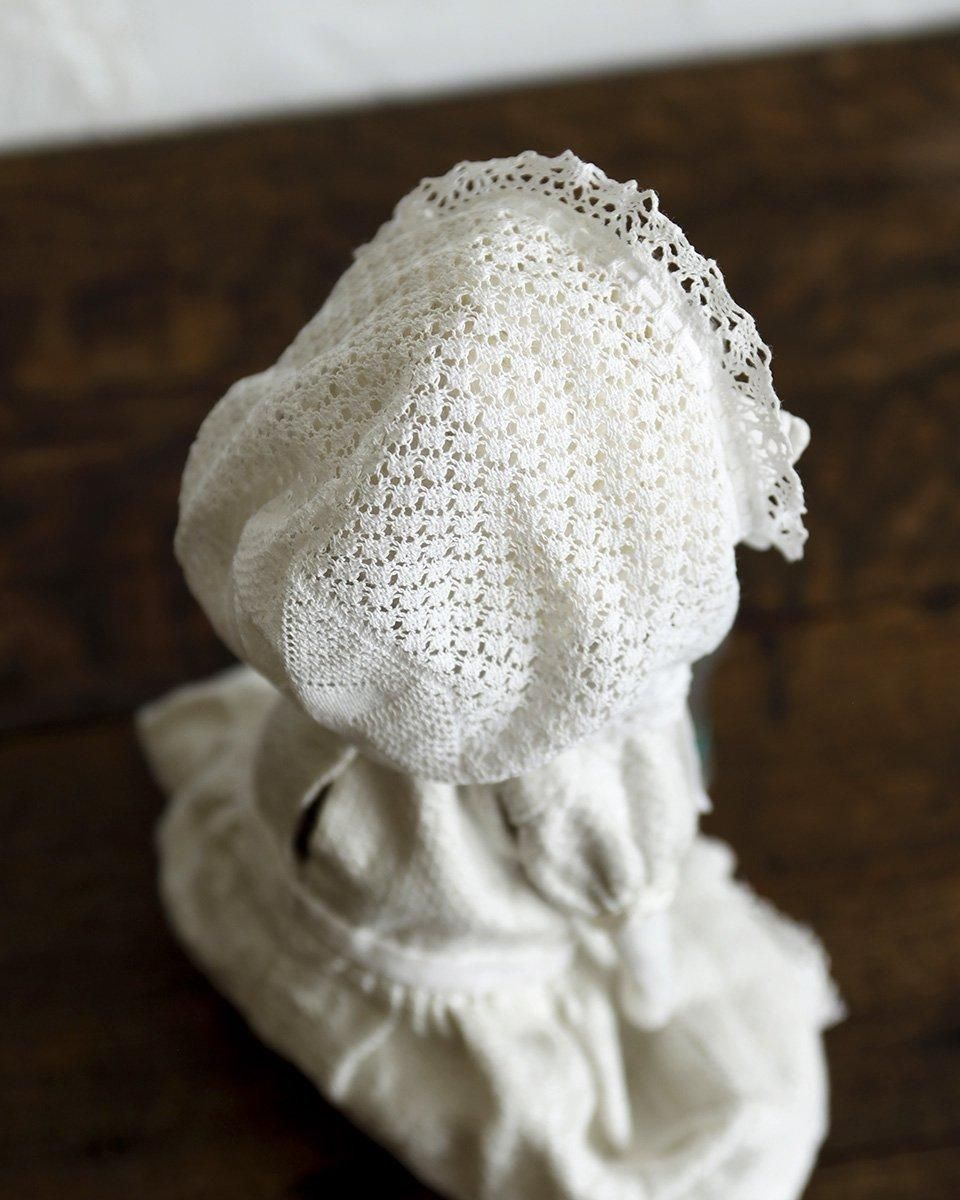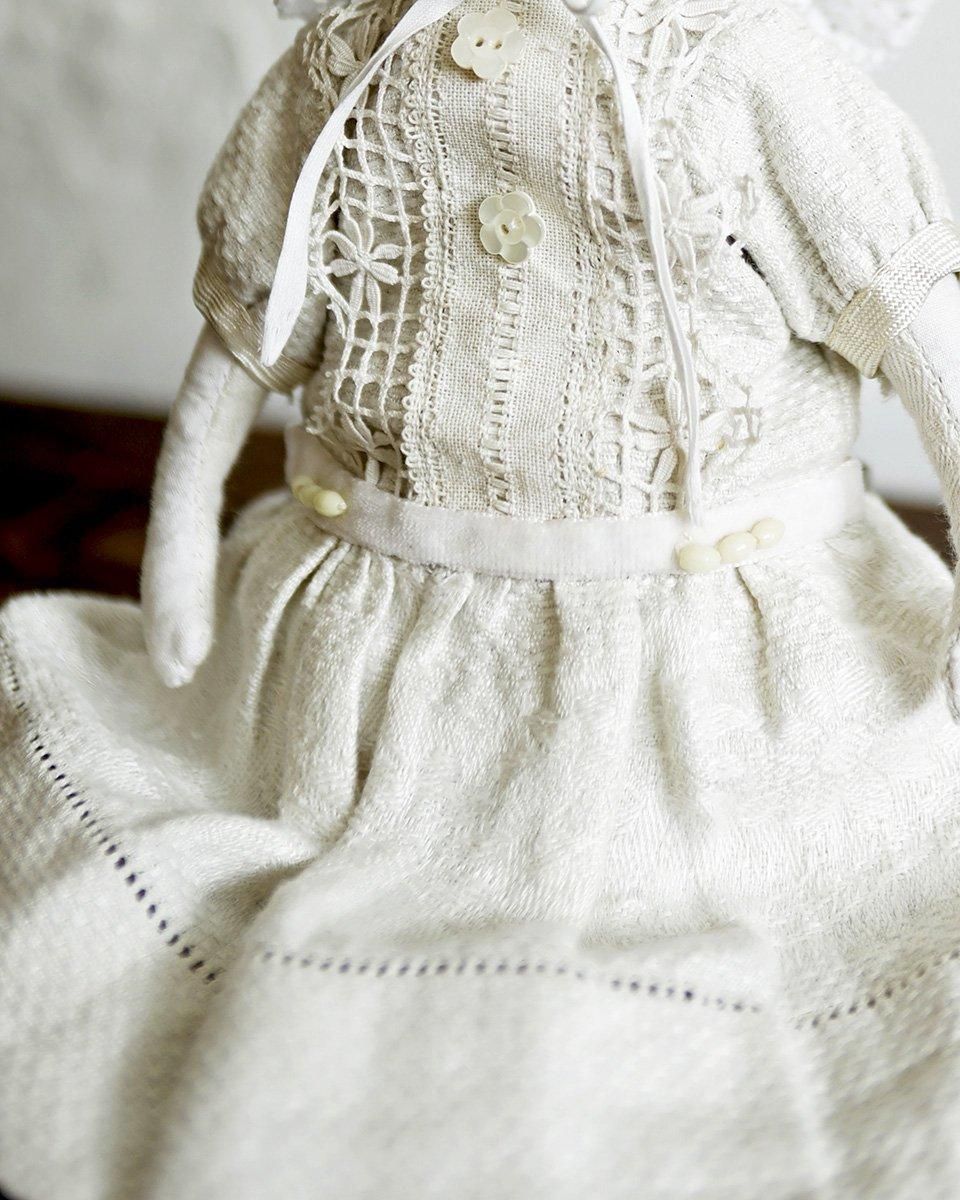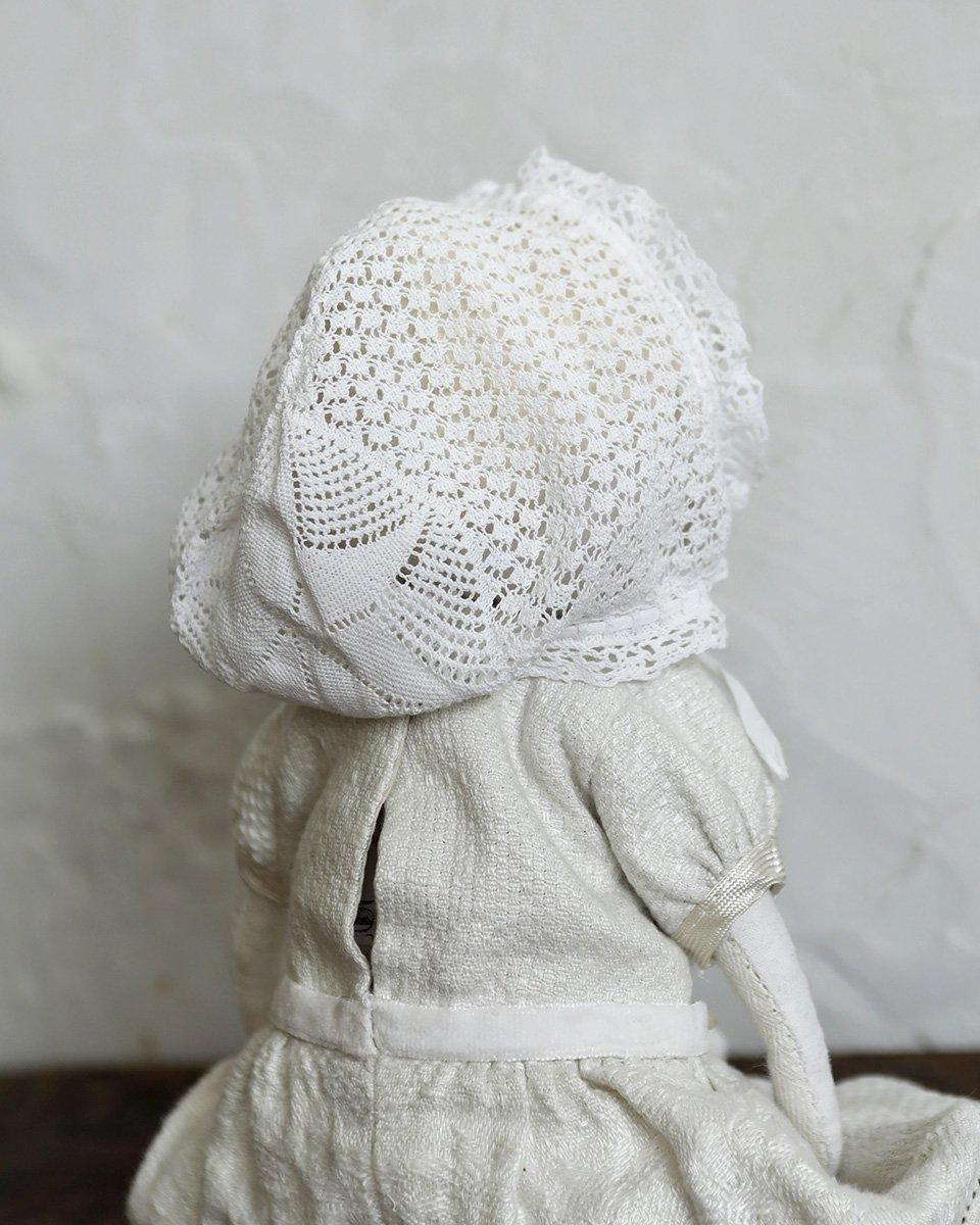素材には古いアンティークのリネンやレース、小さなボタンに