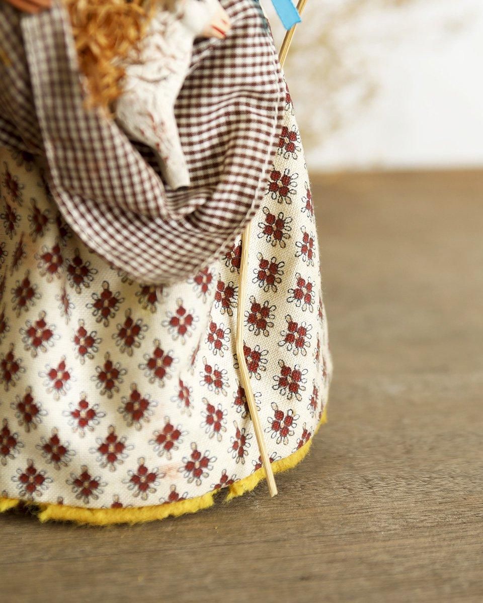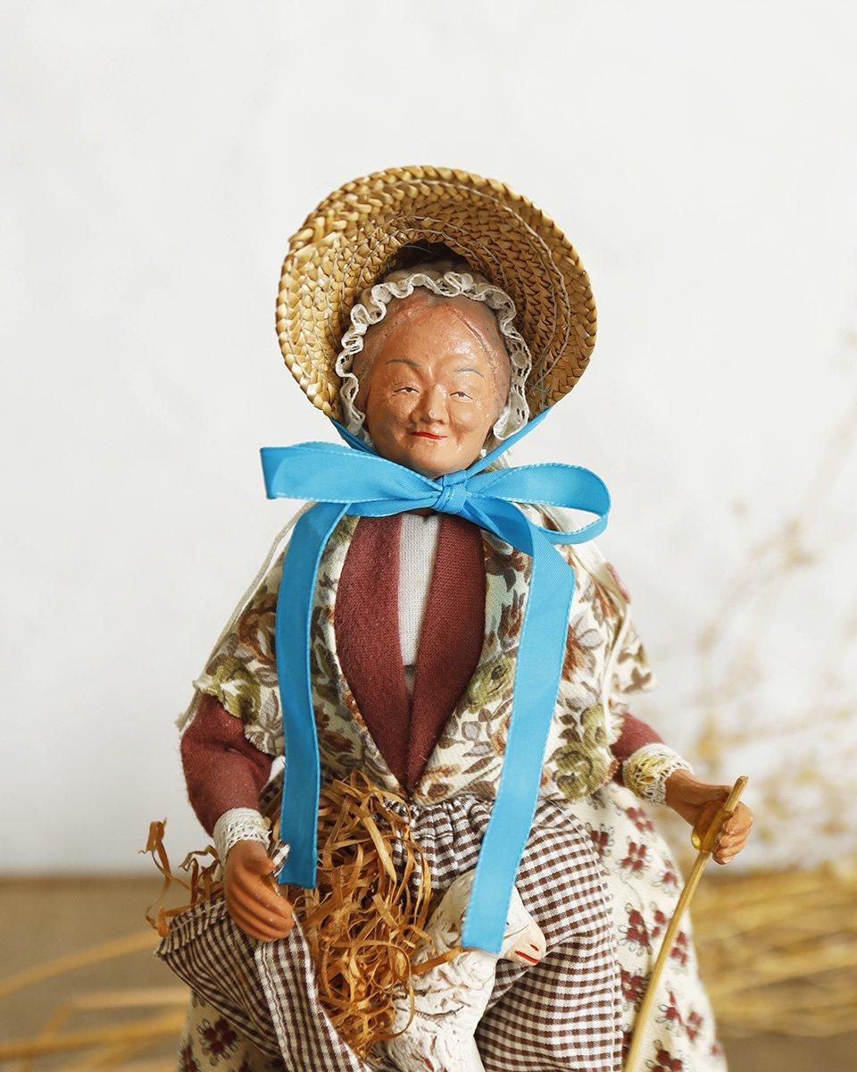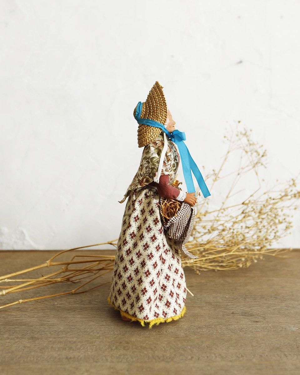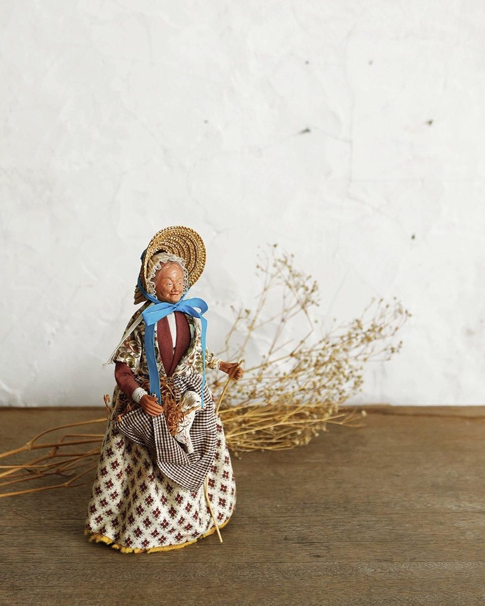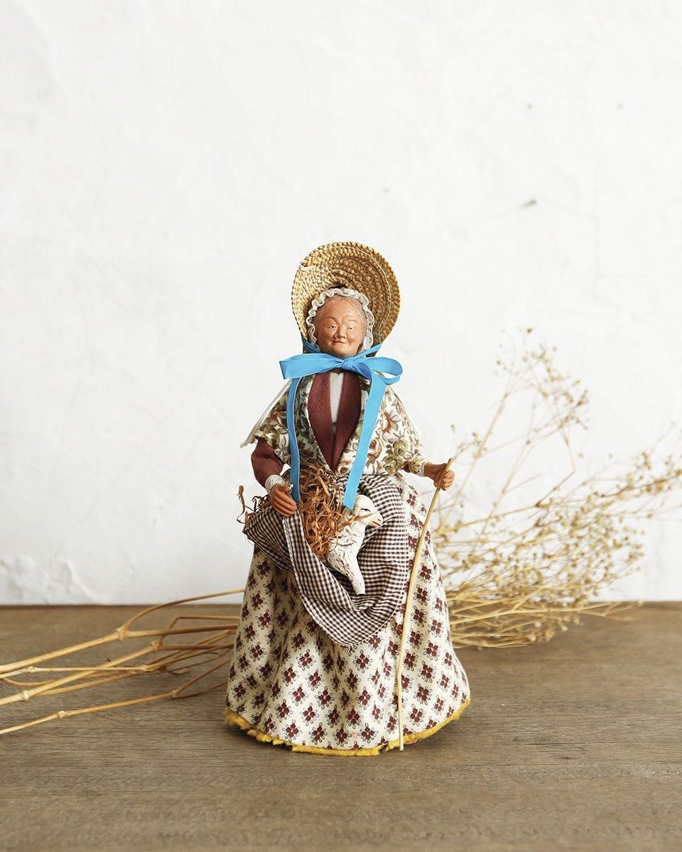 小羊を抱えたおばあさんの人形で、素朴な味わいに