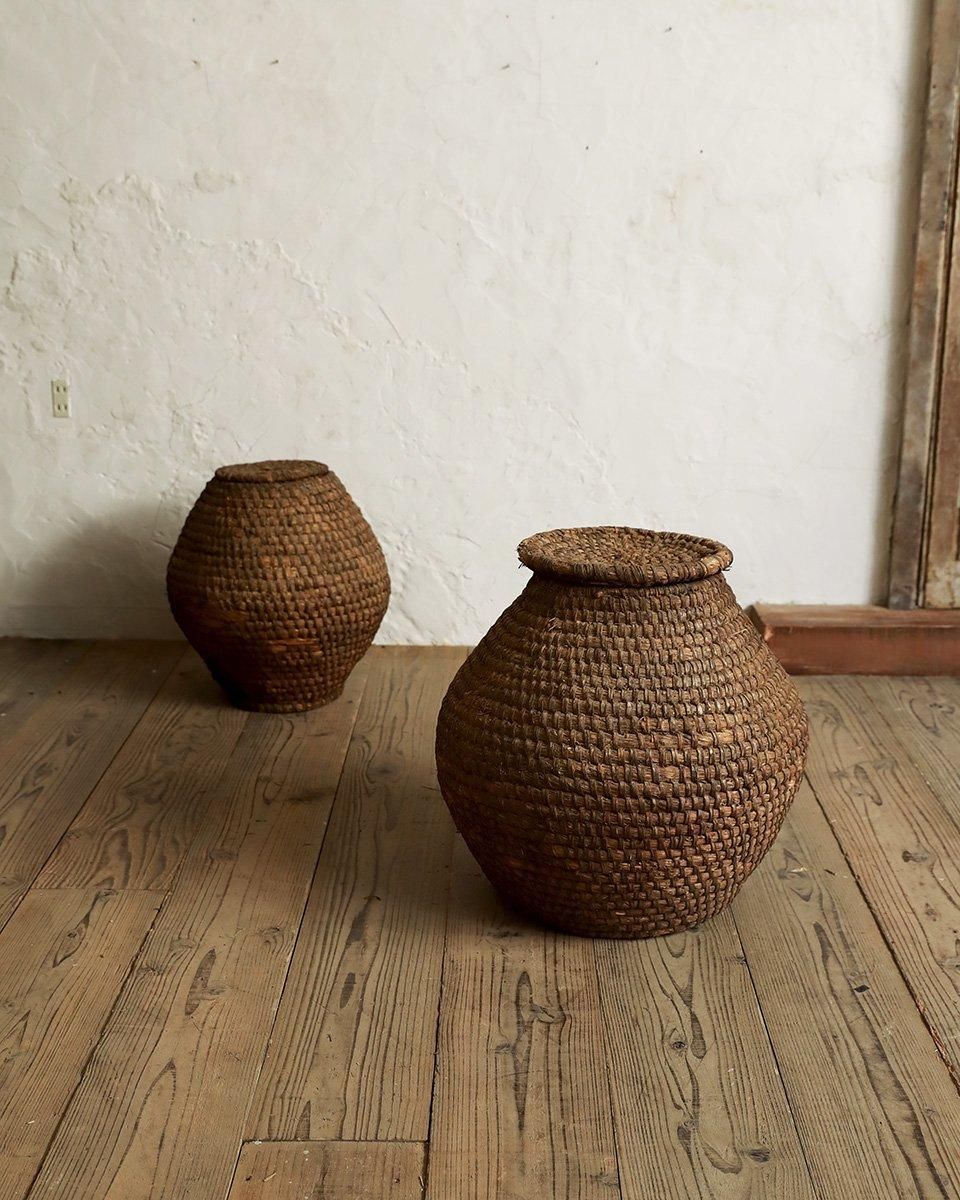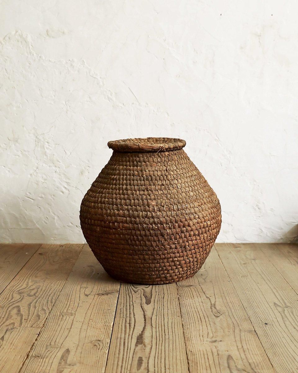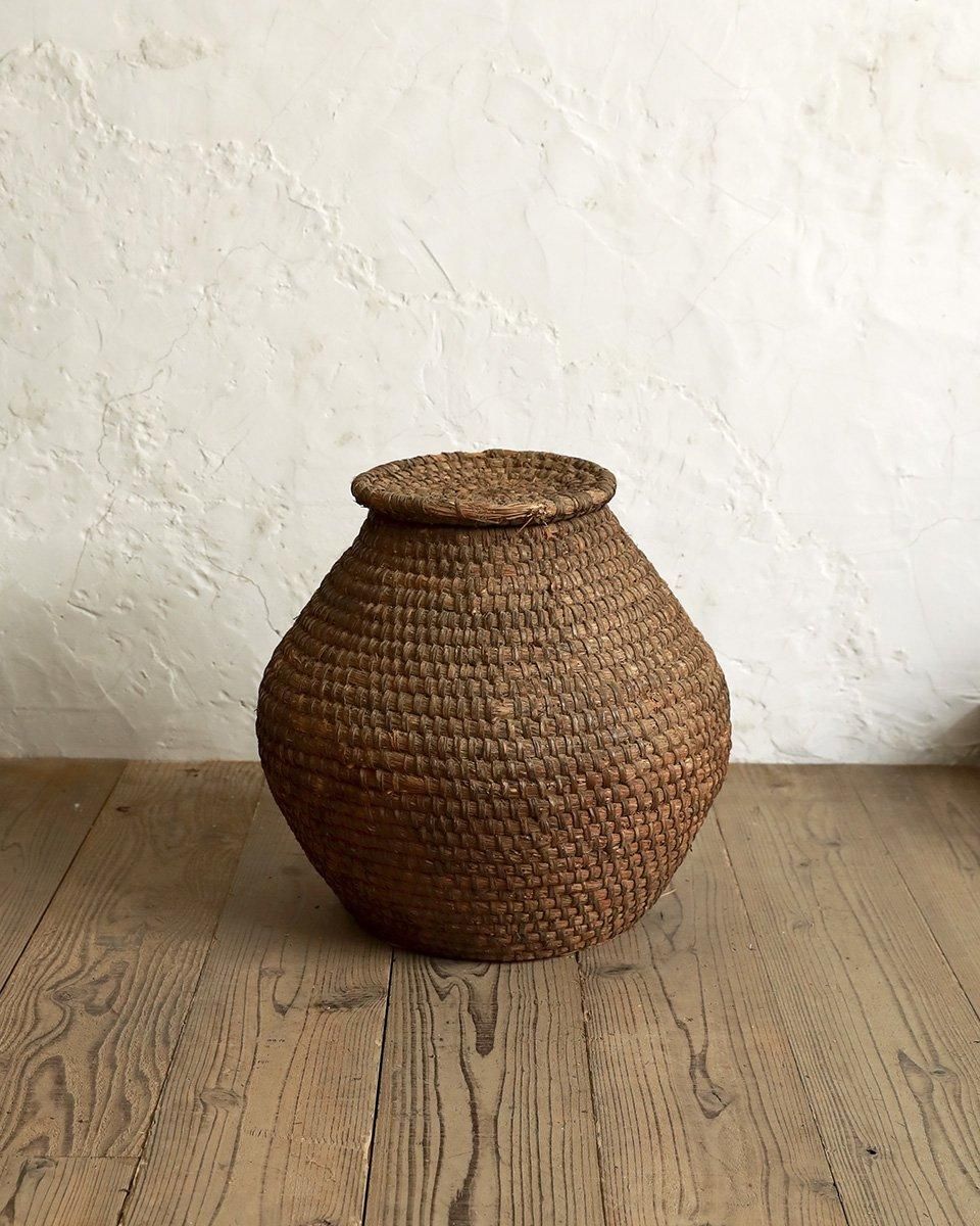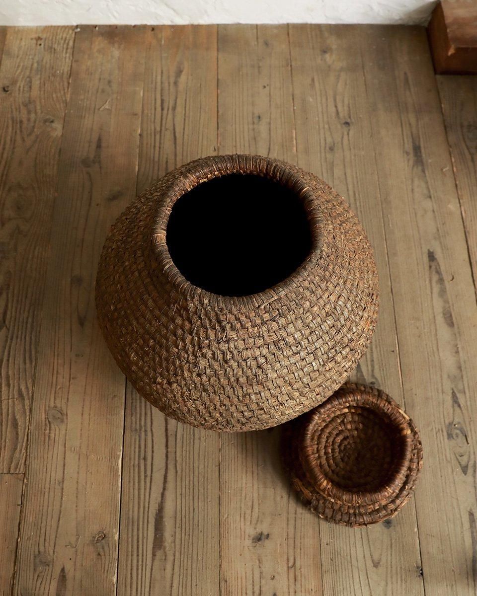バスケットで、丁寧に手作業で編み込まれた籐と藁の