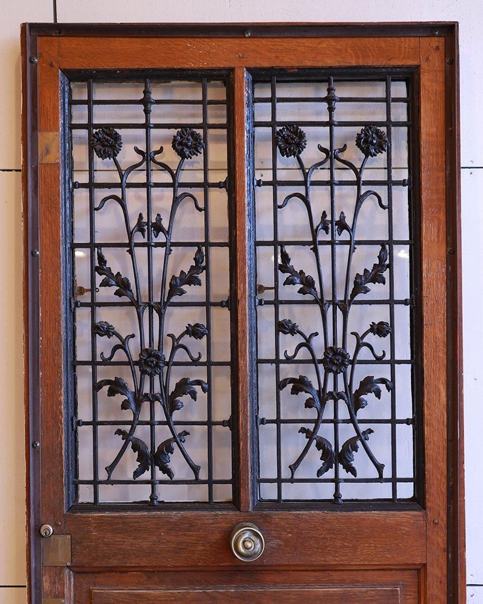 ガラス窓に嵌め込まれたお花モチーフのアイアンパネルとの