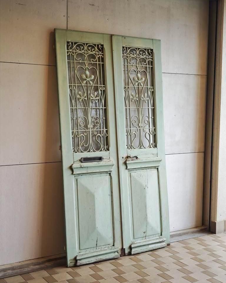 From : France フランスにて買い付けた淡いパステルグリーンが 目を惹くアイアンダブルドアです。 ドアに付属している金物はアンティークのため 使用不可となりますので、飾りとしてお考え下さい。 所々、木割れや欠け、削れ箇所などがございます。 恐れ入りますが、予めご了承くださいませ。 アンティーク品のため実用いただくには加工が必要です。 お近くの木材加工業者もしくは大工さんにご確認のうえ、 ご注文くださいませ。